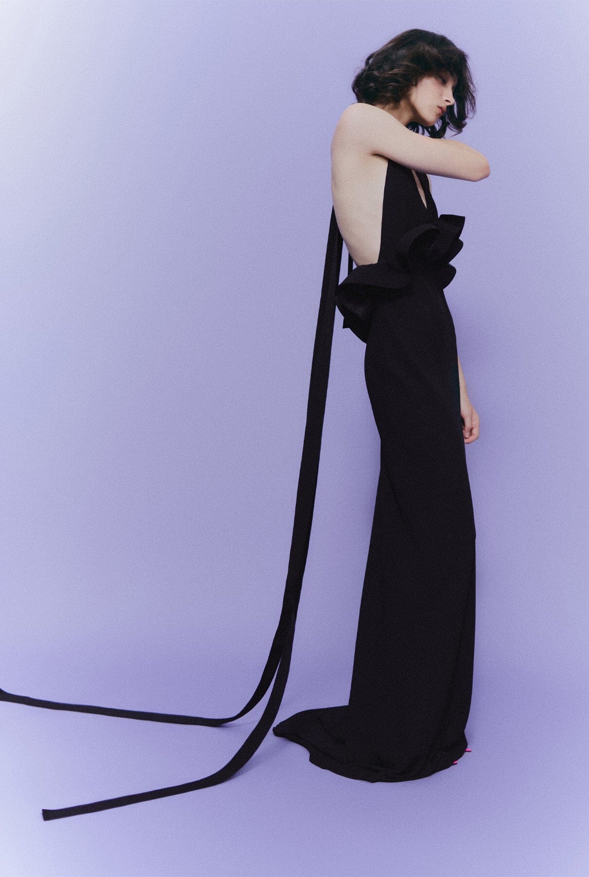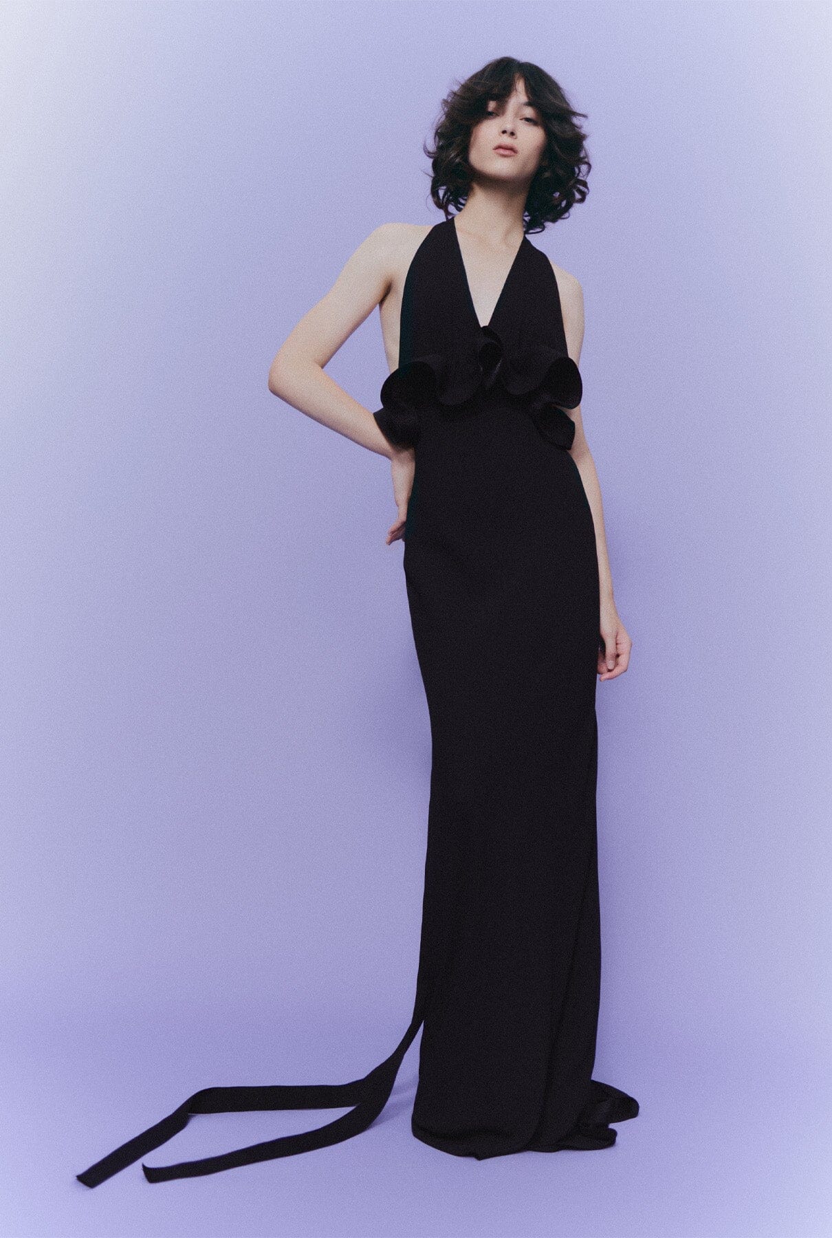 VESTIDO DE LENCERÍA CON CORTE BAIS, CINTURA ALTA, ESCOTE HALTER Y ESPALDA DESCUBIERTA. ESPECTACULAR DECORACIÓN DE VOLANTES EN LA CINTURA.