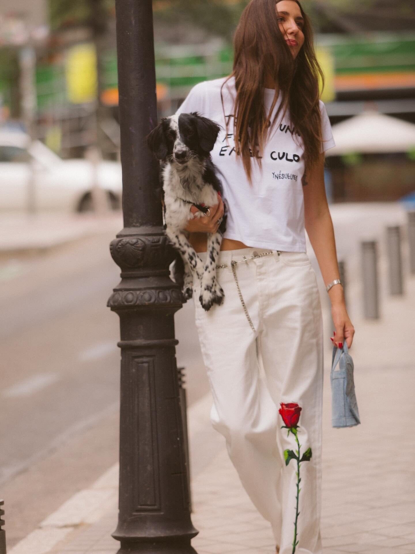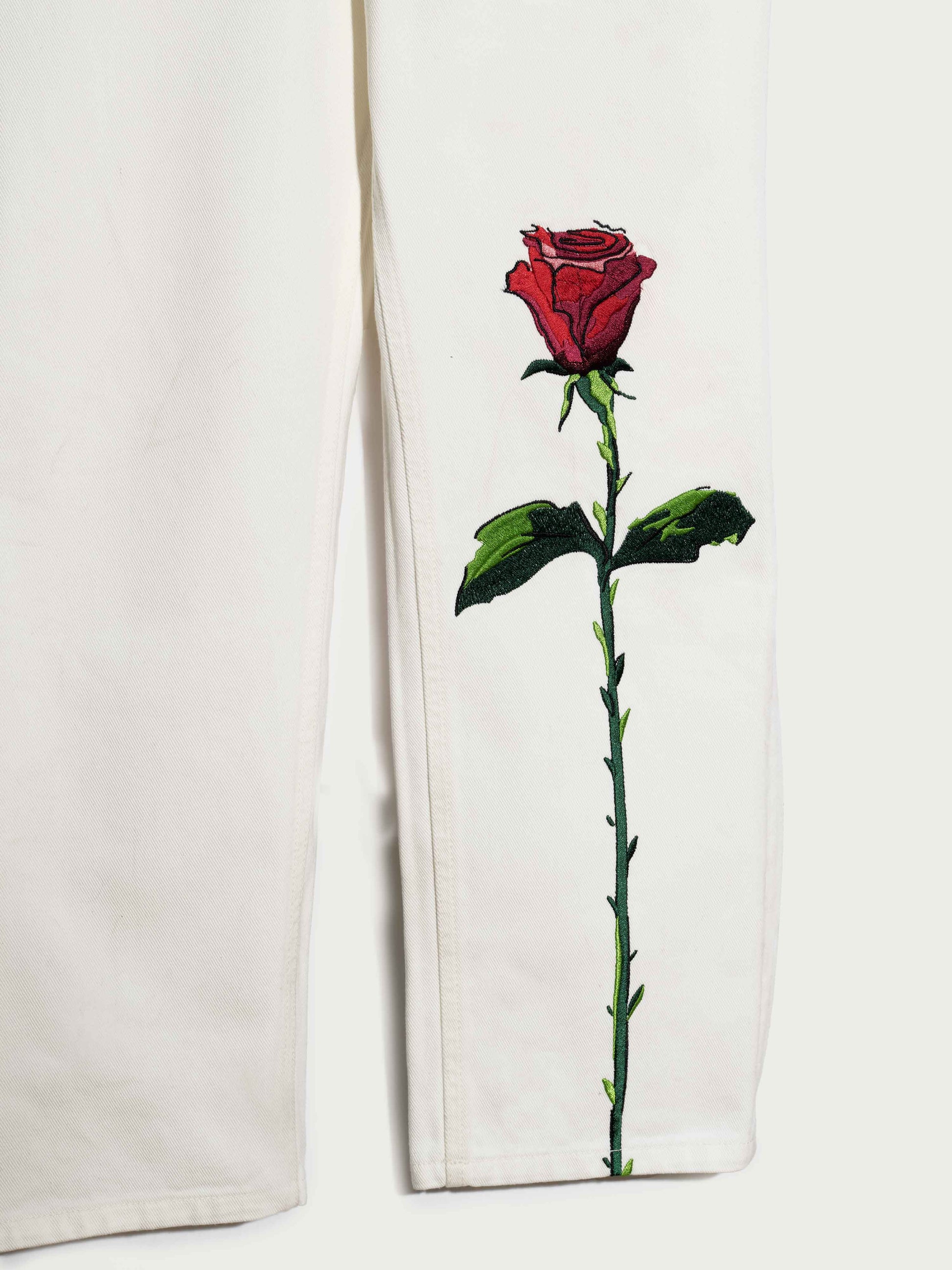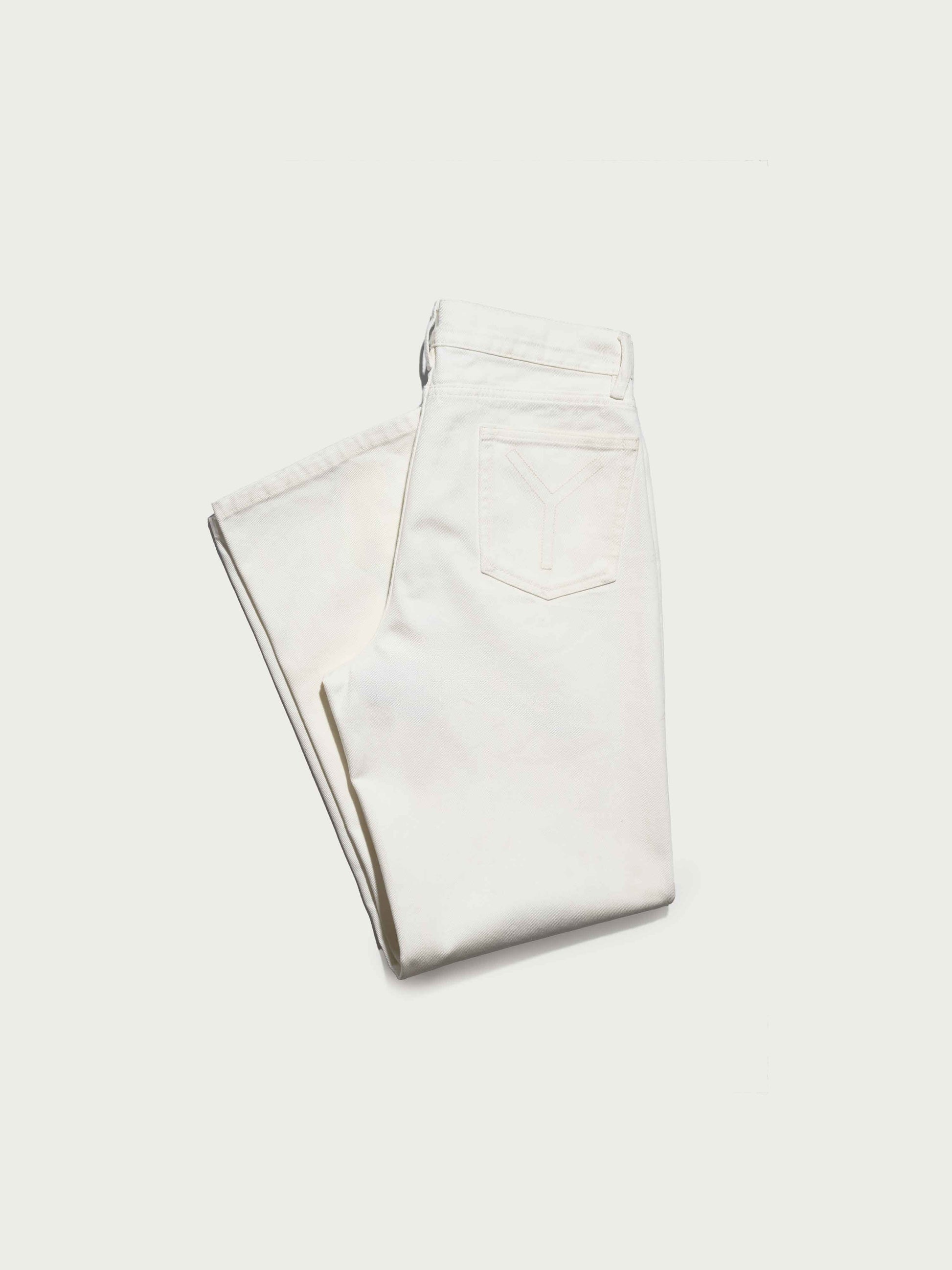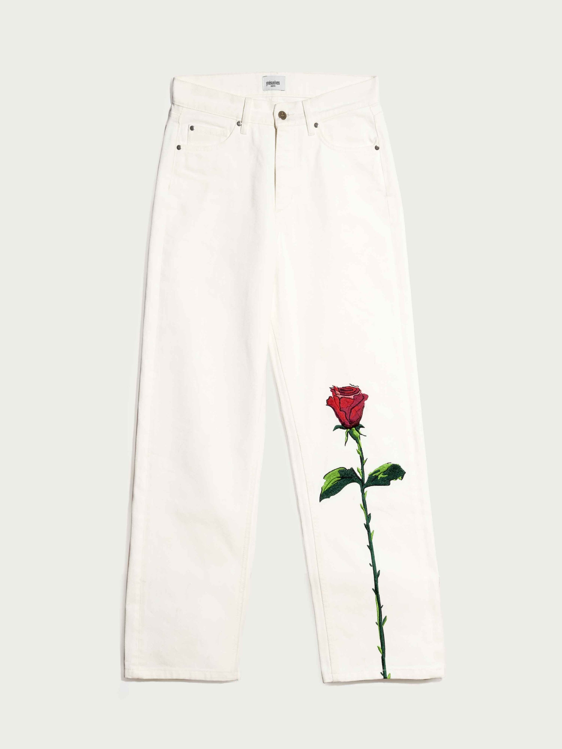 Tiro medio, corte recto y holgado. Lavado blanco. Bordado del logotipo de la rosa de Ynésuelves en la parte delantera de la pierna izquierda. Cierre con botones metálicos.