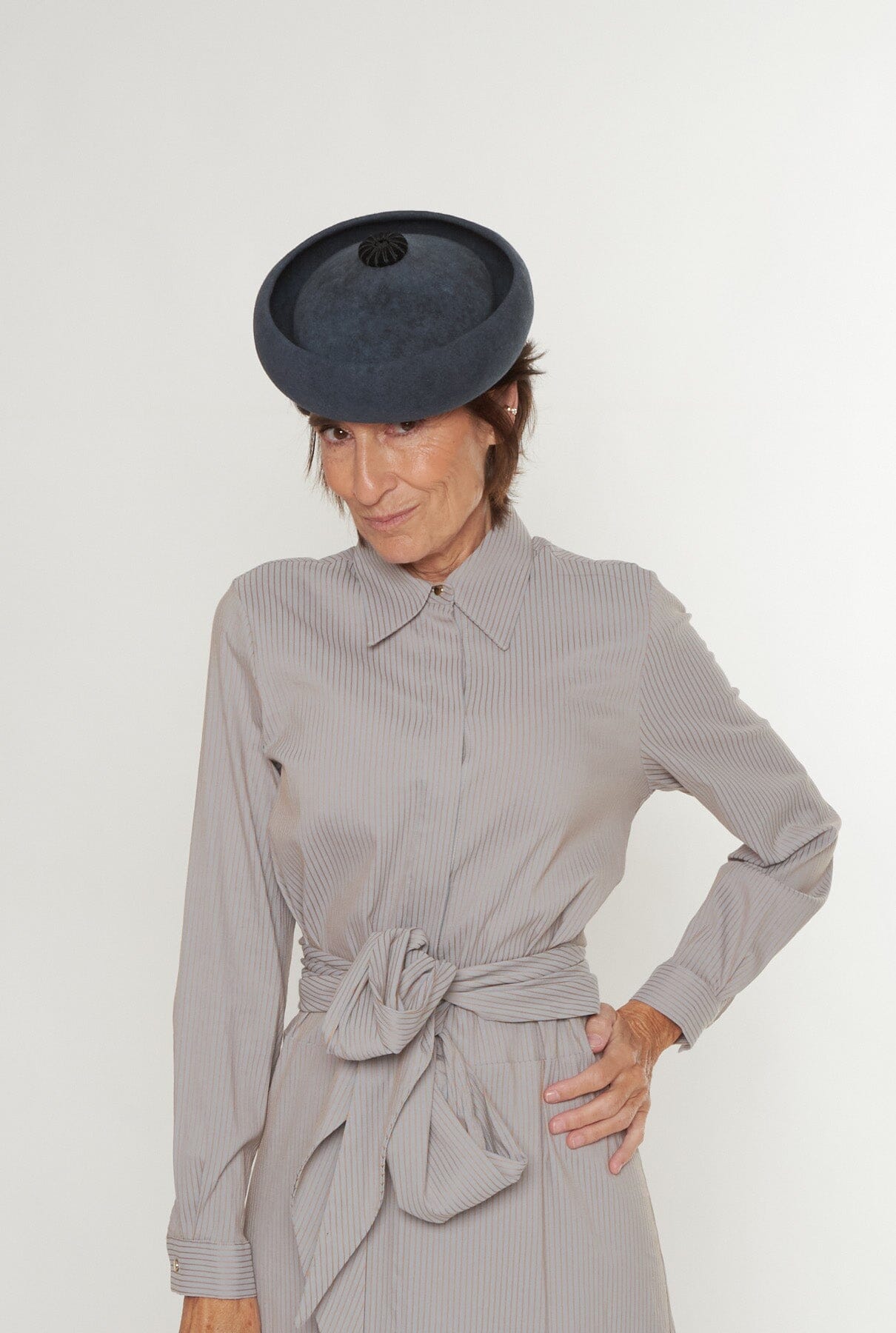 Tocado de fieltro de pelo efecto óxido de color azul empolvado. Inspirado en el sombrero Calañés, con botón de terciopelo negro.