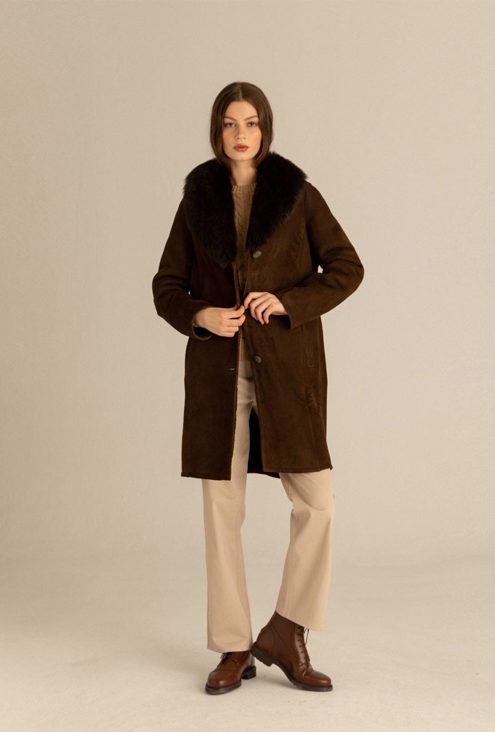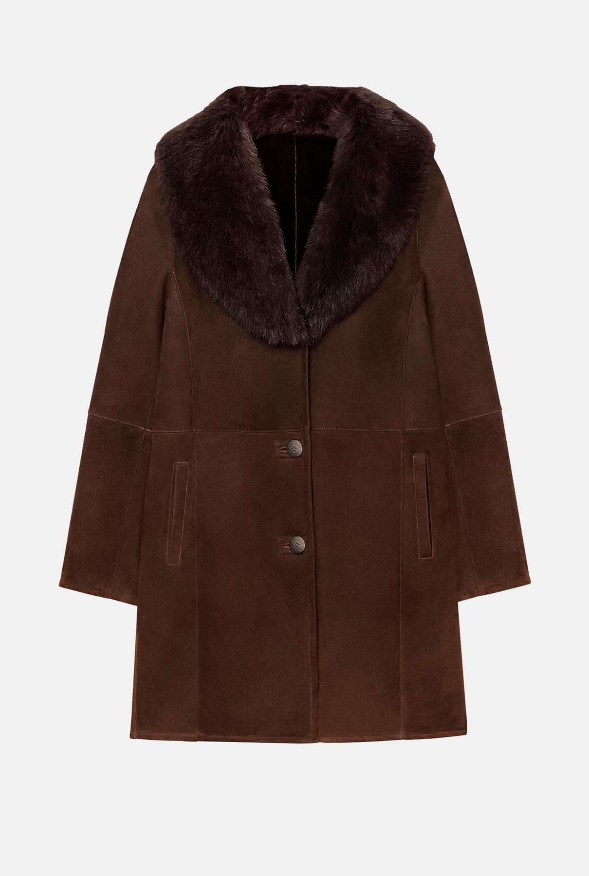 Abrigo pitillo de piel de cordero marrón. Diseñado por Kolonaki.