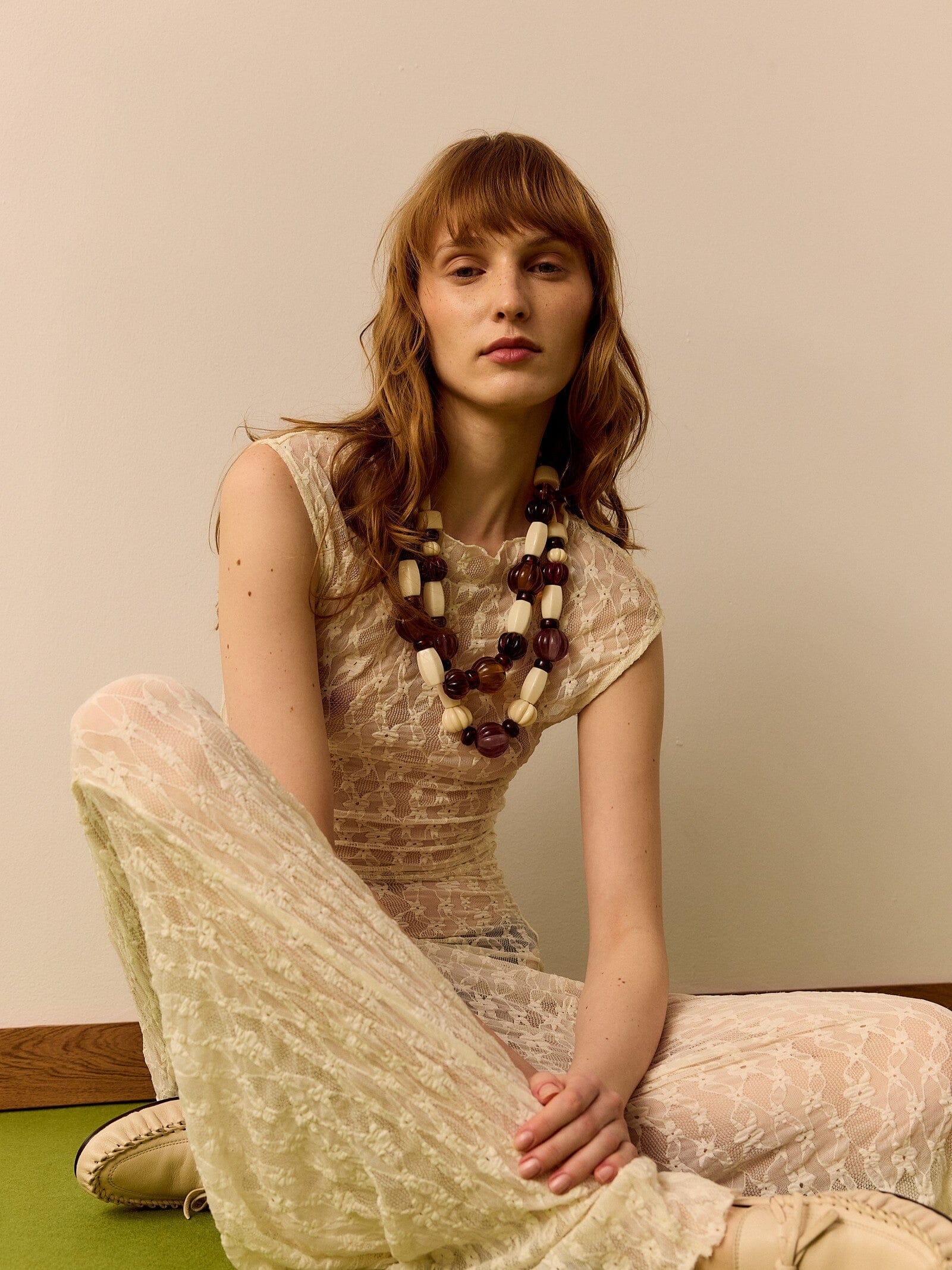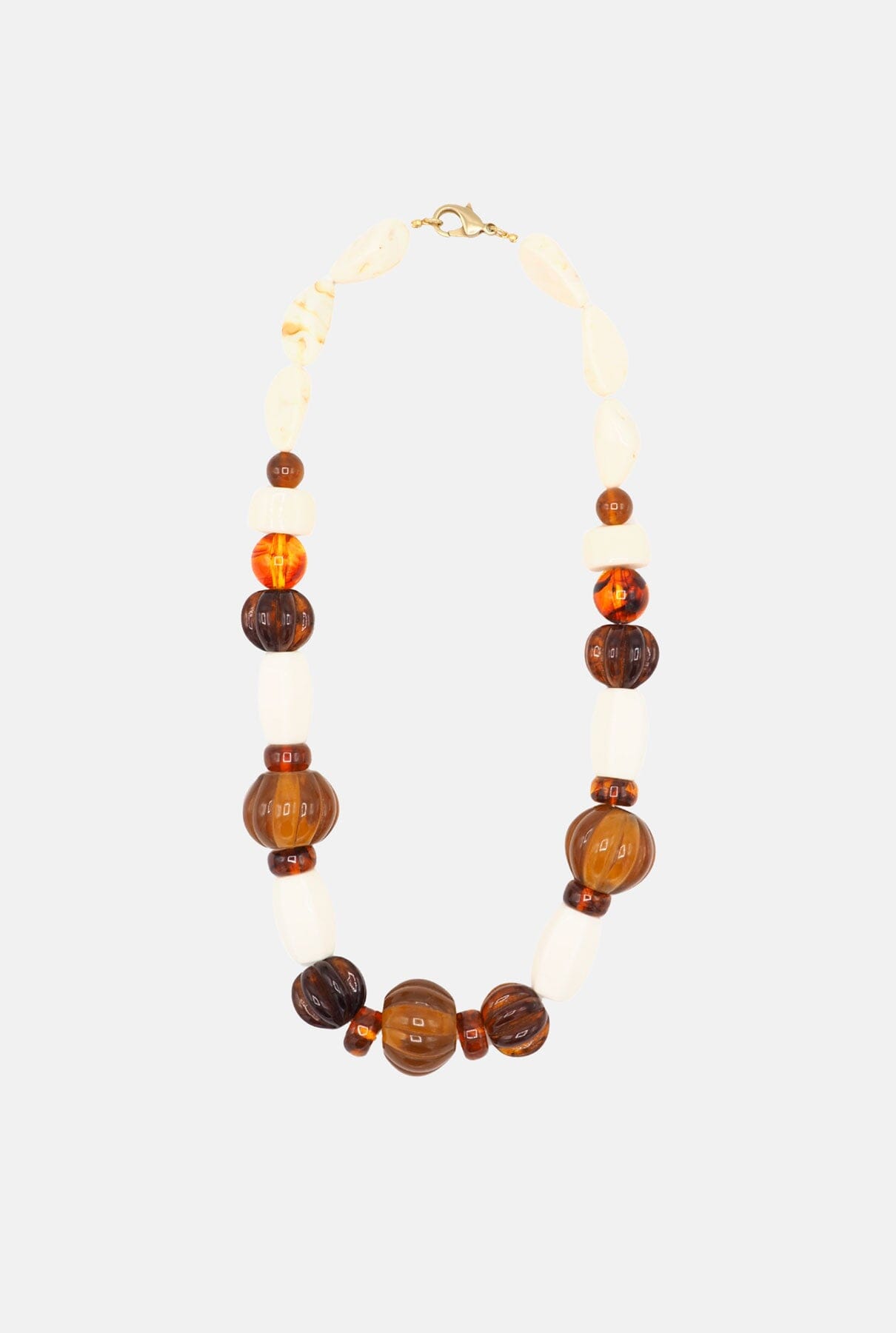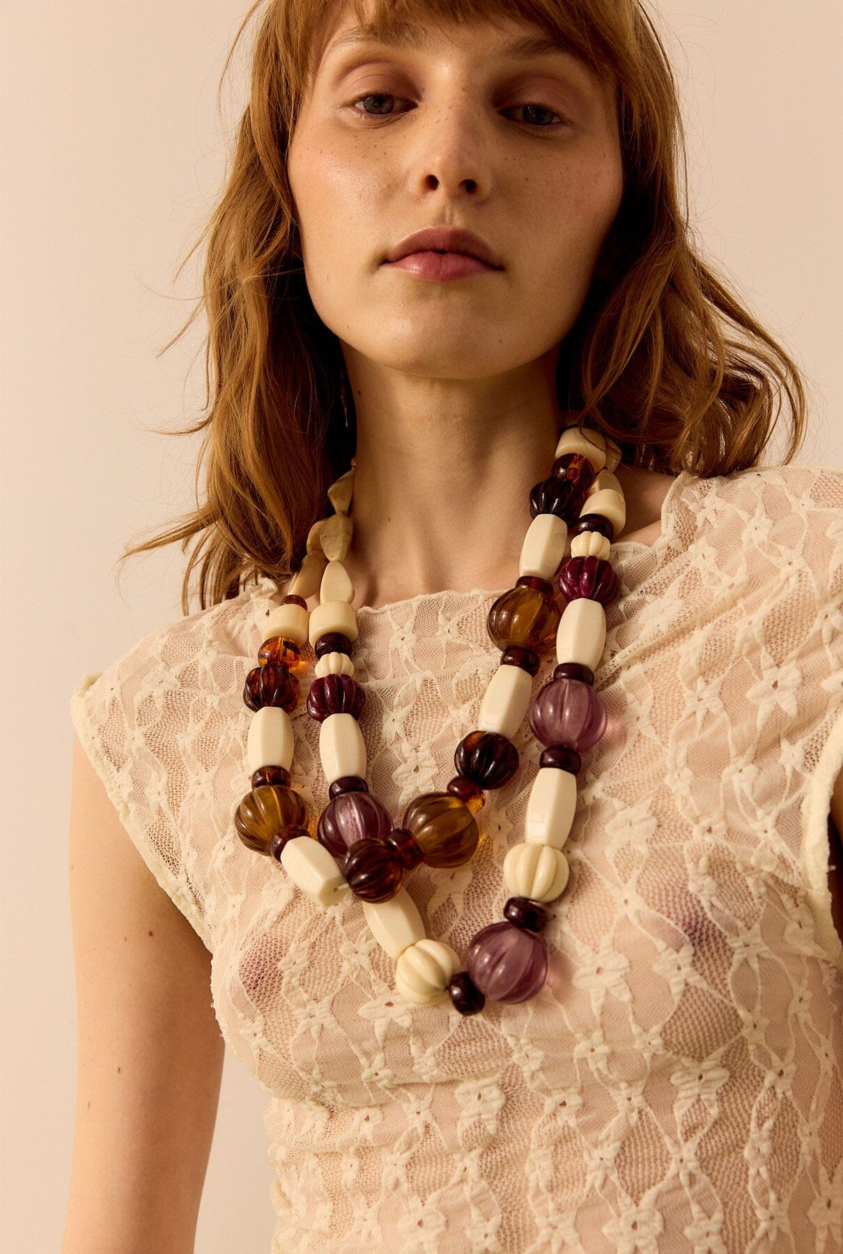 Half chest necklace, made with tubes, balls and discs, made of multicoloured resin.