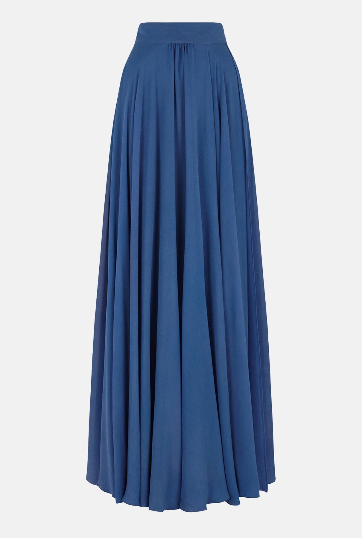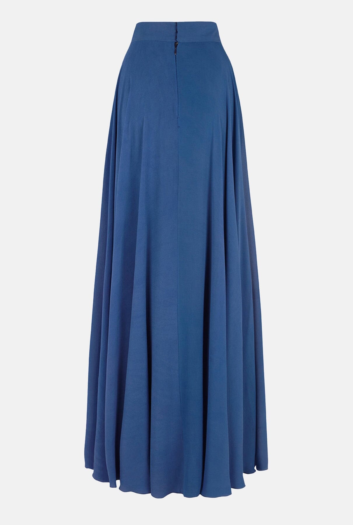 Maxi falda fluida, confeccionada en dos capas. Una capa interior de crêpe de seda y una exterior de georgette de seda. Ambas capas presentan un teñido artesanal en dos tonos degradados de índigo, que aportan profundidad y carácter a la prenda.
