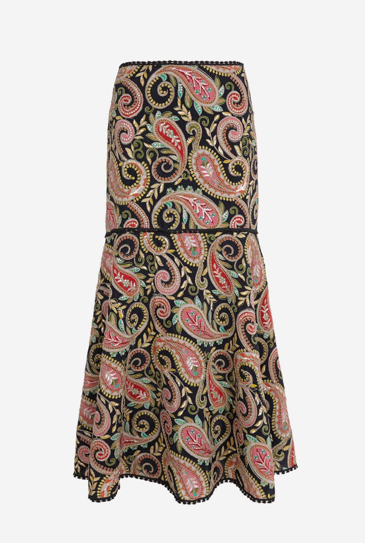 Esta falda larga de LD está confeccionada con tela bordada con cachemira e hilos metálicos. Tiene cintura alta, corte a la cadera y cierre trasero con cremallera oculta en la costura. Forrada.