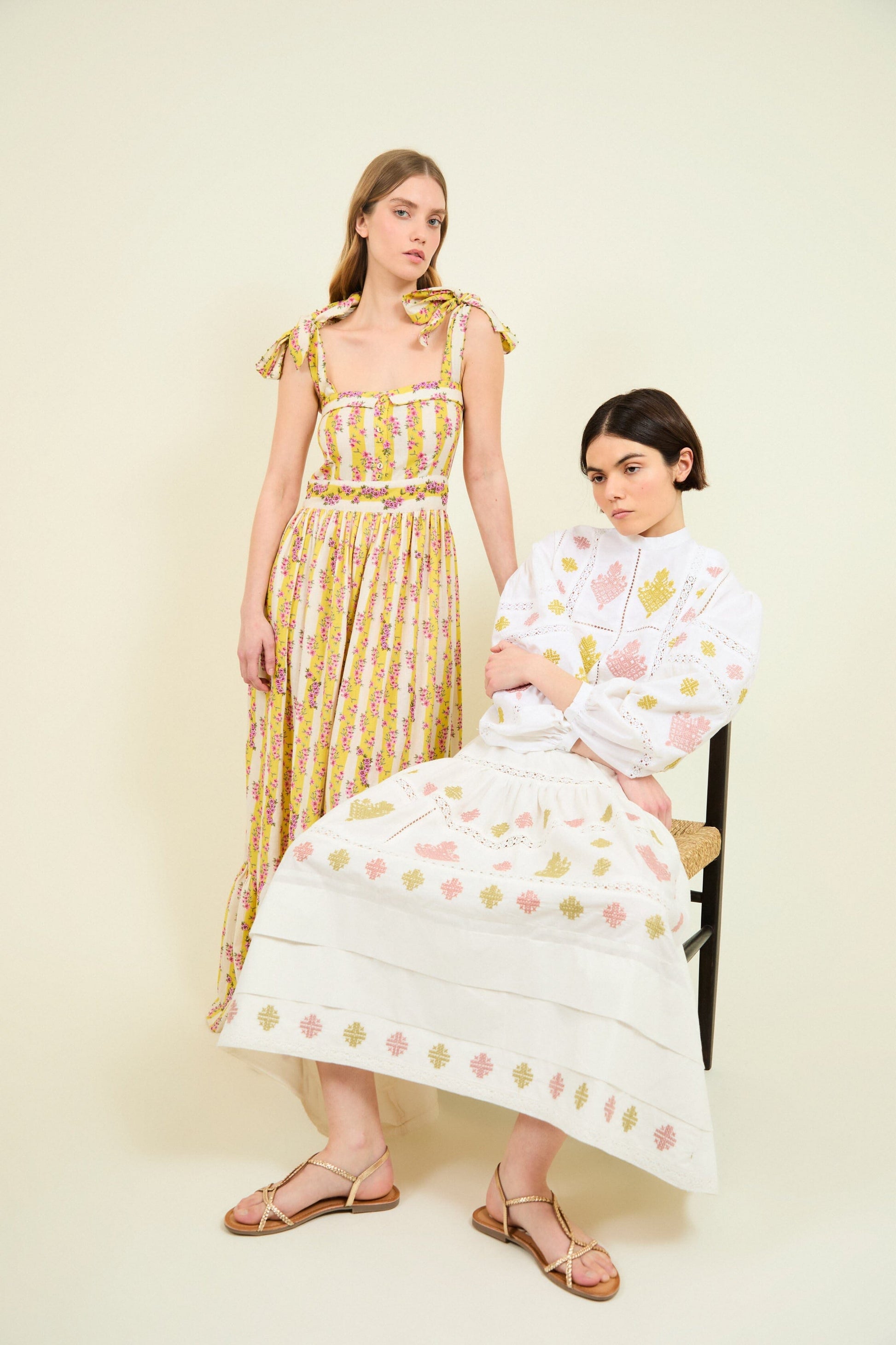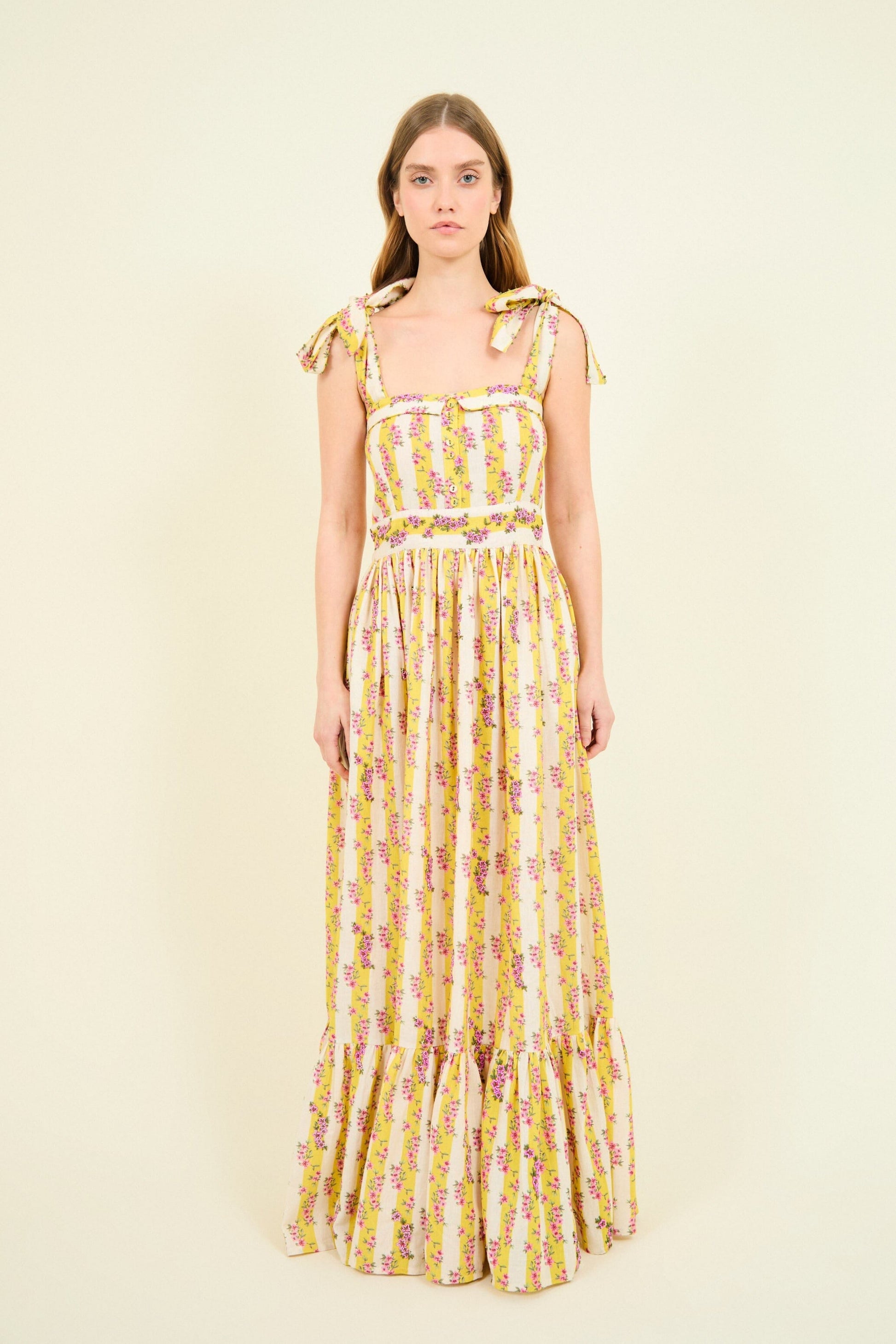 El vestido largo Adalynn en color amarillo es un diseño palabra de honor con un romántico y femenino estampado floral en tonos rosas. Está confeccionado en algodón y lino, tejidos naturales ideales para la temporada primavera-verano por su ligereza. Tiene escote cuadrado con tirantes con lazo, cuerpo ajustado con botones y falda con volante;