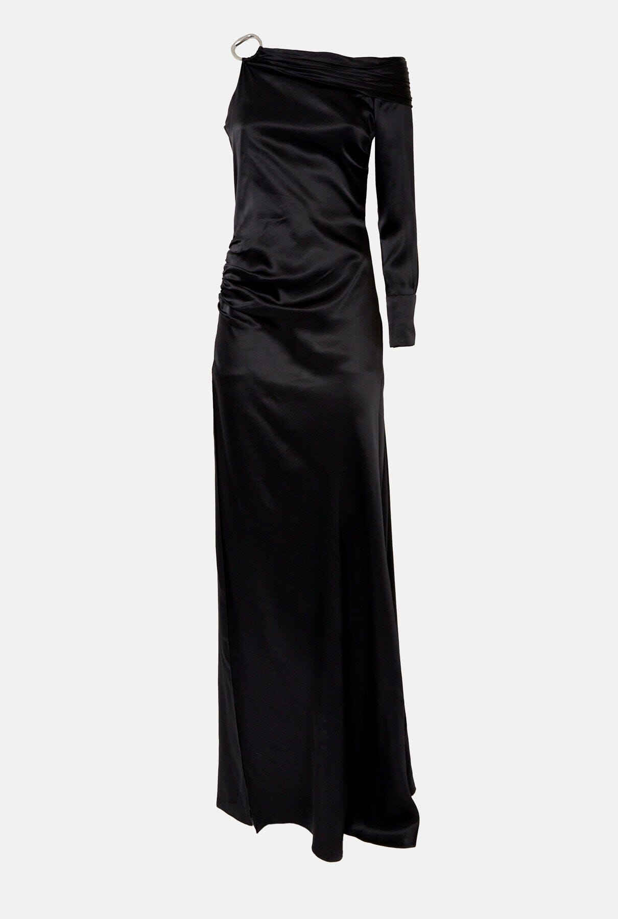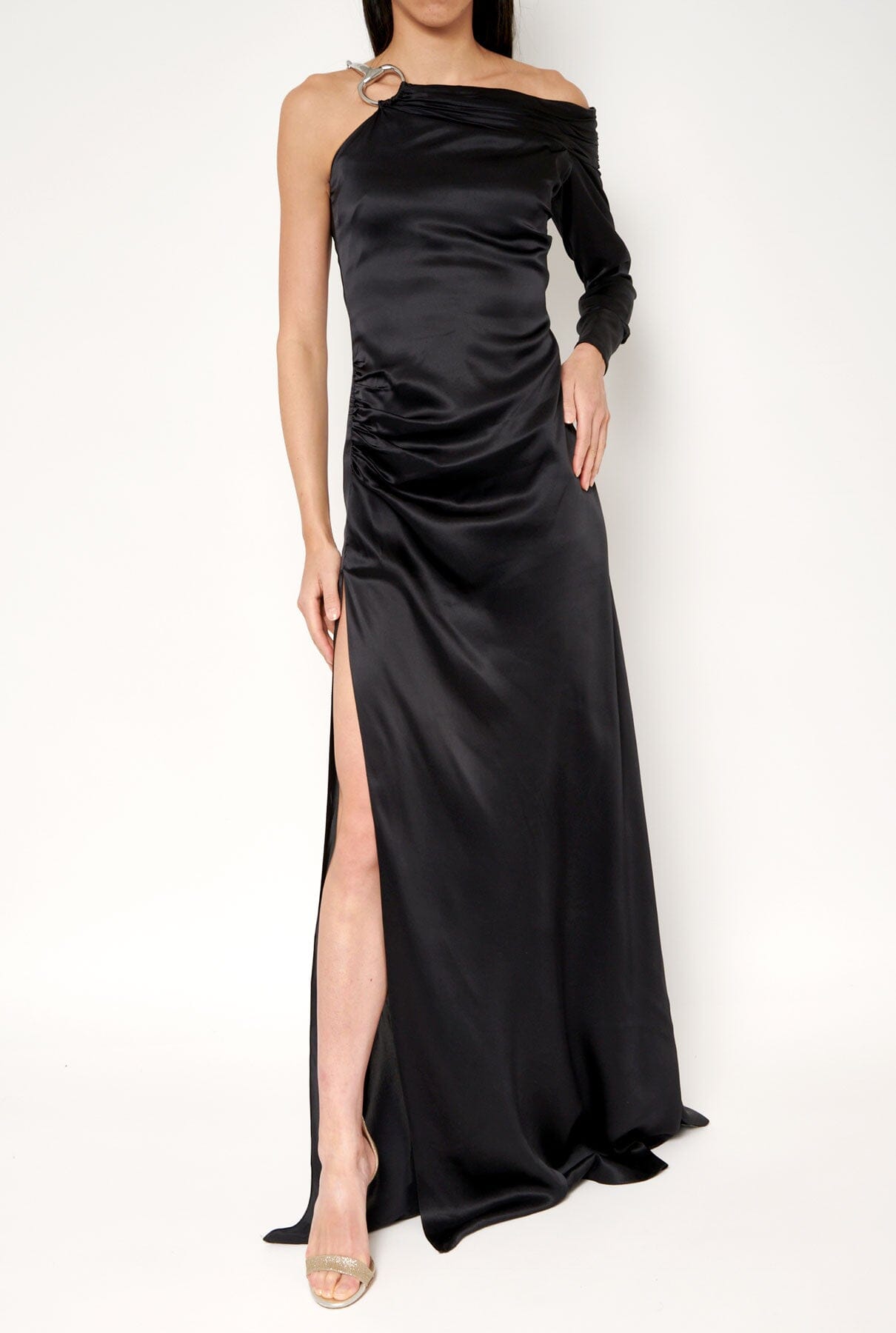 Vestido largo de seda, asimétrico, fruncido en cintura, con una manga y adorno metálico en el hombro. Abertura lateral.