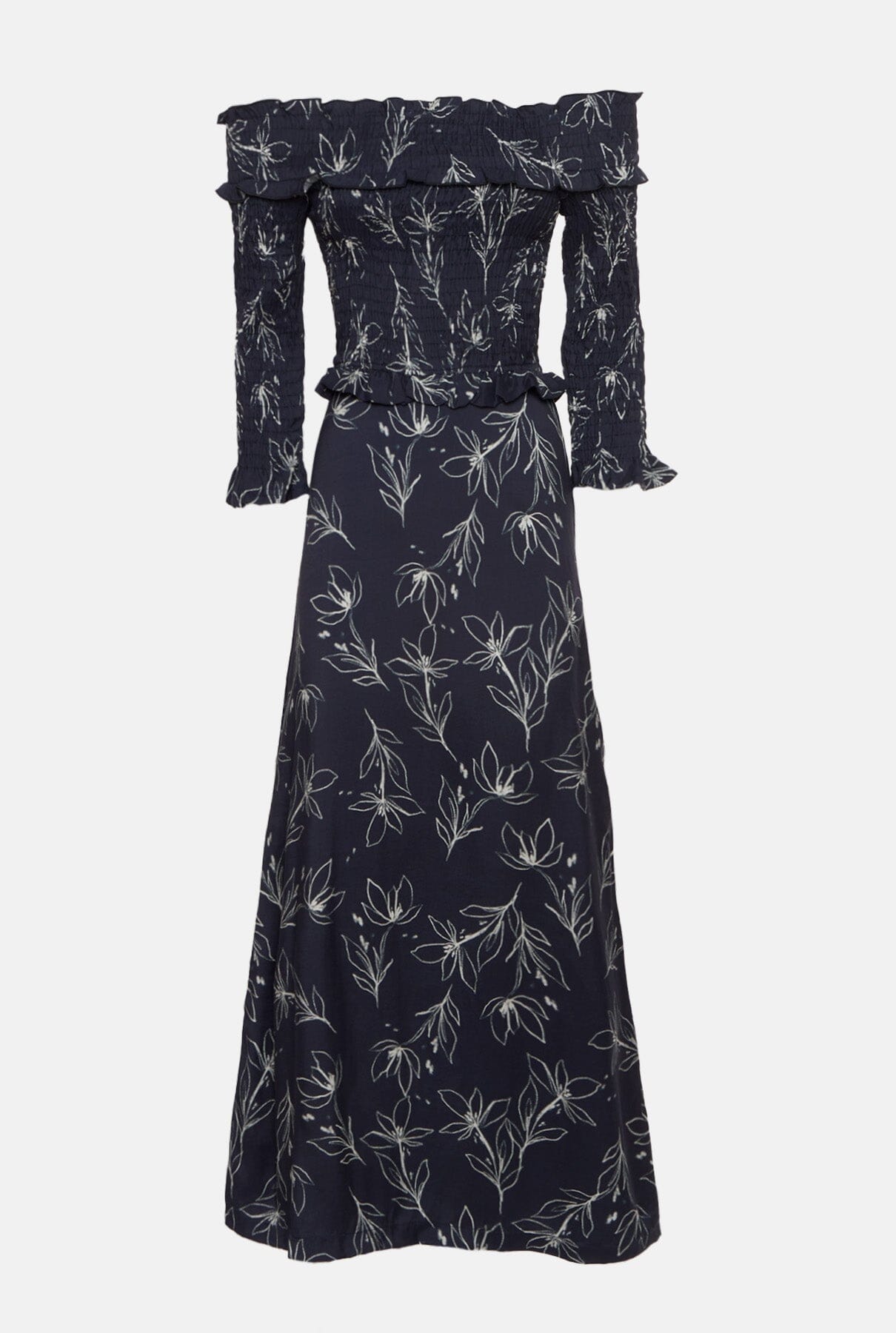 Vestido midi en tejido estampado en azul marino y crudo. Escote bardot con volante, cuerpo y mangas midi con volante y forro interior. Detalle de volante al final del fruncido y cierre con cremallera invisible en la espalda.
