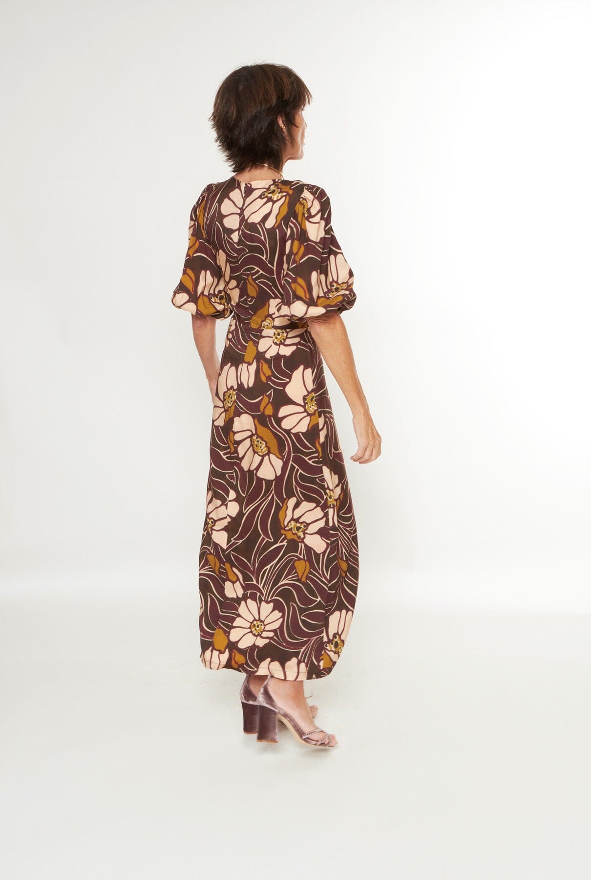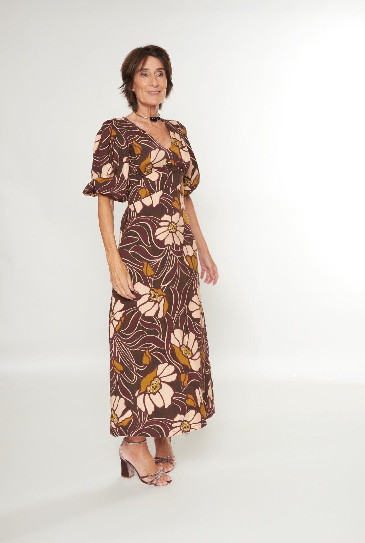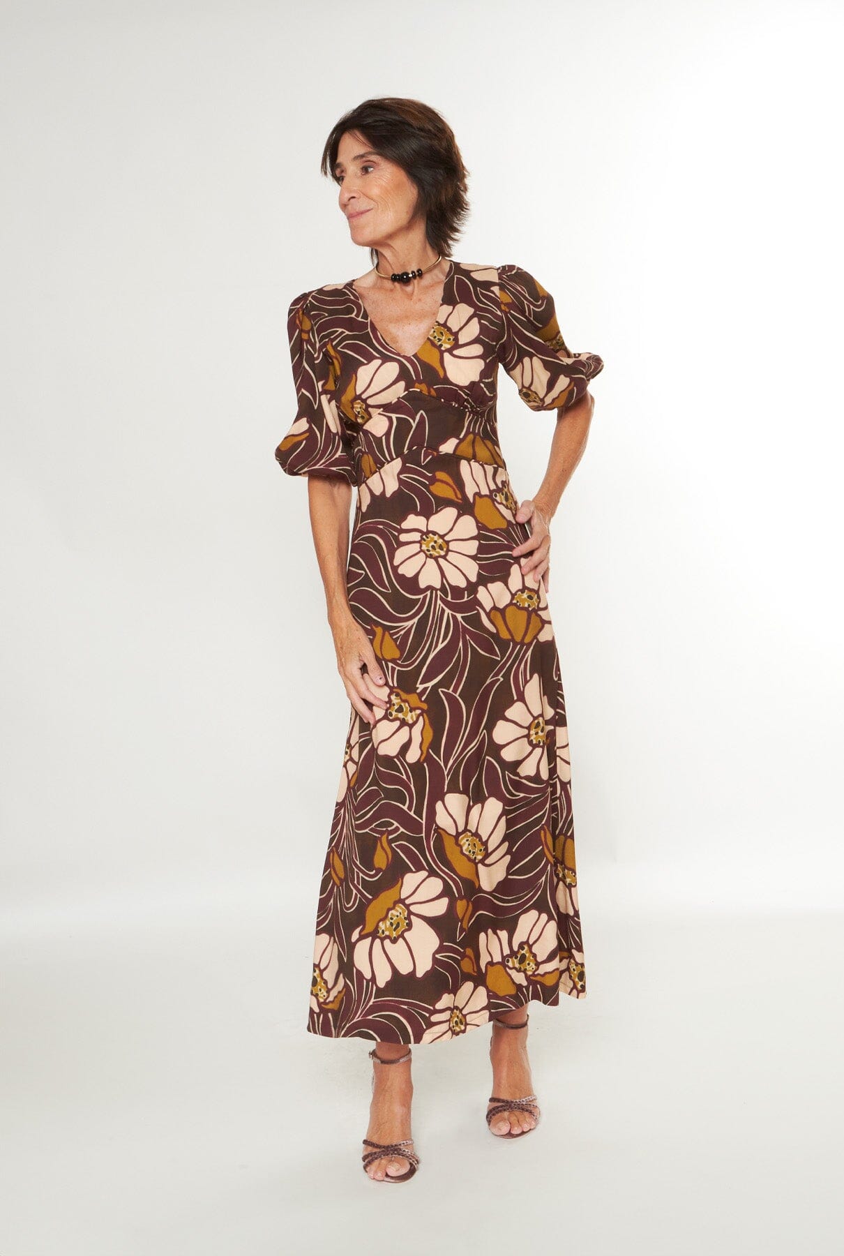 Vestido midi en tejido estampado en tonos marrón, beige y mostaza. Escote en pico con corte bajo el pecho. Mangas midi con elástico en el extremo para ajustarla a la medida deseada. Cierre con cremallera invisible en la espalda.