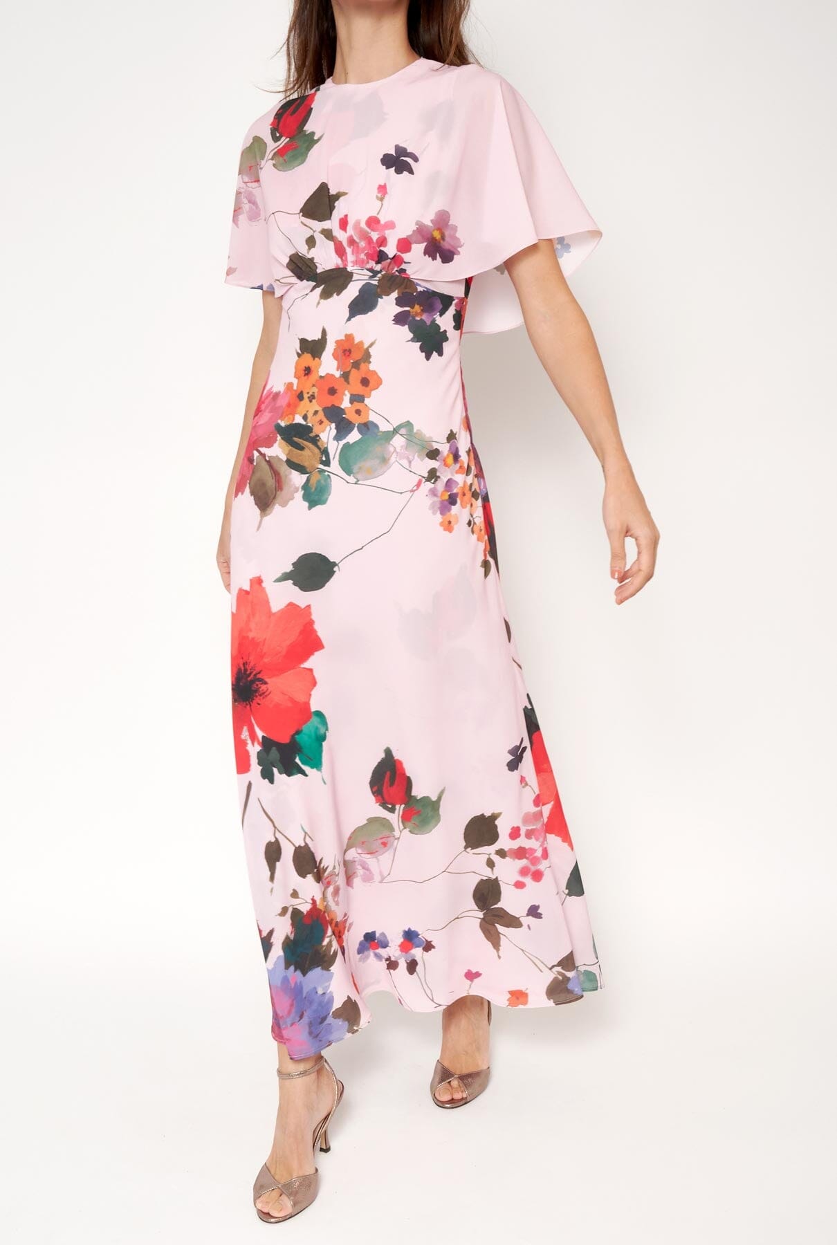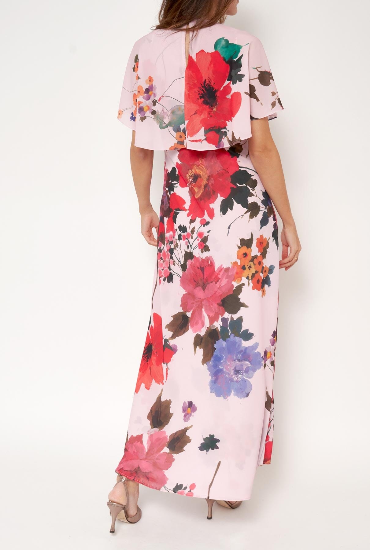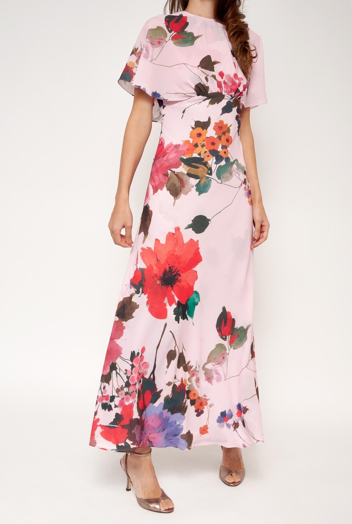 Vestido largo con escote caja y corte bajo el pecho con detalle de capelina en la parte superior confeccionado en tejido floral acuarela.
