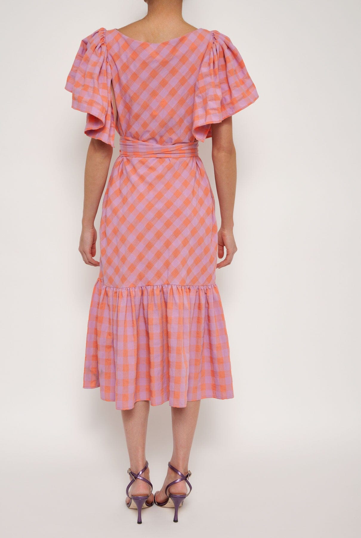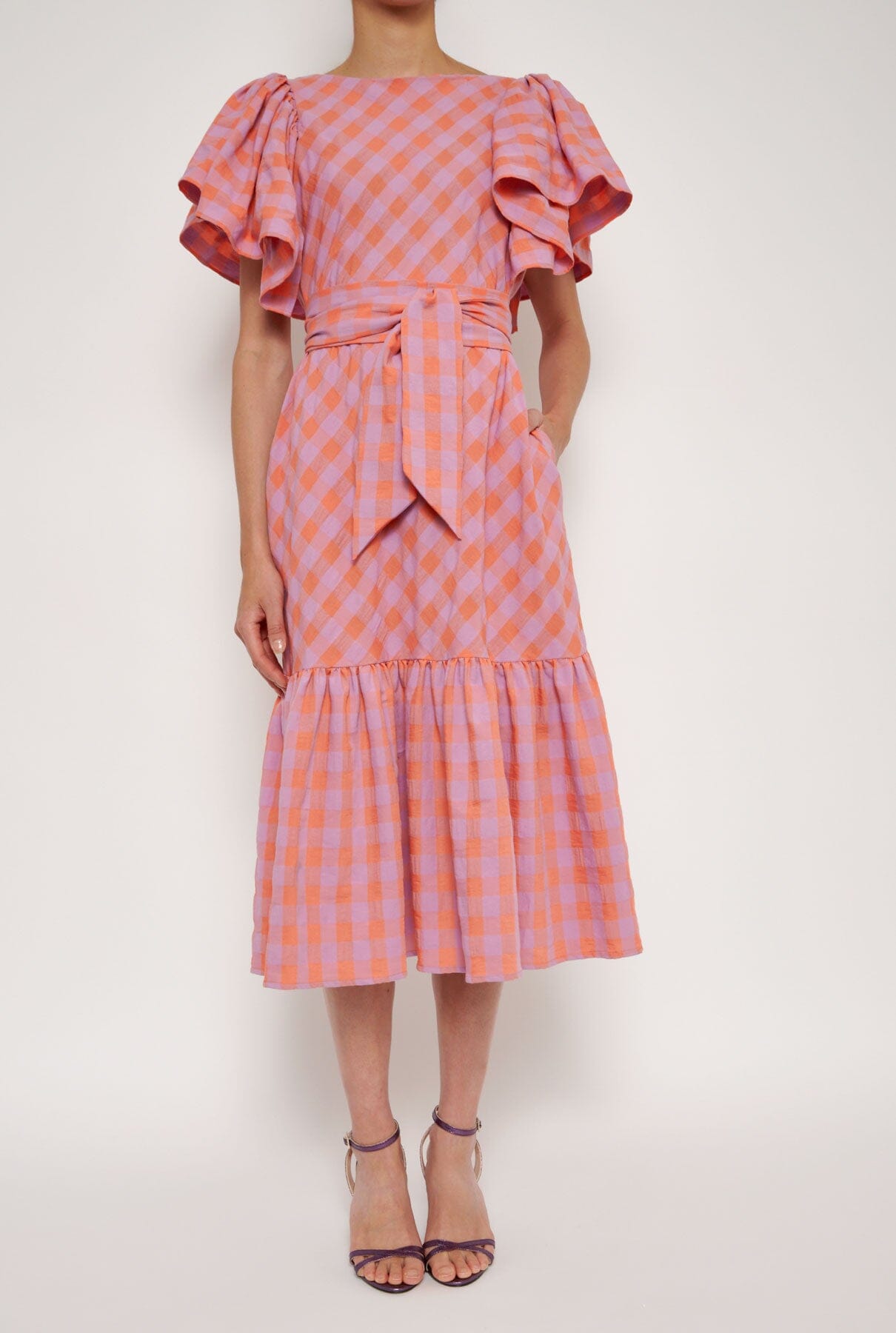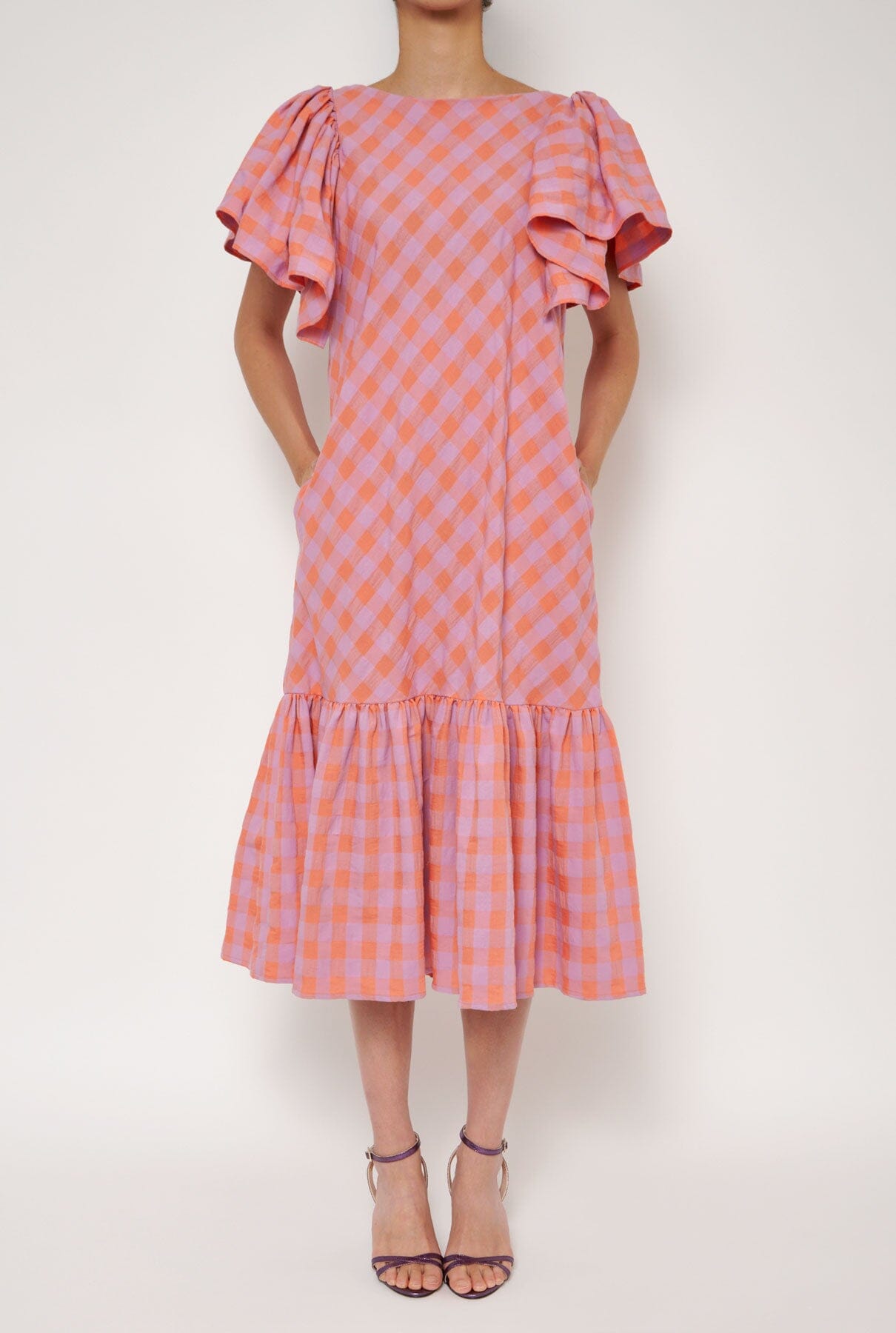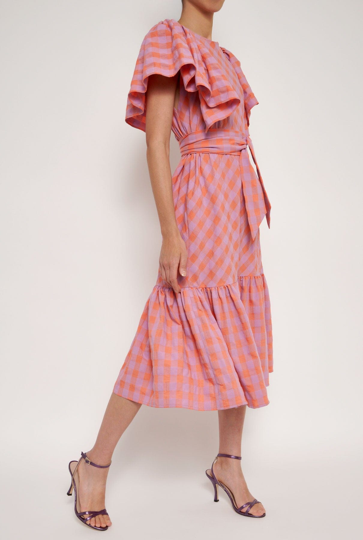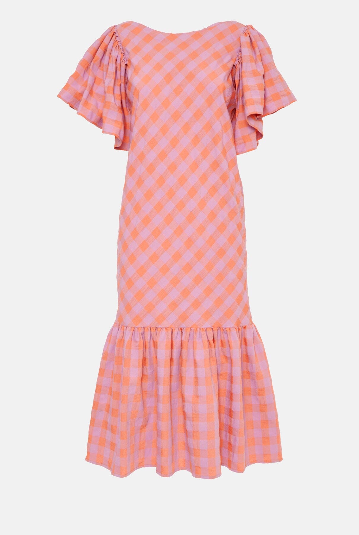 Vestido midi de cuadros con escote barco. Volantes en mangas y bajo. Puede ir con cinturón o suelto.