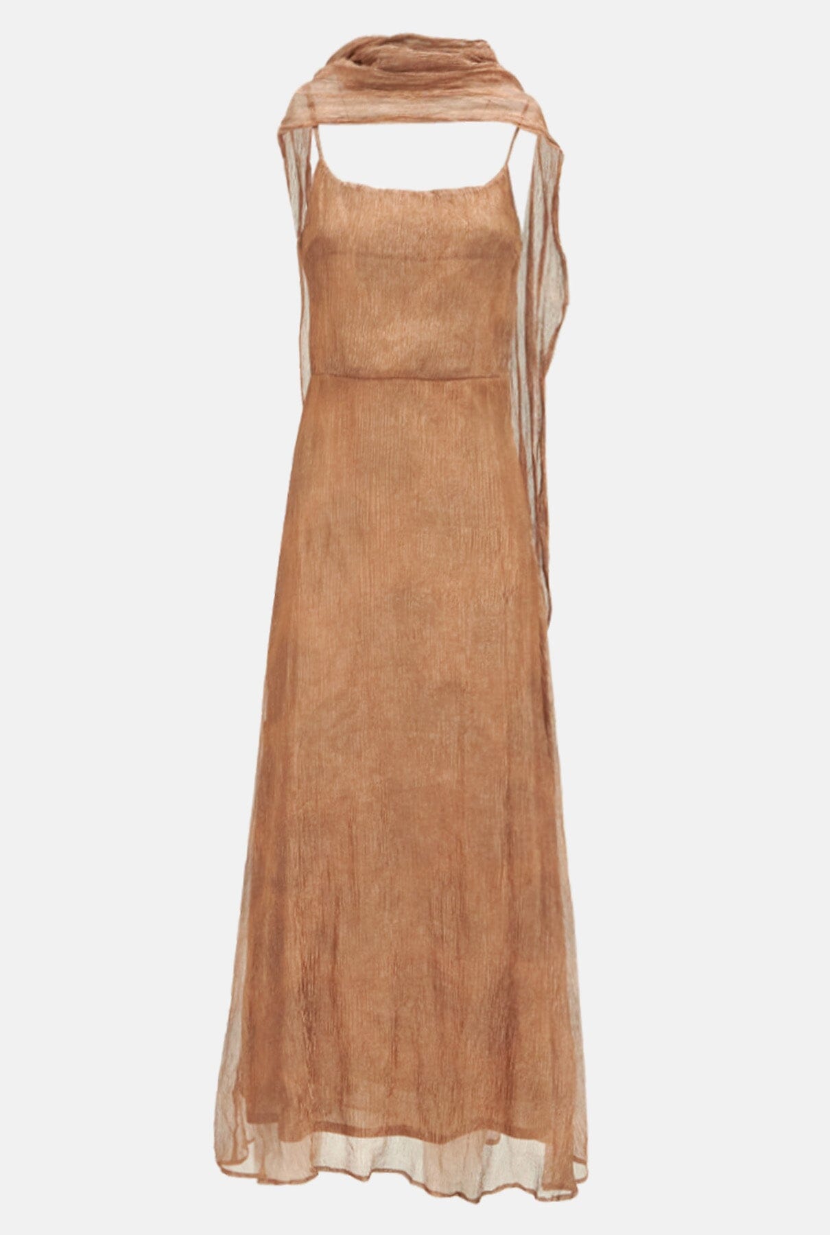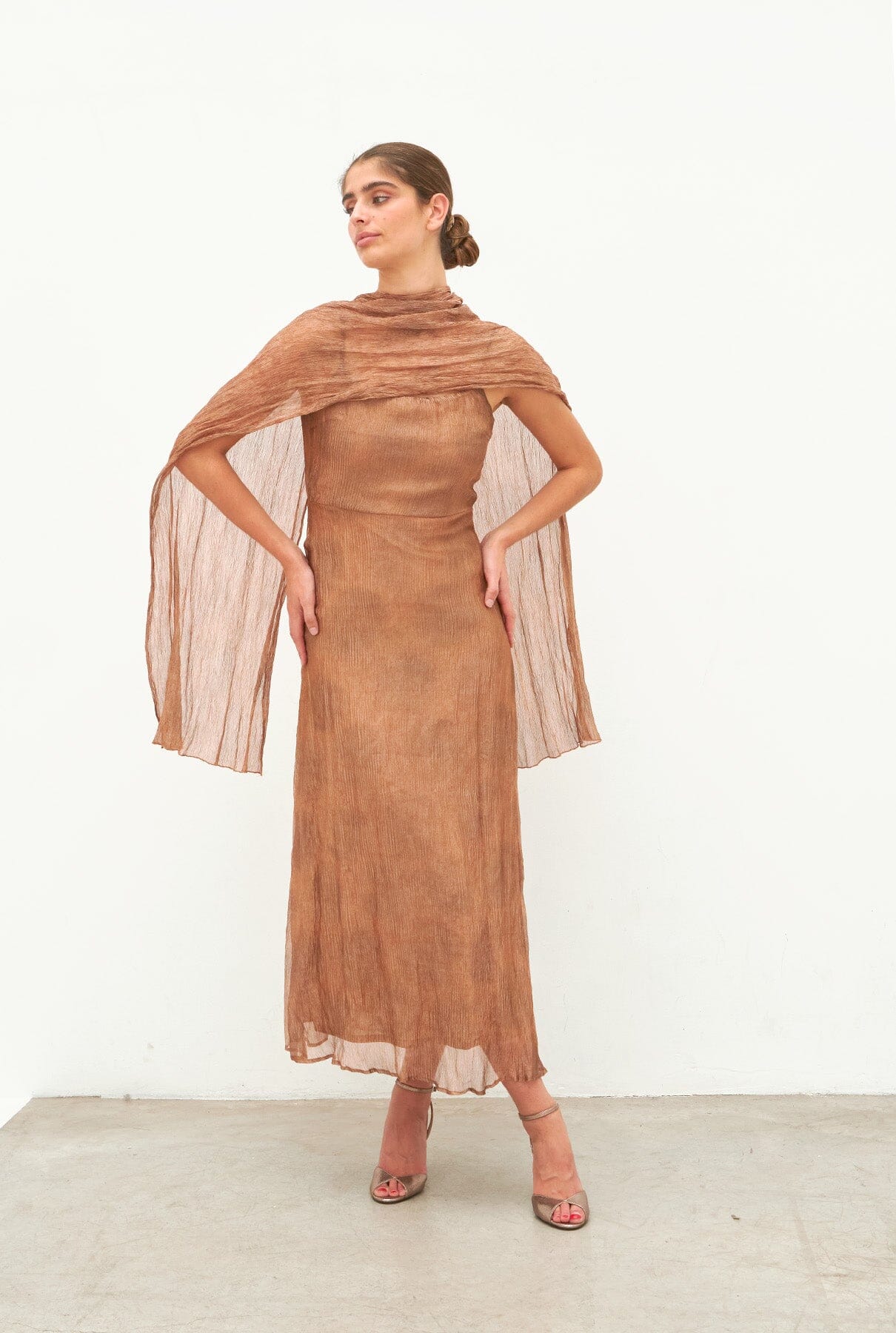 Vestido midi en tejido de seda plisada en color cobre. Escote redondo y espalda semiabierta. Corte en cintura, forro interior y cierre con cremallera invisible. Incluye chal multiposición.