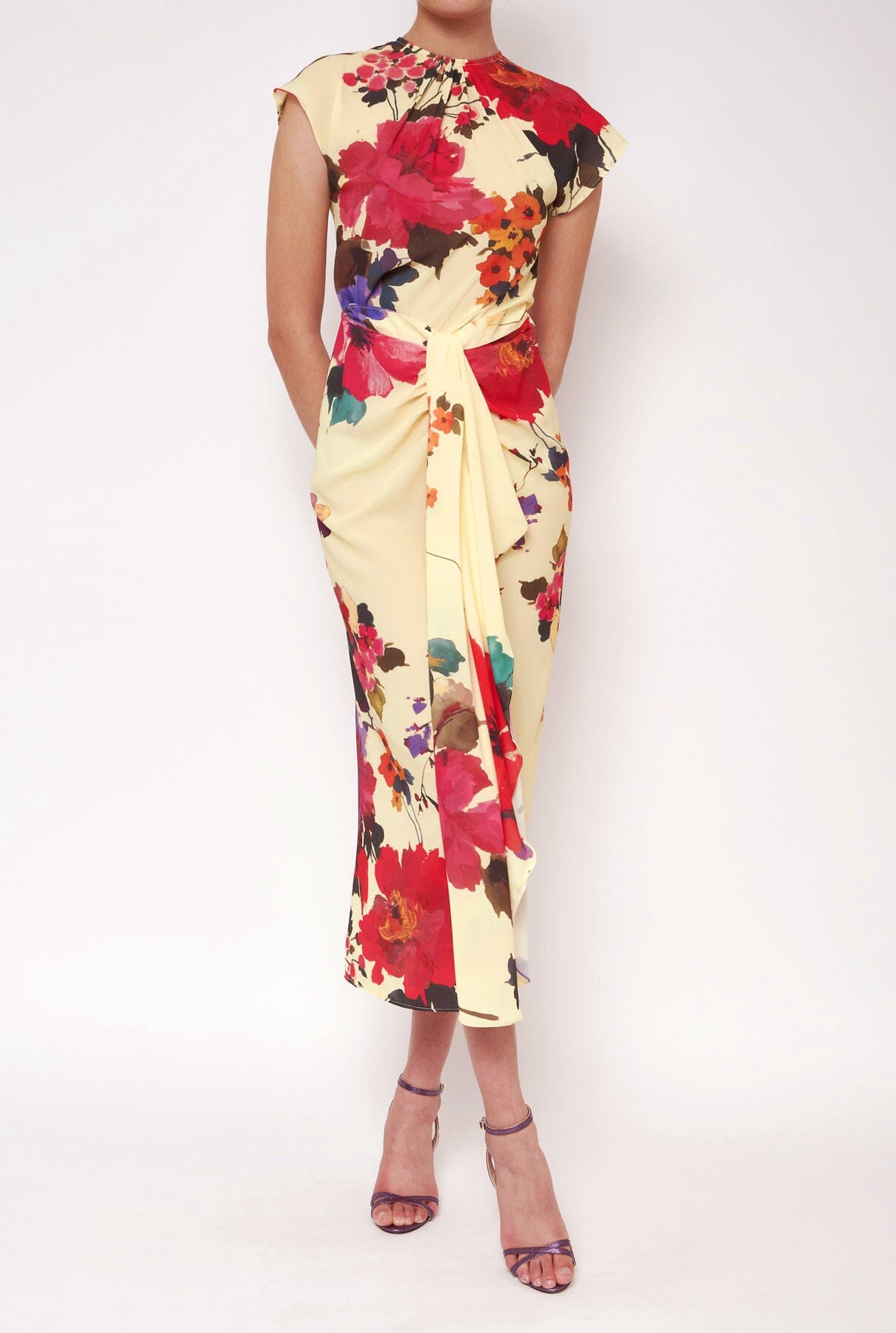Vestido de cuello caja, manga caída y escote fruncido. Con un top abullonado en la cintura, la parte inferior es una falda anudada y fruncida con abertura frontal, co-confeccionada en un estampado de flores de acuarela.