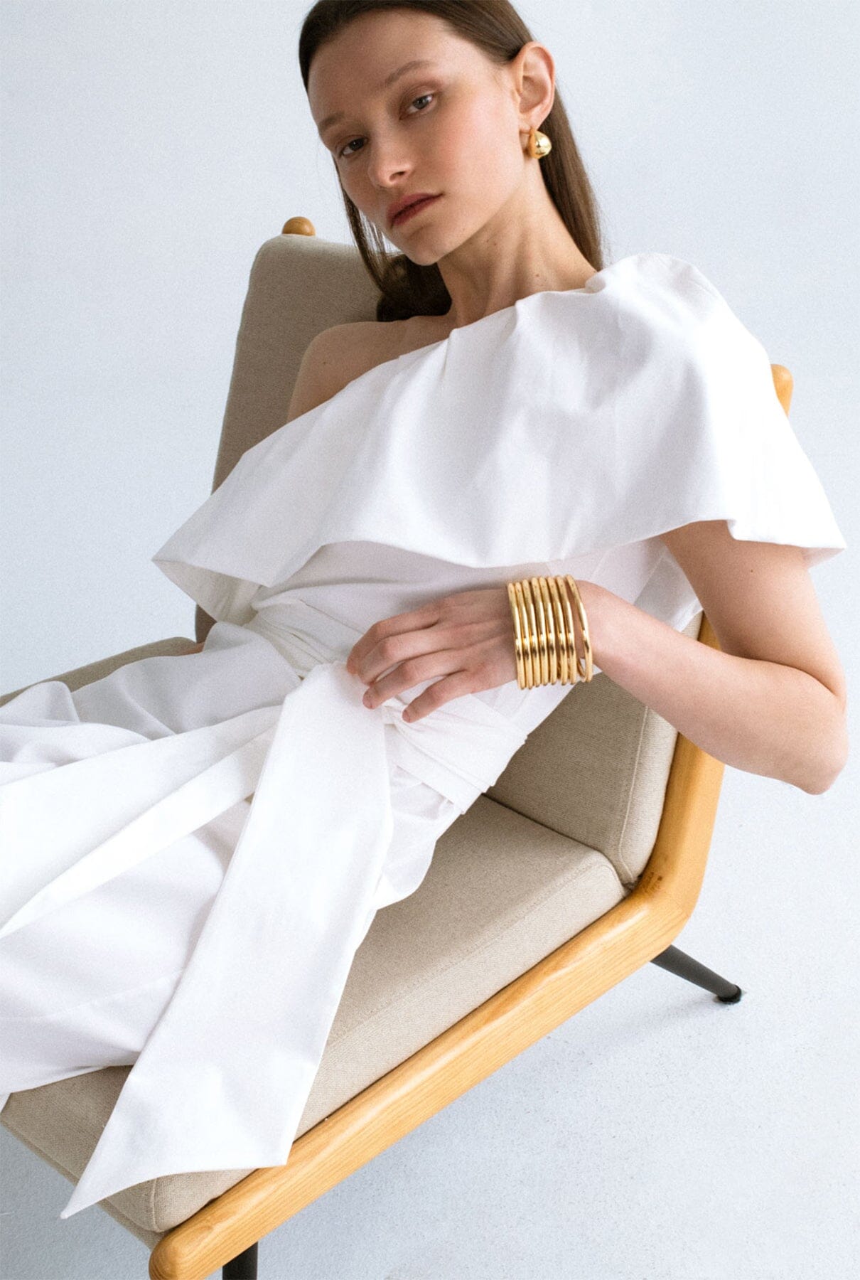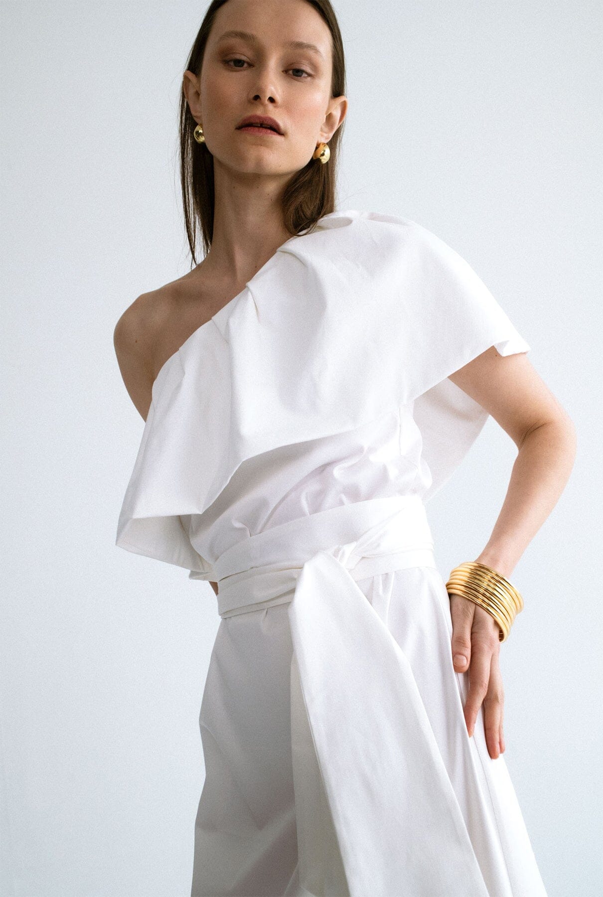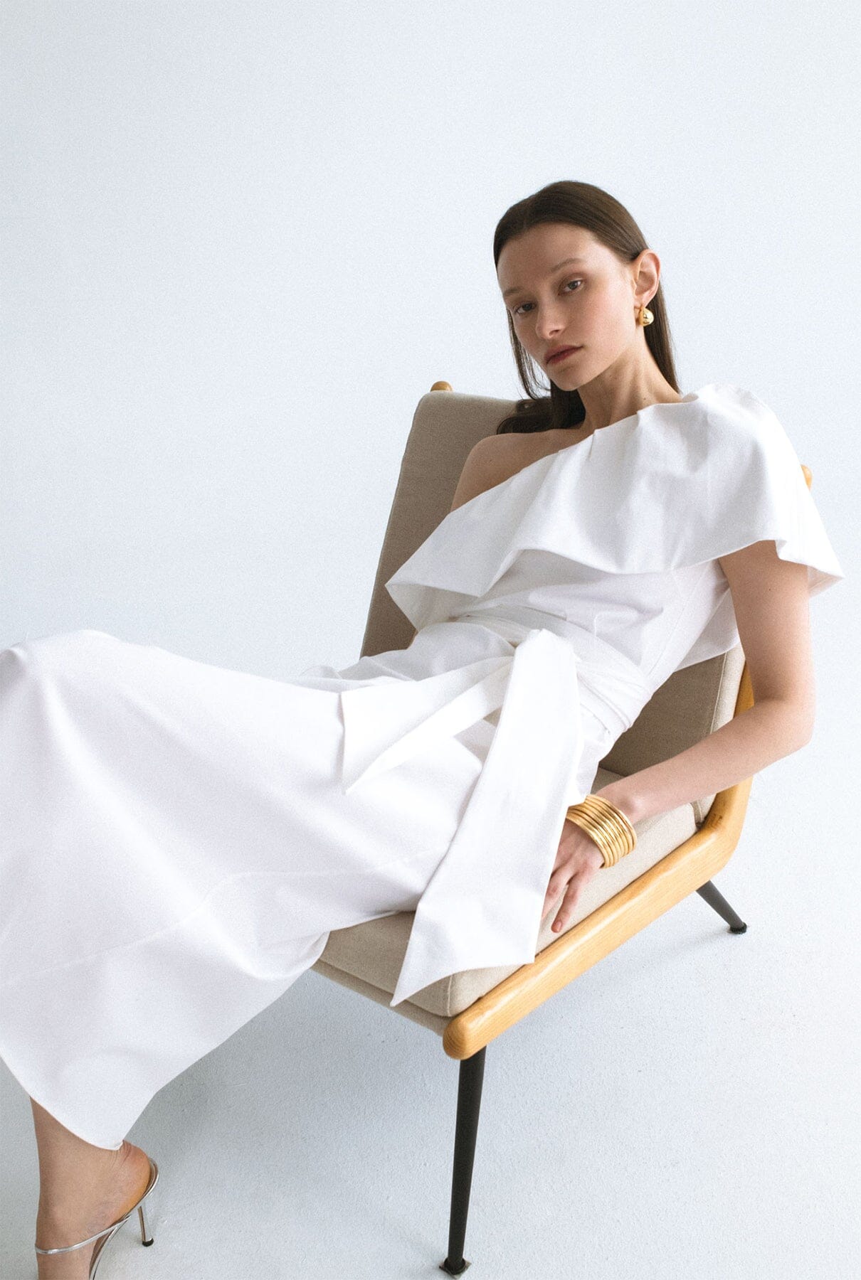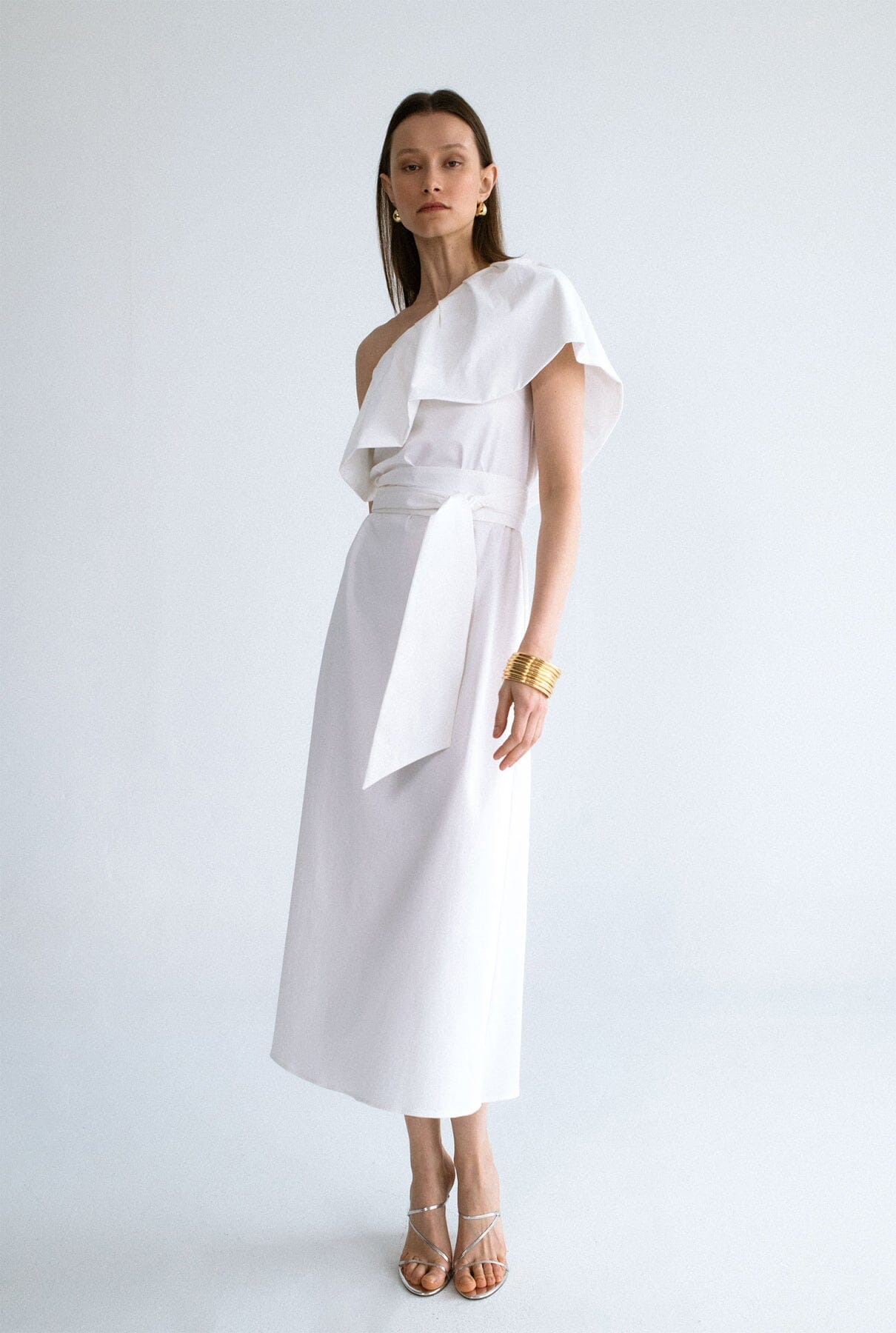 Dress by Miguel Marinero exclusively for Es Fascinante. Design with one shoulder uncovered and contrasting ruffle at the neckline. Option to wear with or without belt of the same fabric.
