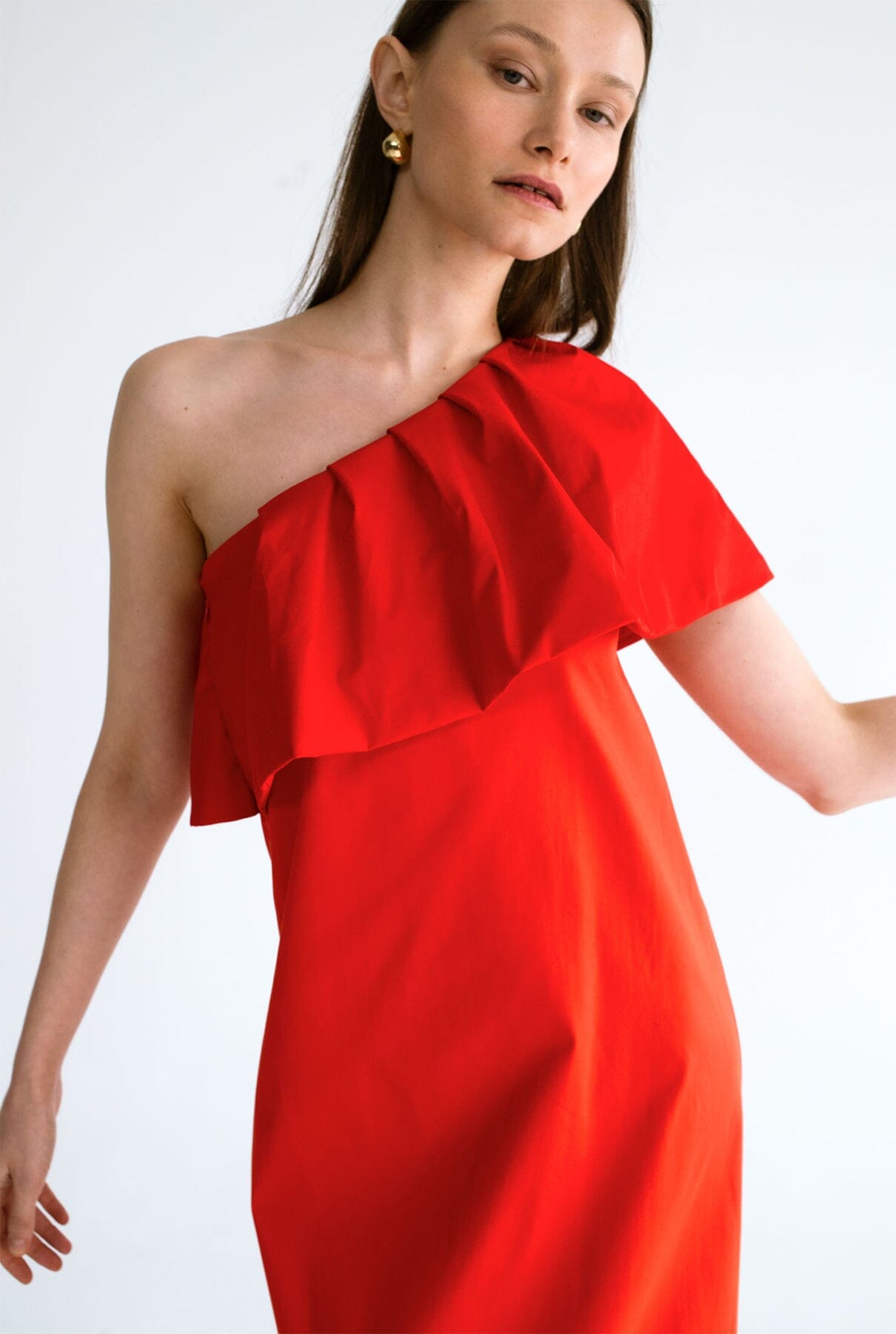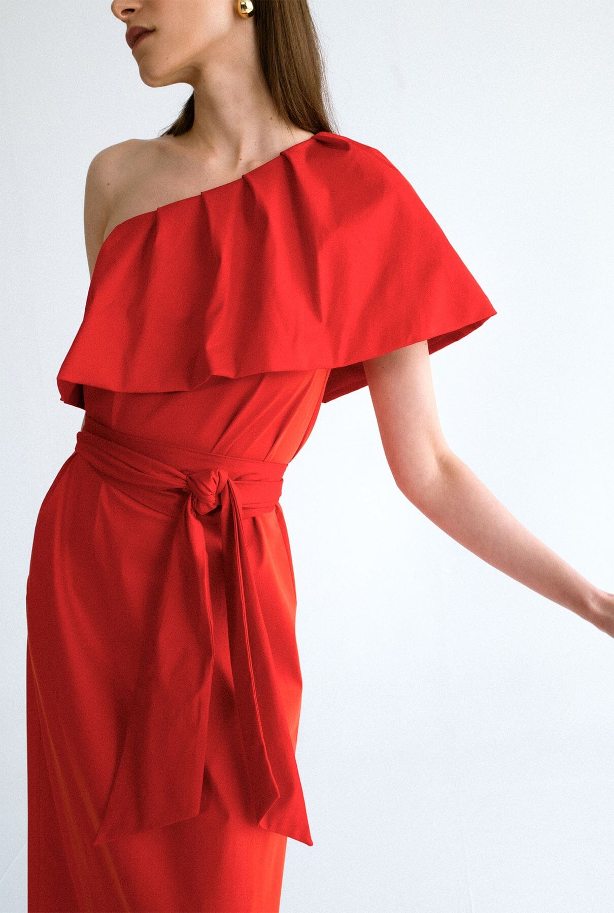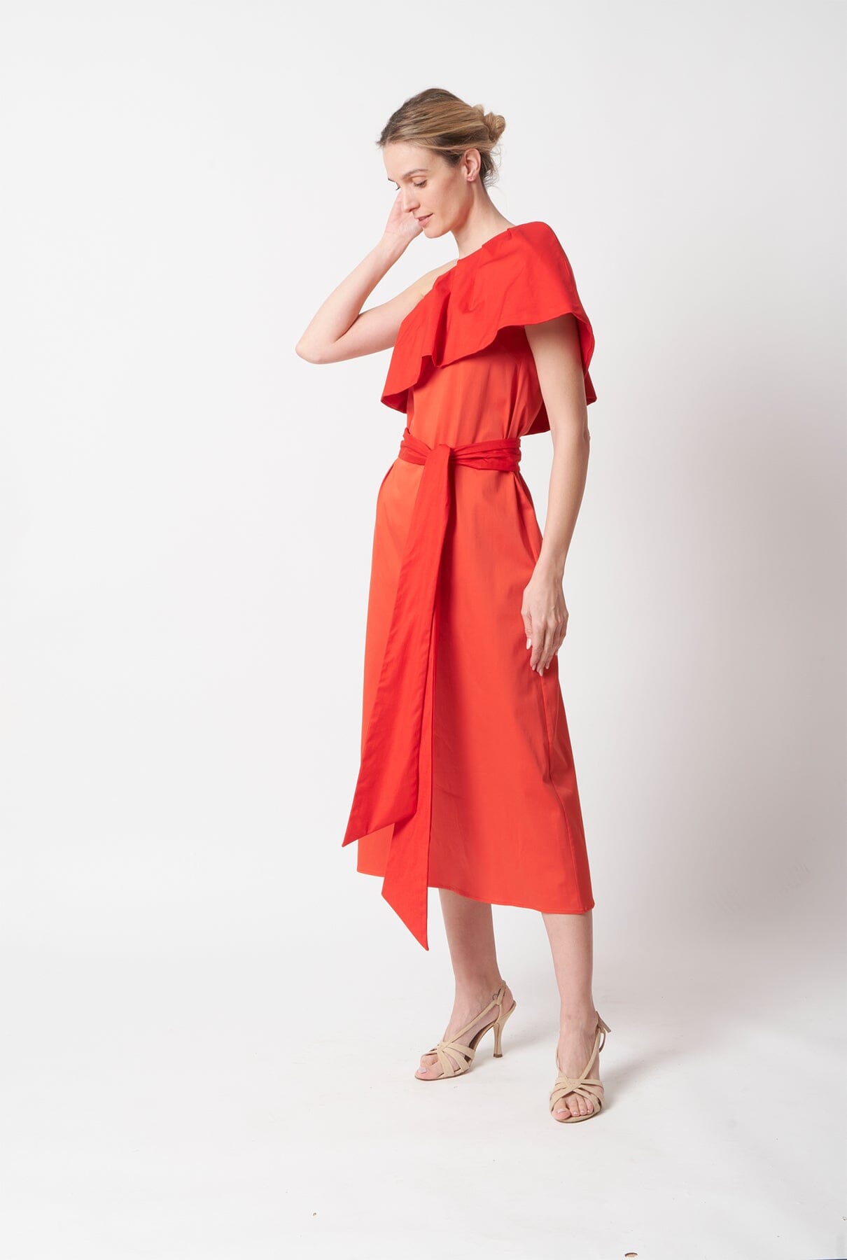 Vestido de Miguel Marinero en exclusiva para Es Fascinante. Diseño con un hombro descubierto y volante en escote a contraste. Opción de llevar con o sin cinturón del mismo tejido.