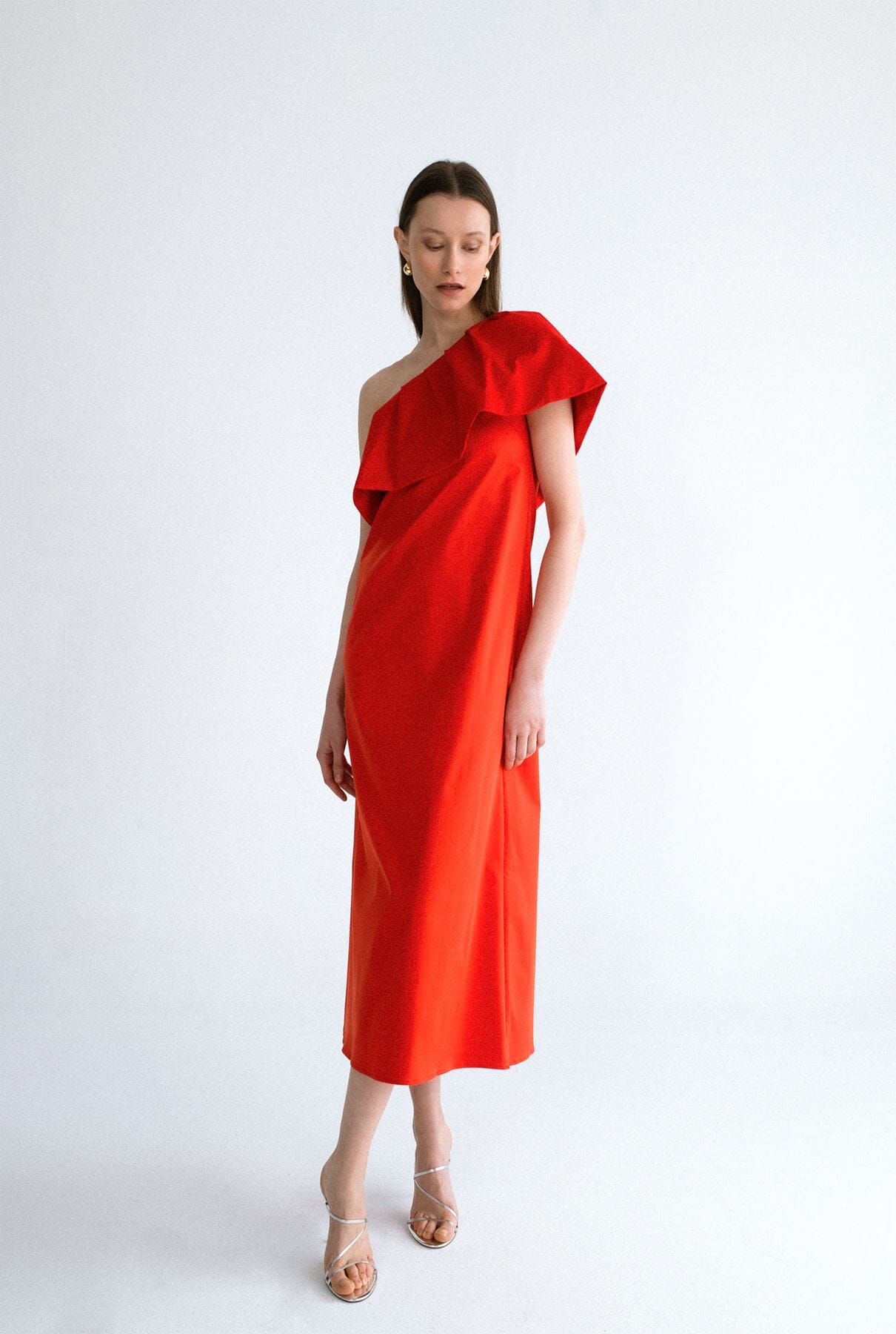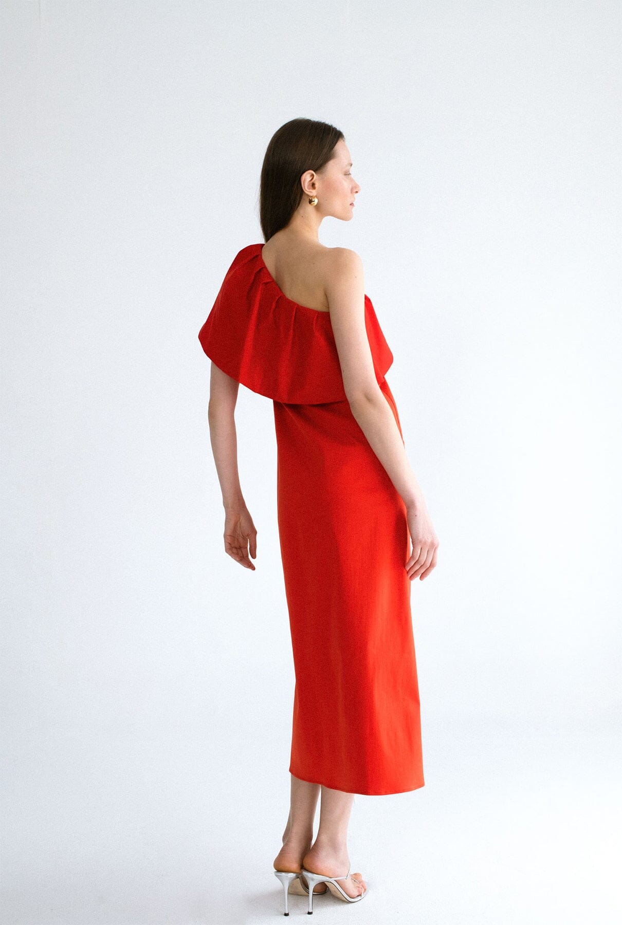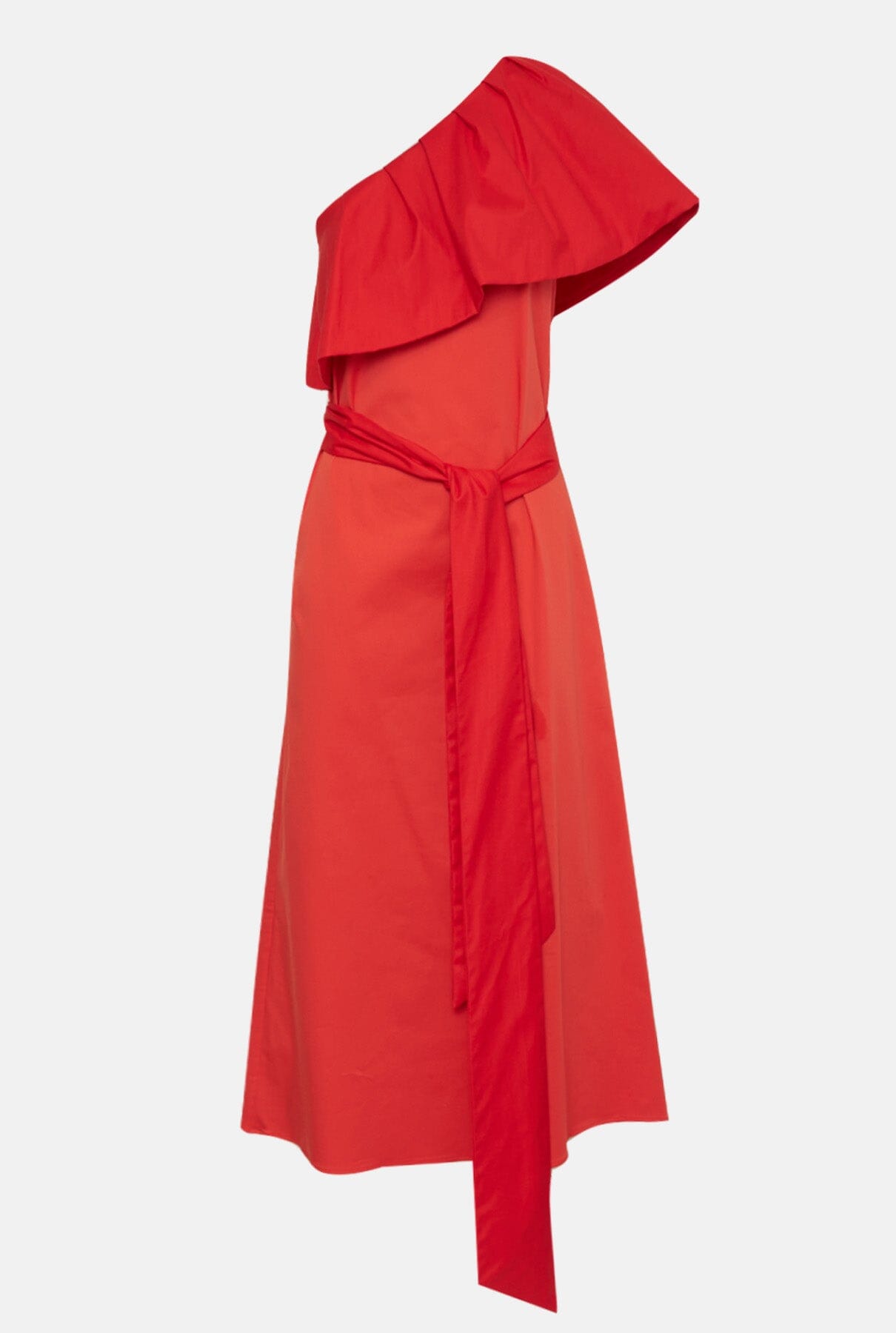 Vestido de Miguel Marinero en exclusiva para Es Fascinante. Diseño con un hombro descubierto y volante en escote a contraste. Opción de llevar con o sin cinturón del mismo tejido.