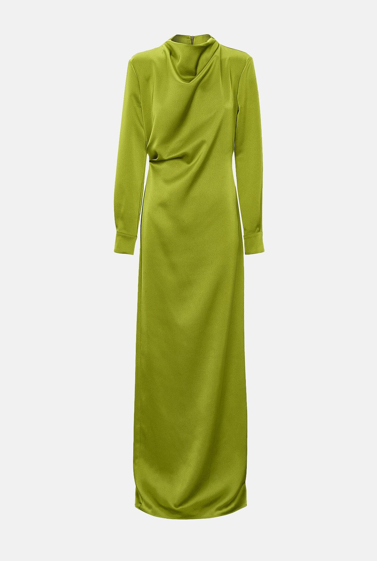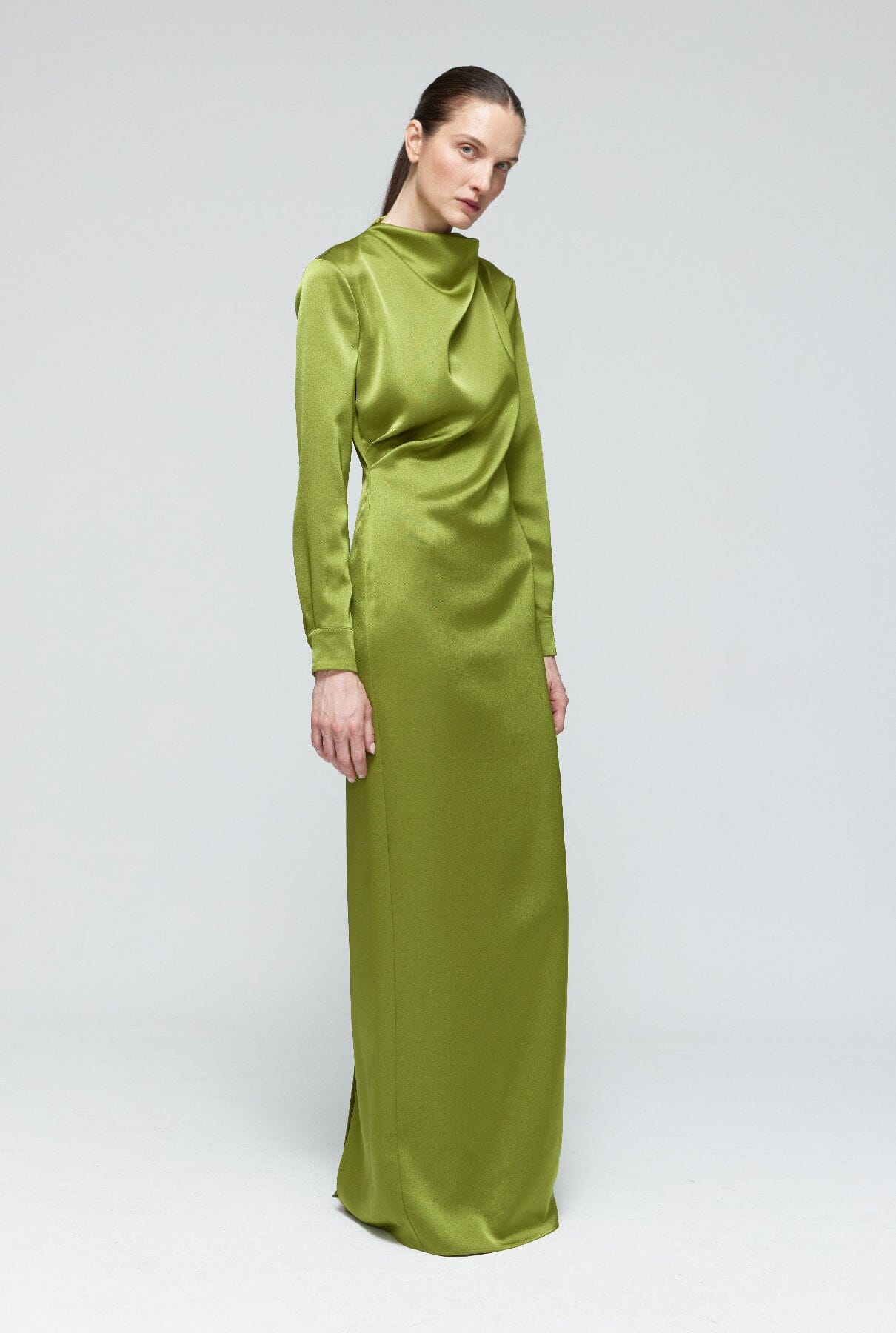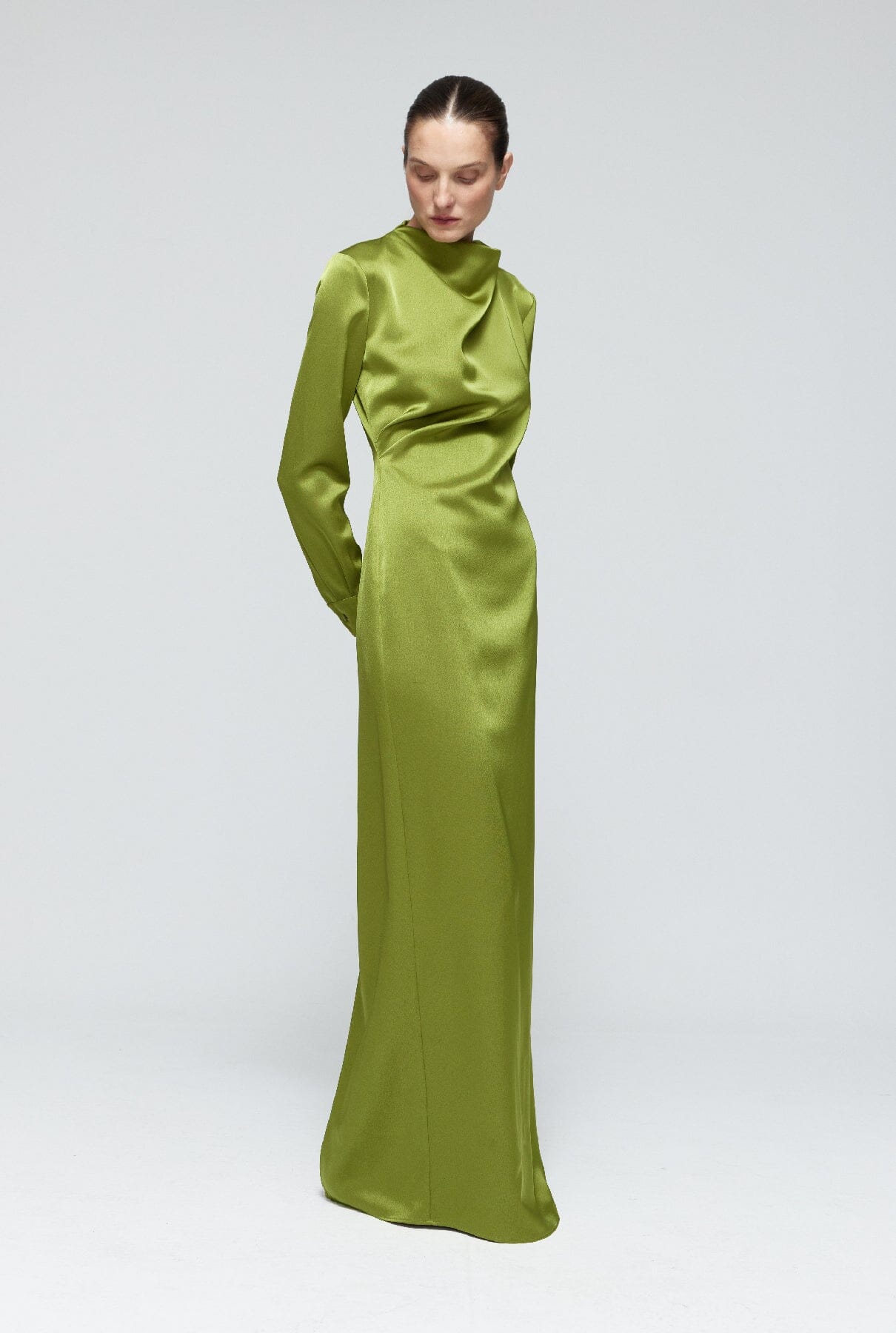 Esta temporada la noche cobra más vida que nunca con este vestido de escote drapeado y cuello perkins en color verde. Su tejido de satén con gran caída hace más escultural la silueta de la mujer, a través de pequeños pliegues que la envuelven.