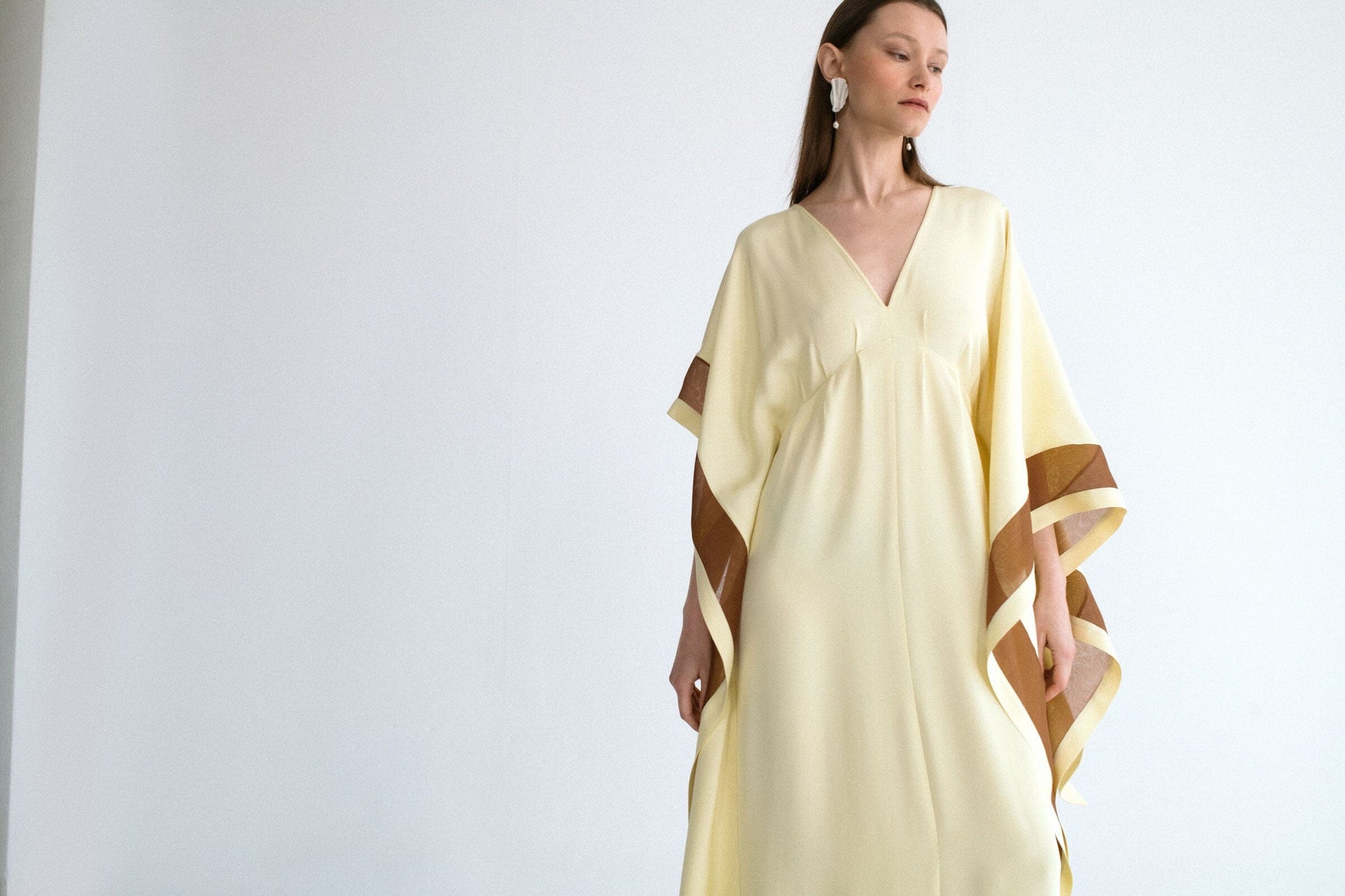 Vestido largo estilo kaftan de la firma Miguel Marinero en drappé de seda color crema con detalles en organza marrón. Diseño estilo kaftán con escote en pico, drapeado delantero y espalda abierta con cierre mediante un lazo. Luce este original diseño en ocasiones especiales.