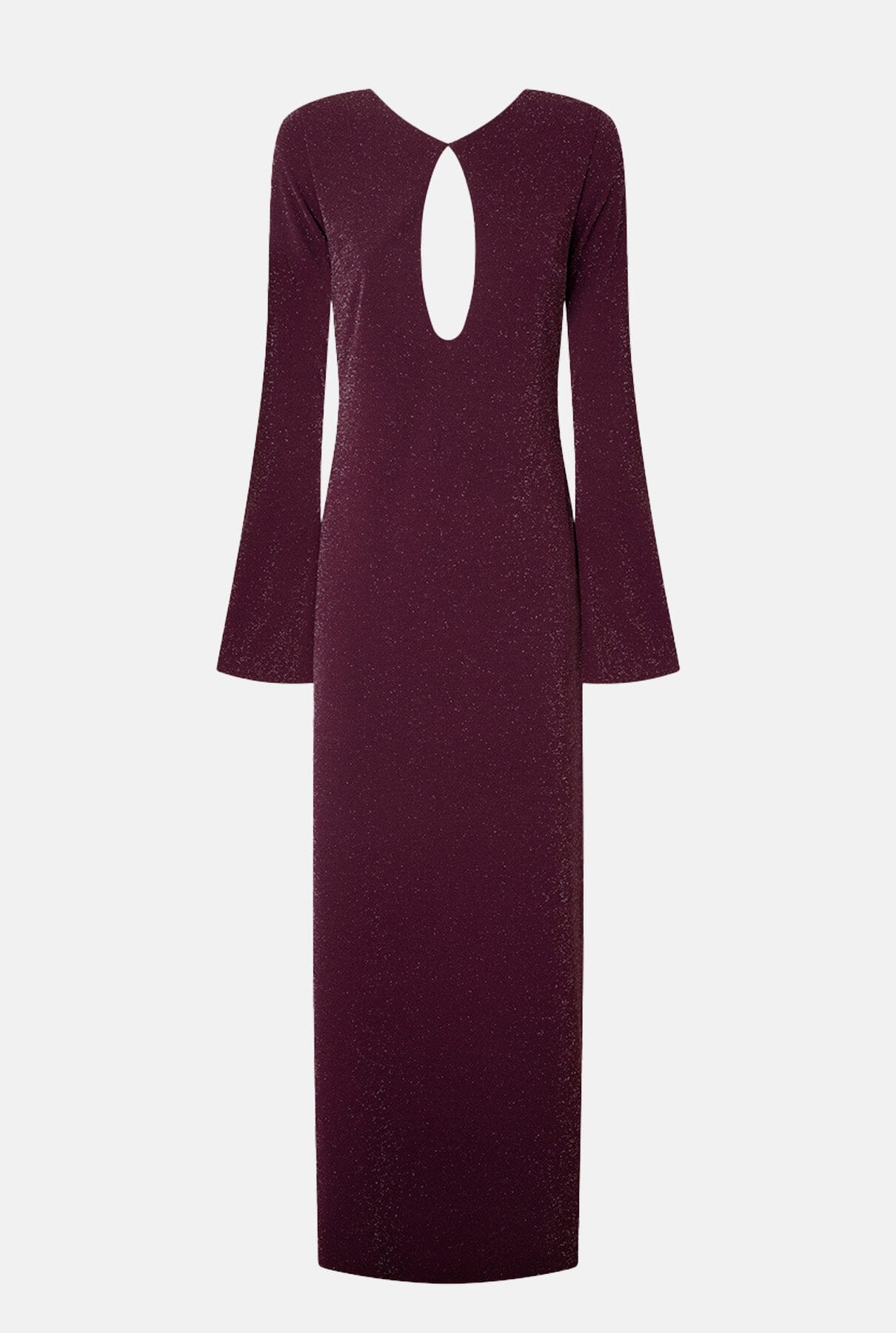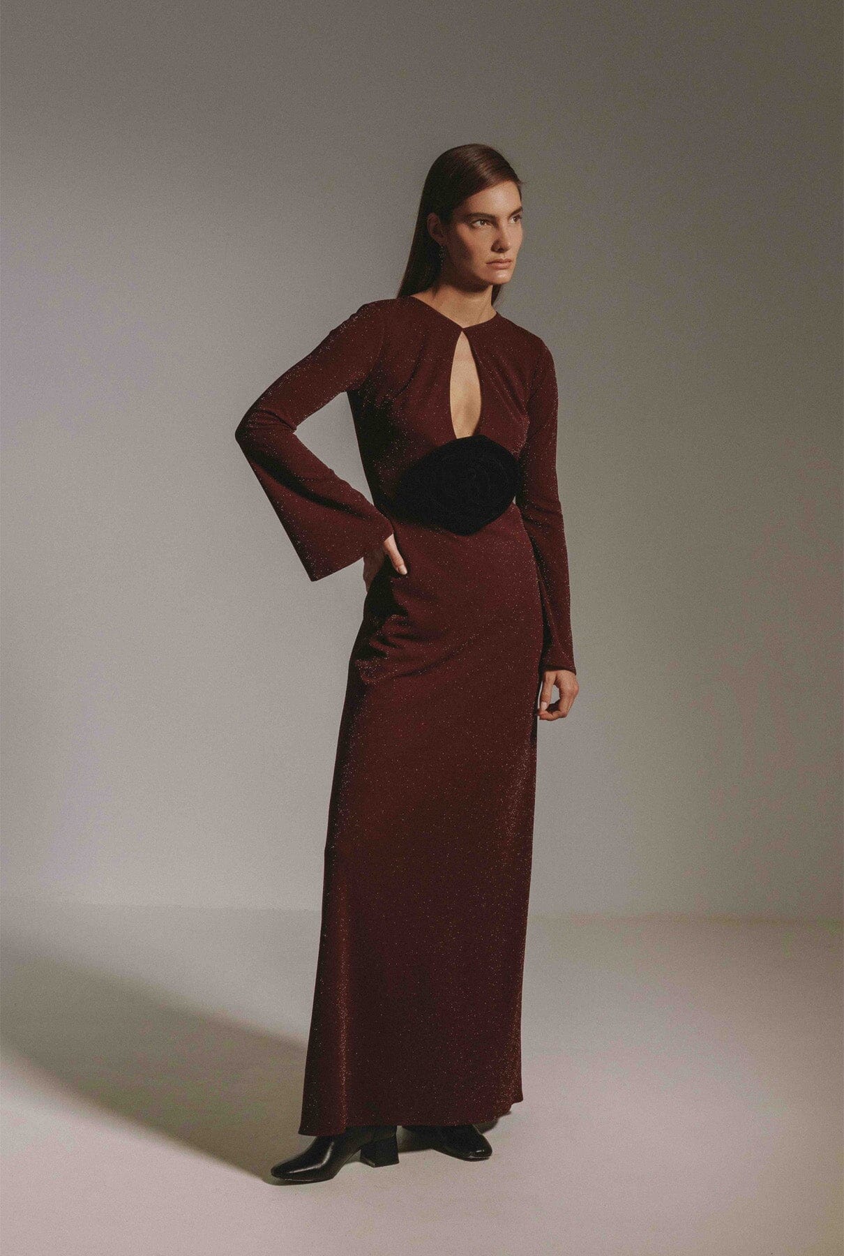Vestido largo de punto de lúrex en color granate, con escote lágrima, manga acampanada y espalda abierta. Las flores se pueden adquirir por separado y están disponibles en dos tamaños: XL y pequeña.