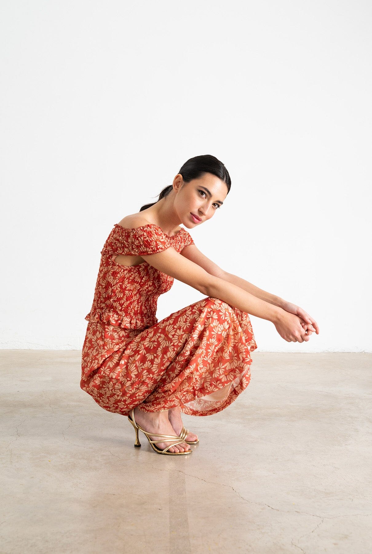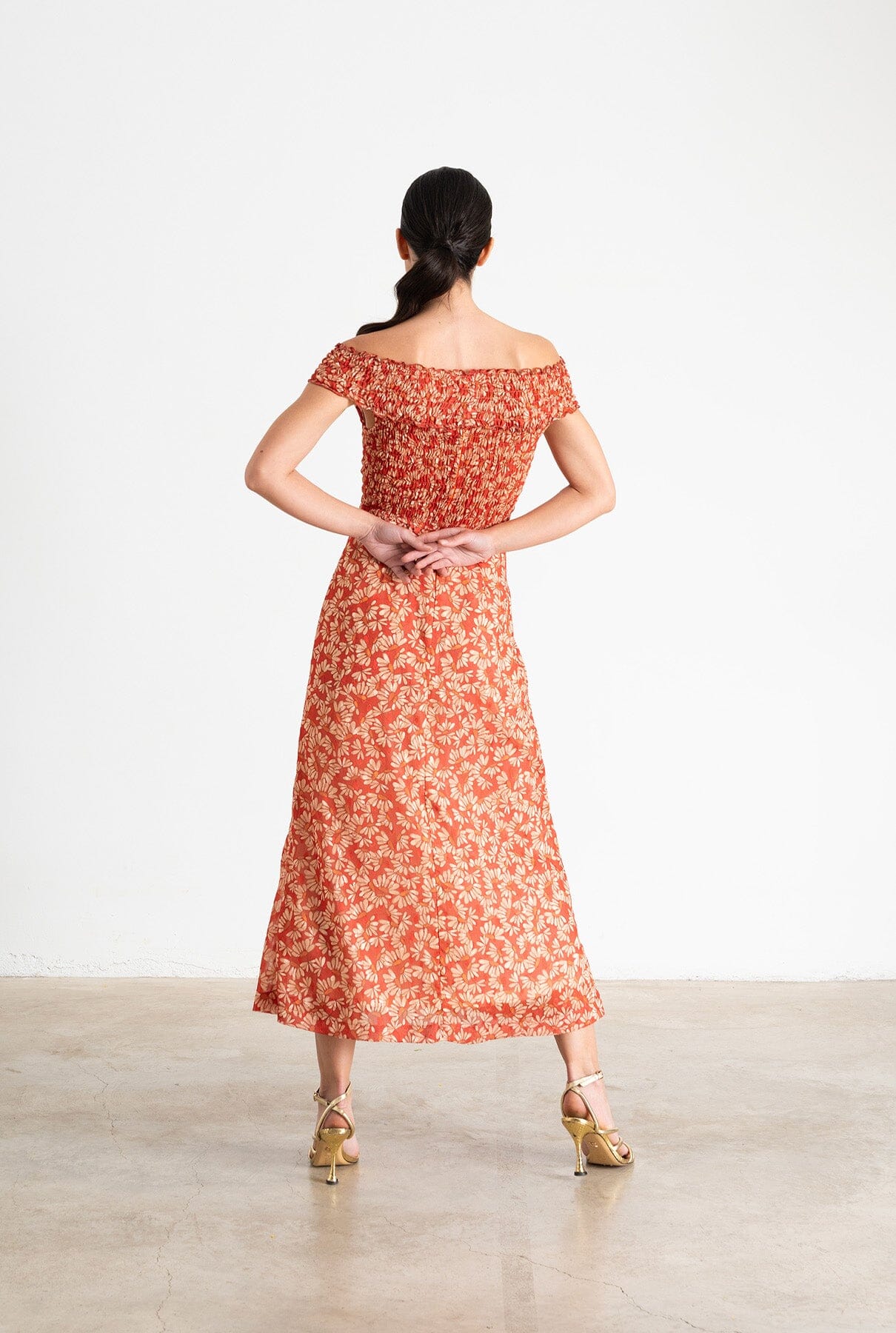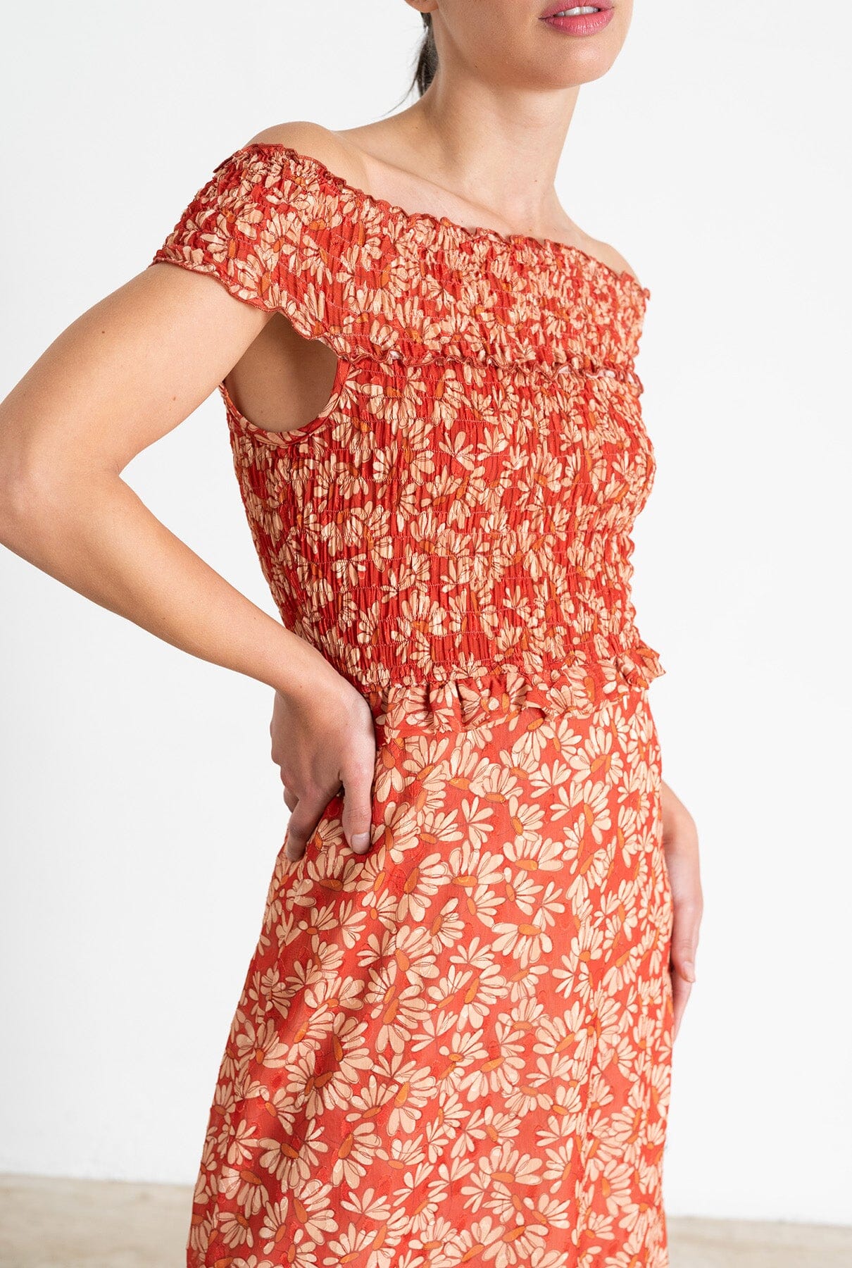Vestido midi en tejido estampado en tonos naranja y crudo. Escote bardot fruncido y cuerpo fruncido. Detalle de volante al final del fruncido, cierre en espalda con cremallera invisible y forro.