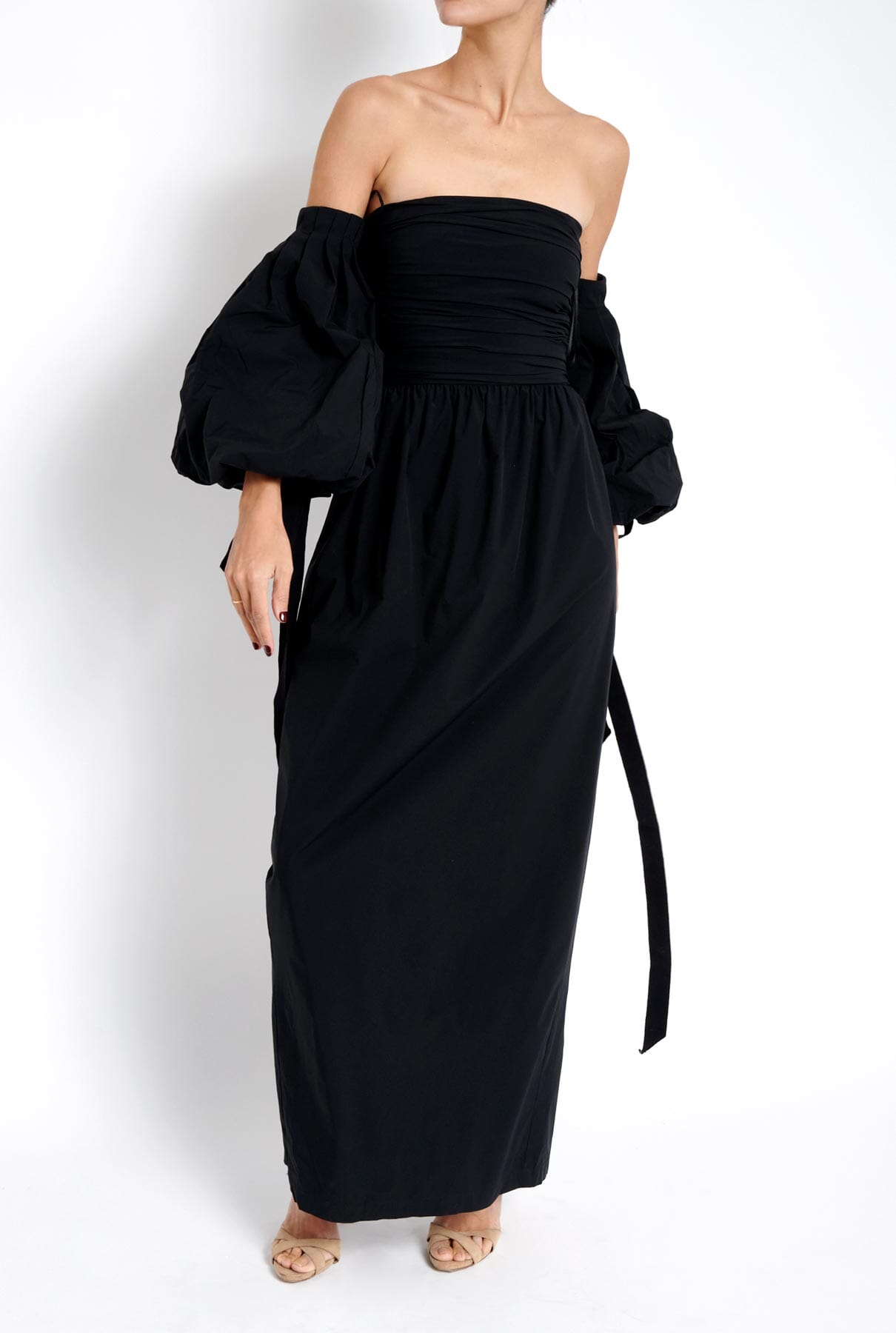 Maxi vestido elástico con corte en la cintura, top drapeado y falda fruncida con un suave volumen en la cintura. Manga globo XL extraíble con cinta de grosgrain negra a contraste en los puños.