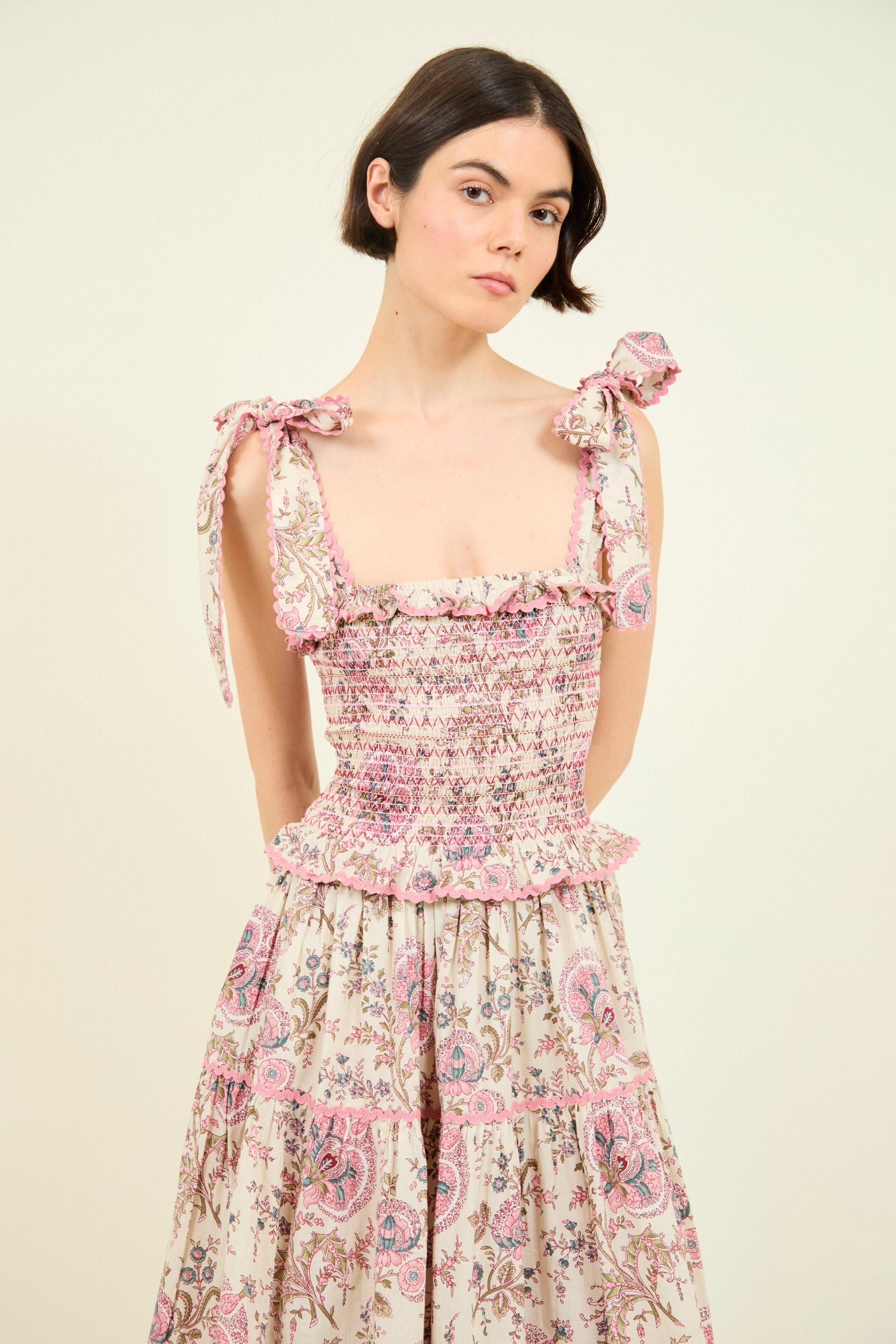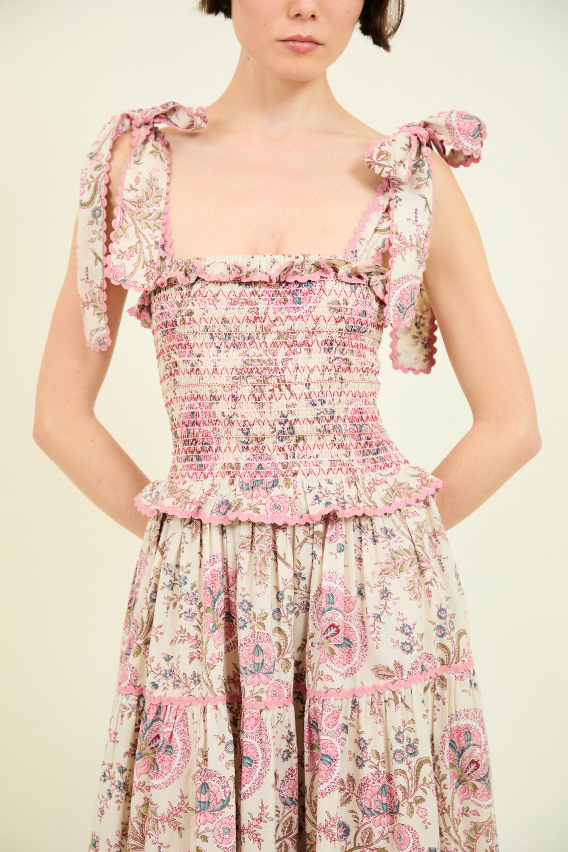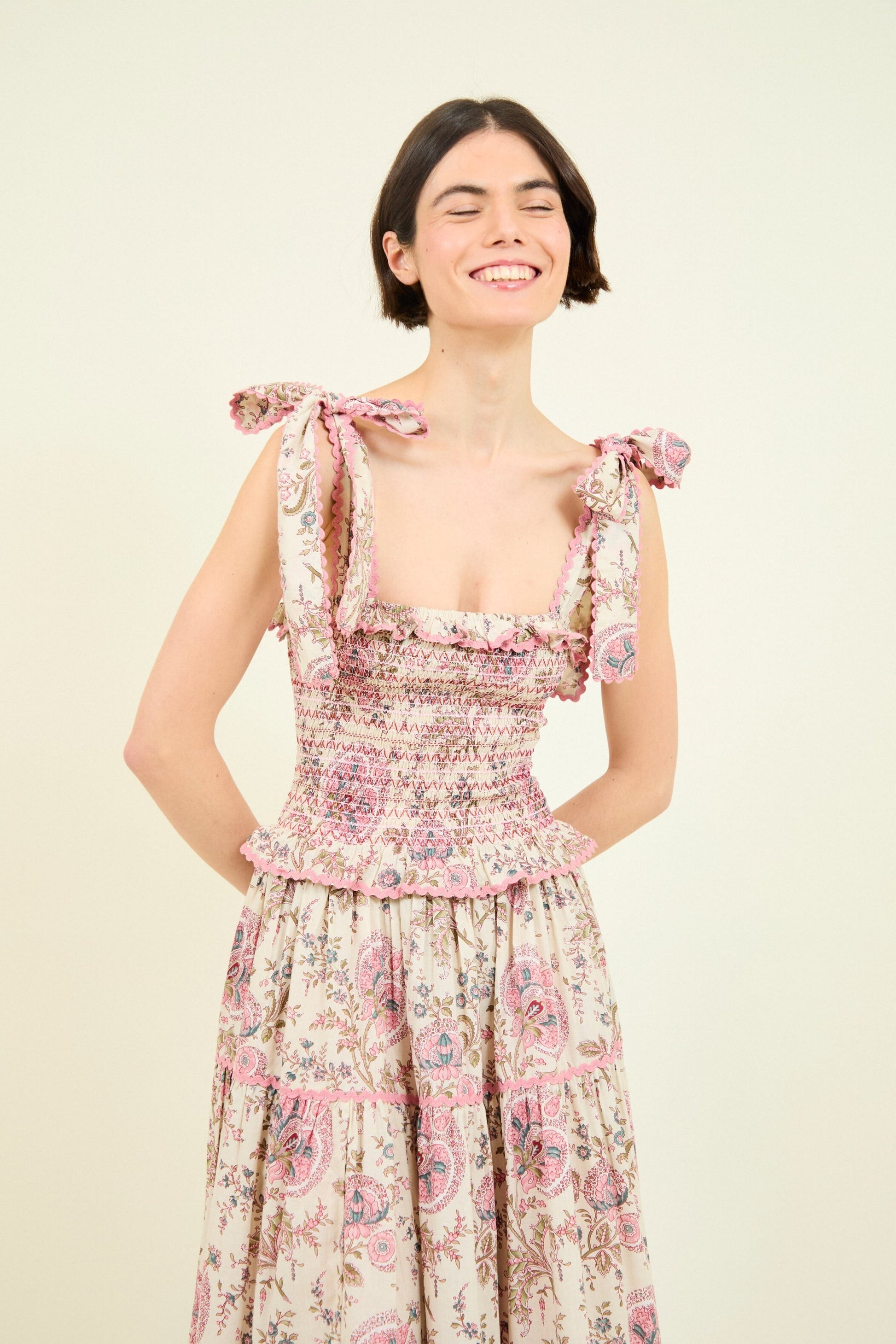 El vestido midi Melody en rosa es un romántico y femenino diseño sin tirantes inspirado en la tendencia cottagecore. Está confeccionado en 100 % algodón, un tejido ligero y suave, ideal para la temporada de primavera-verano. Presenta un delicado estampado floral, un corpiño ajustado de nido de abeja, tirantes ajustables y una falda con volantes.