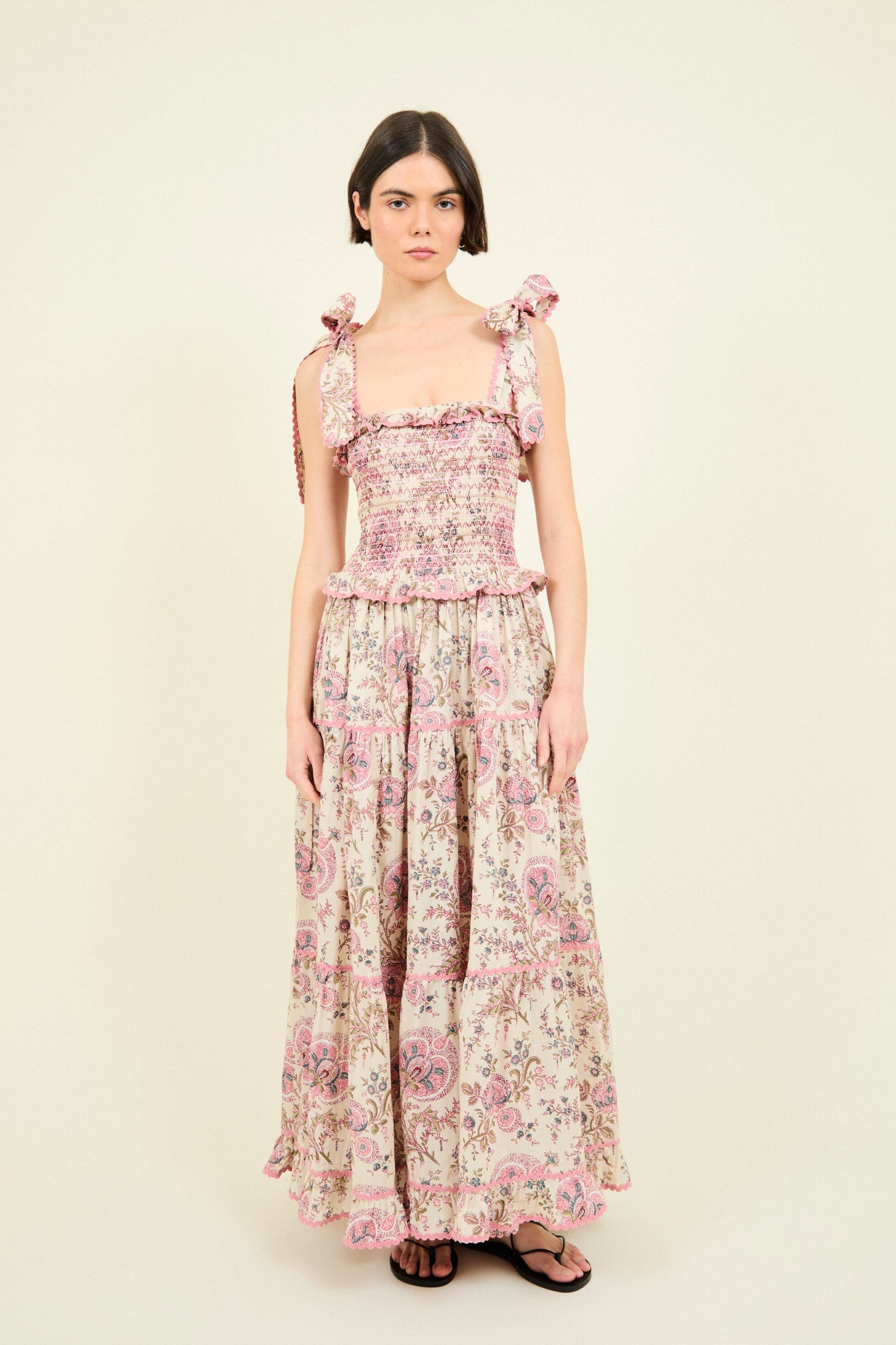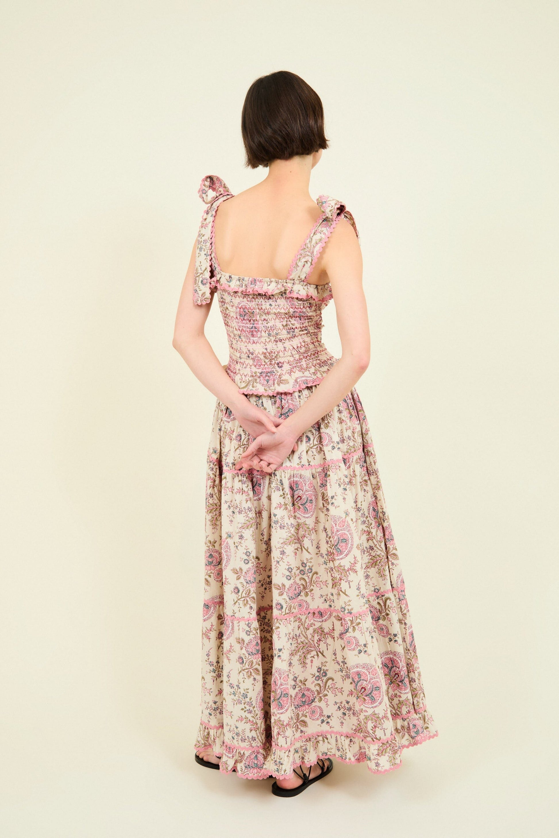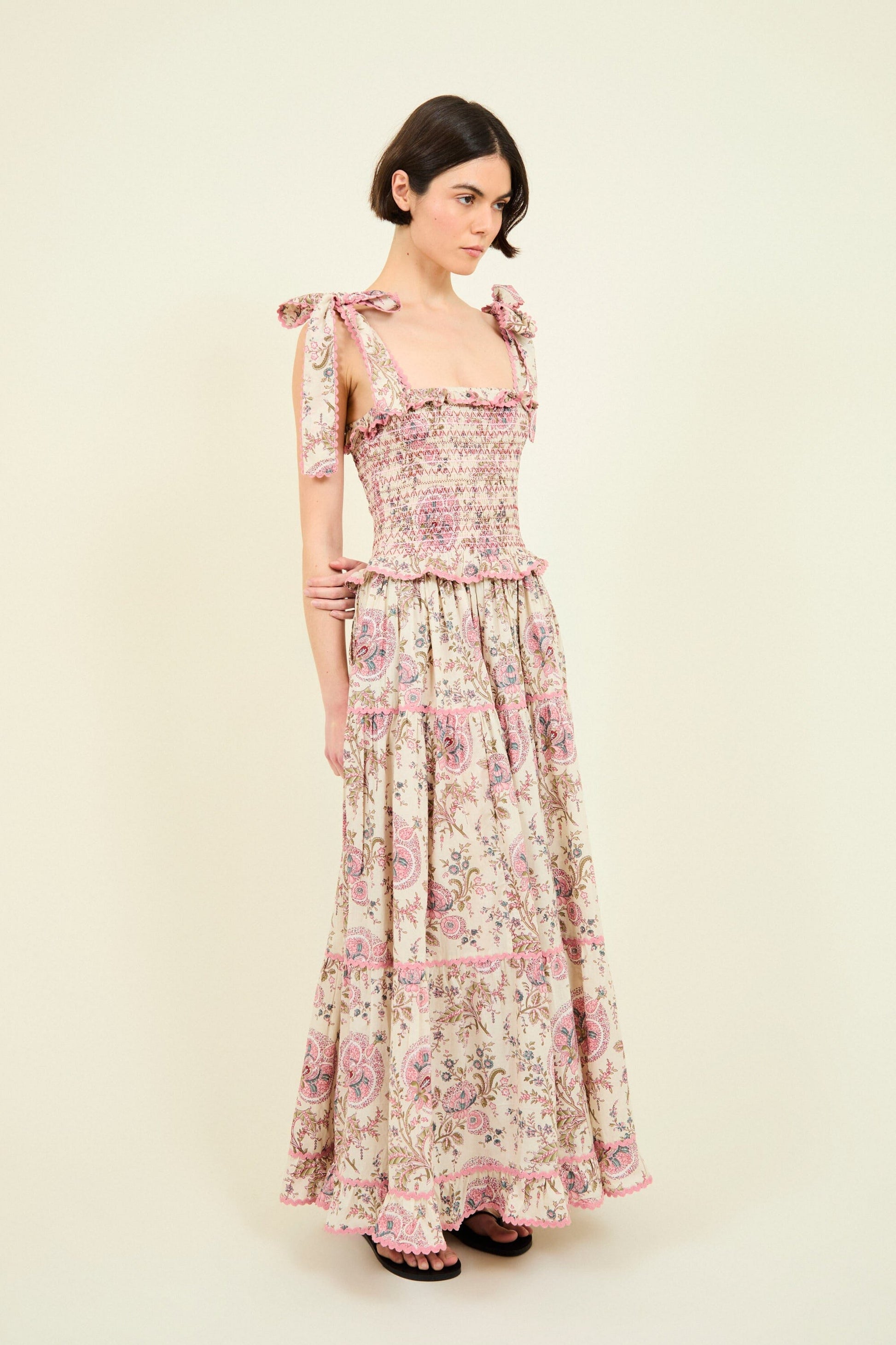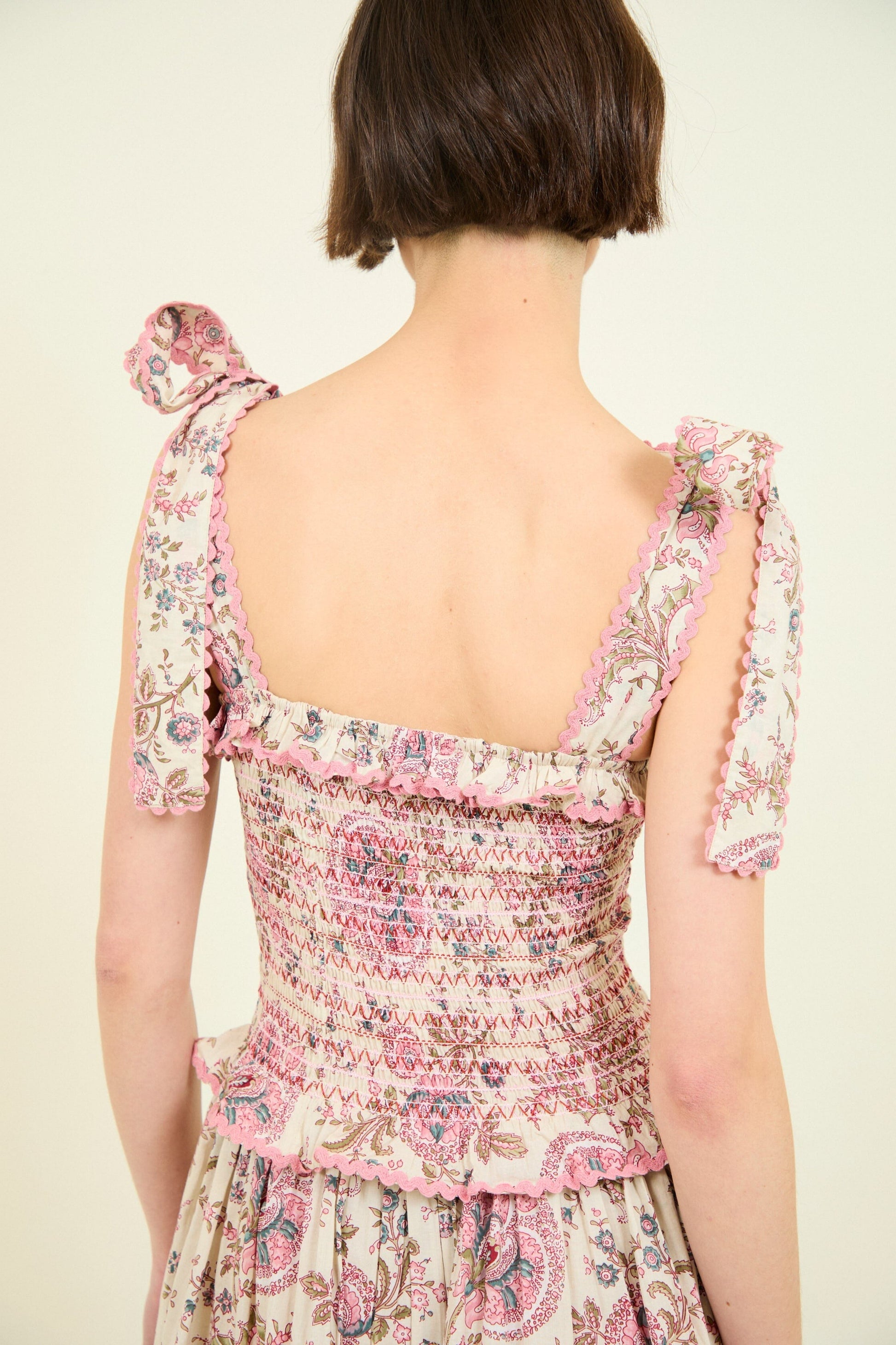 El vestido midi Melody en rosa es un romántico y femenino diseño sin tirantes inspirado en la tendencia cottagecore. Está confeccionado en 100 % algodón, un tejido ligero y suave, ideal para la temporada de primavera-verano. Presenta un delicado estampado floral, un corpiño ajustado de nido de abeja, tirantes ajustables y una falda con volantes.