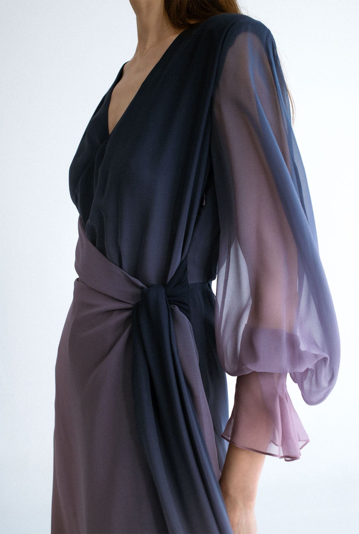 Vestido de la firma Miguel Marinero en georgette color grape degradado con azul. Ligero tejido que le aporta movimiento al original diseño camisero y bajo midi irregular. Vestido sofisticado para invitadas y ocasiones especiales.
