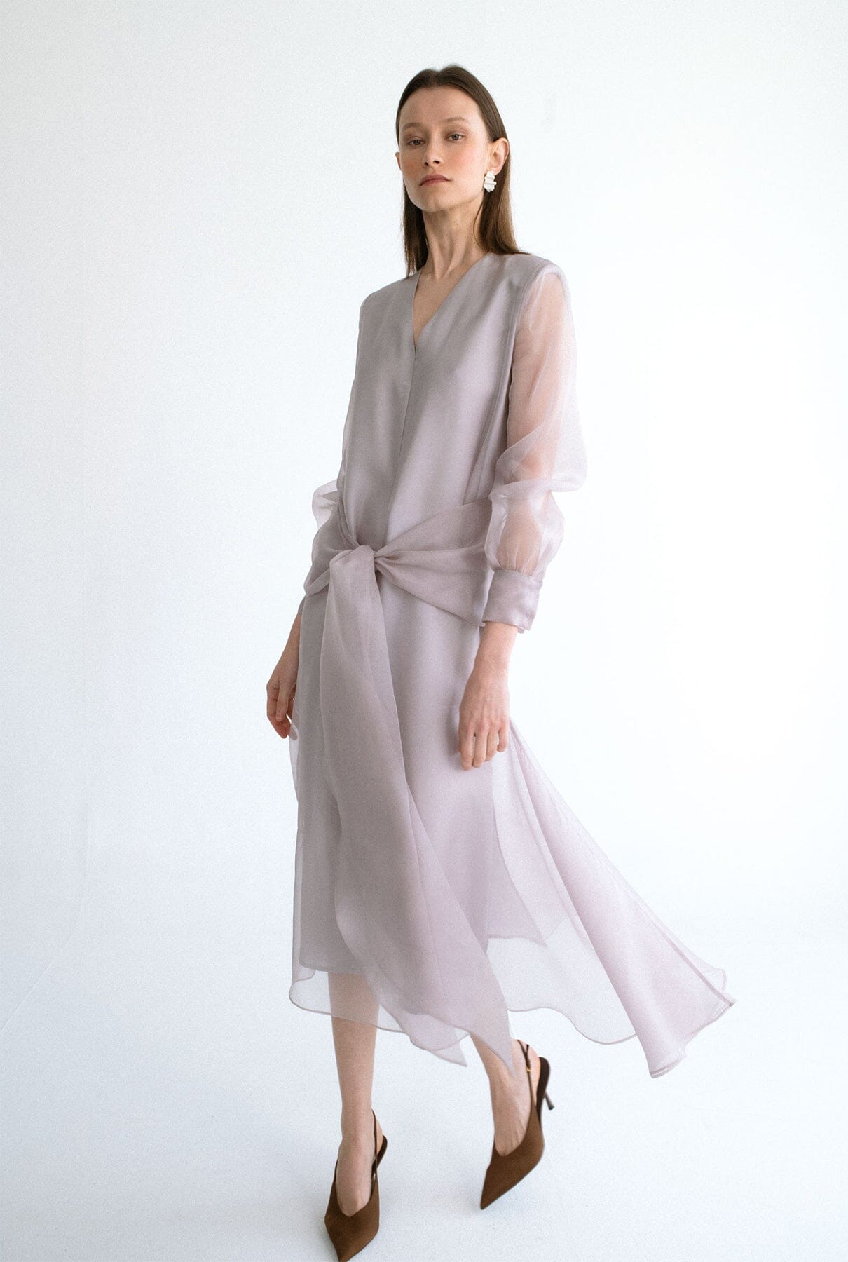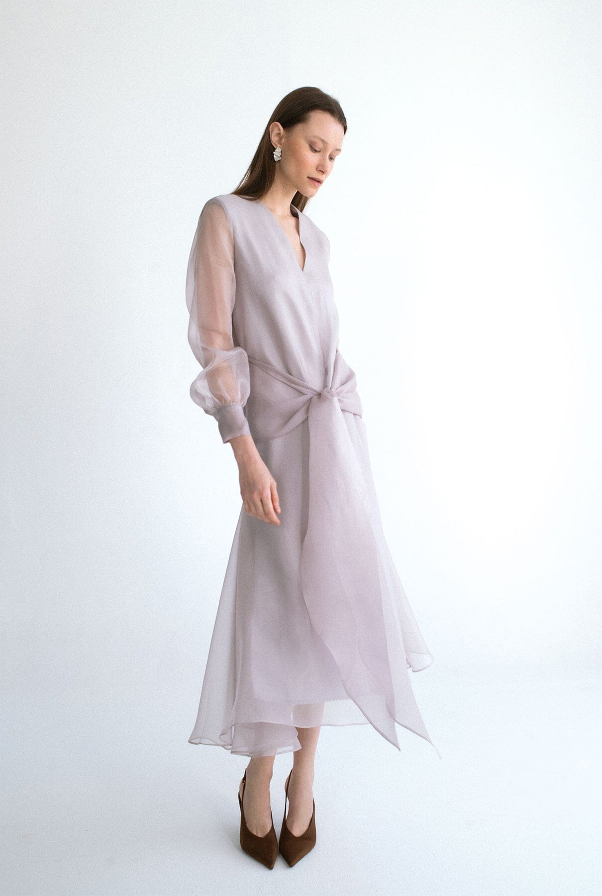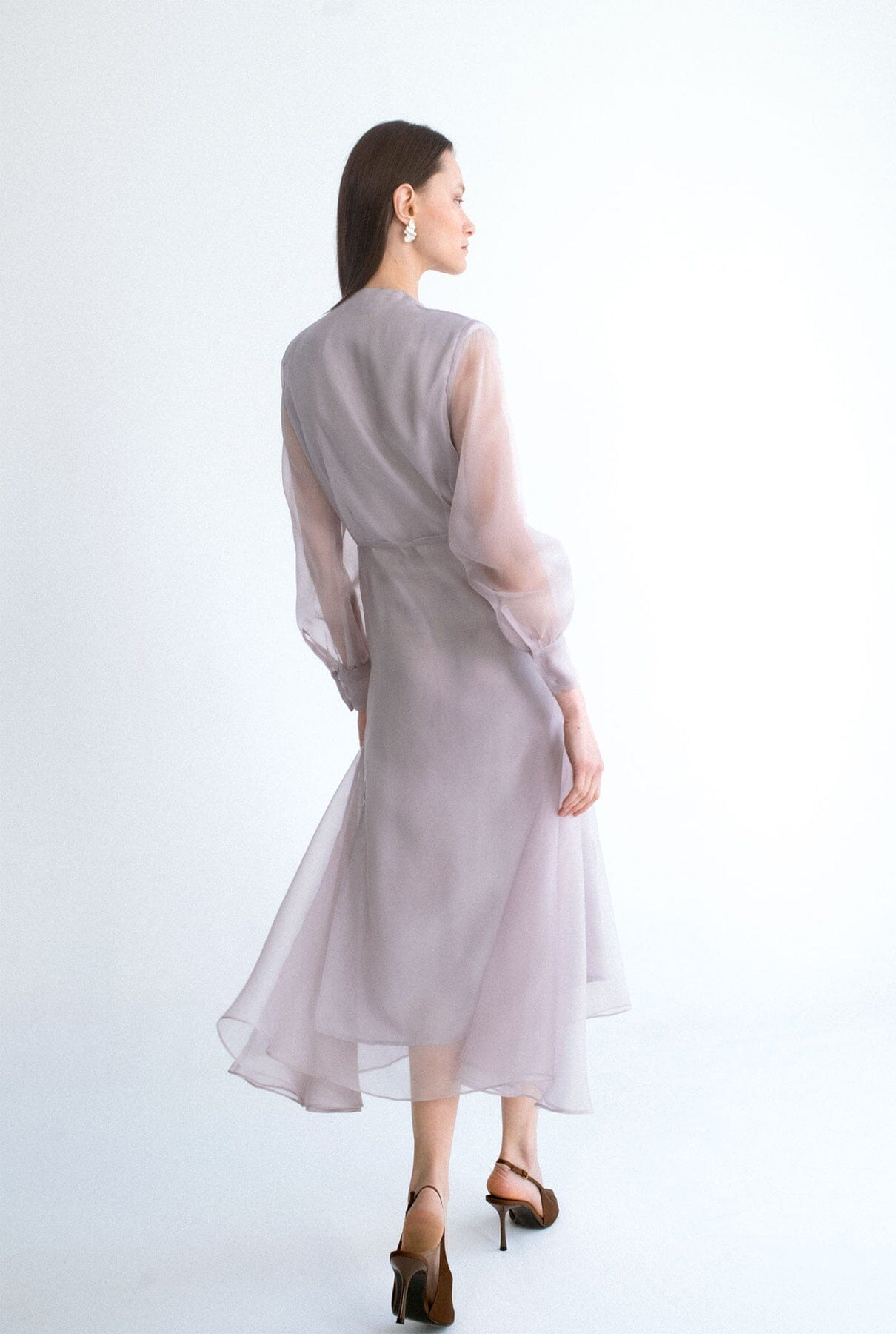 Vestido de la firma Miguel Marinero en ligera organza color malva grisaceo, tejido que le aporta movimiento al original diseño camisero, bajo midi irregular y mangas semi transparentes. Vestido sofisticado para invitadas y ocasiones especiales.