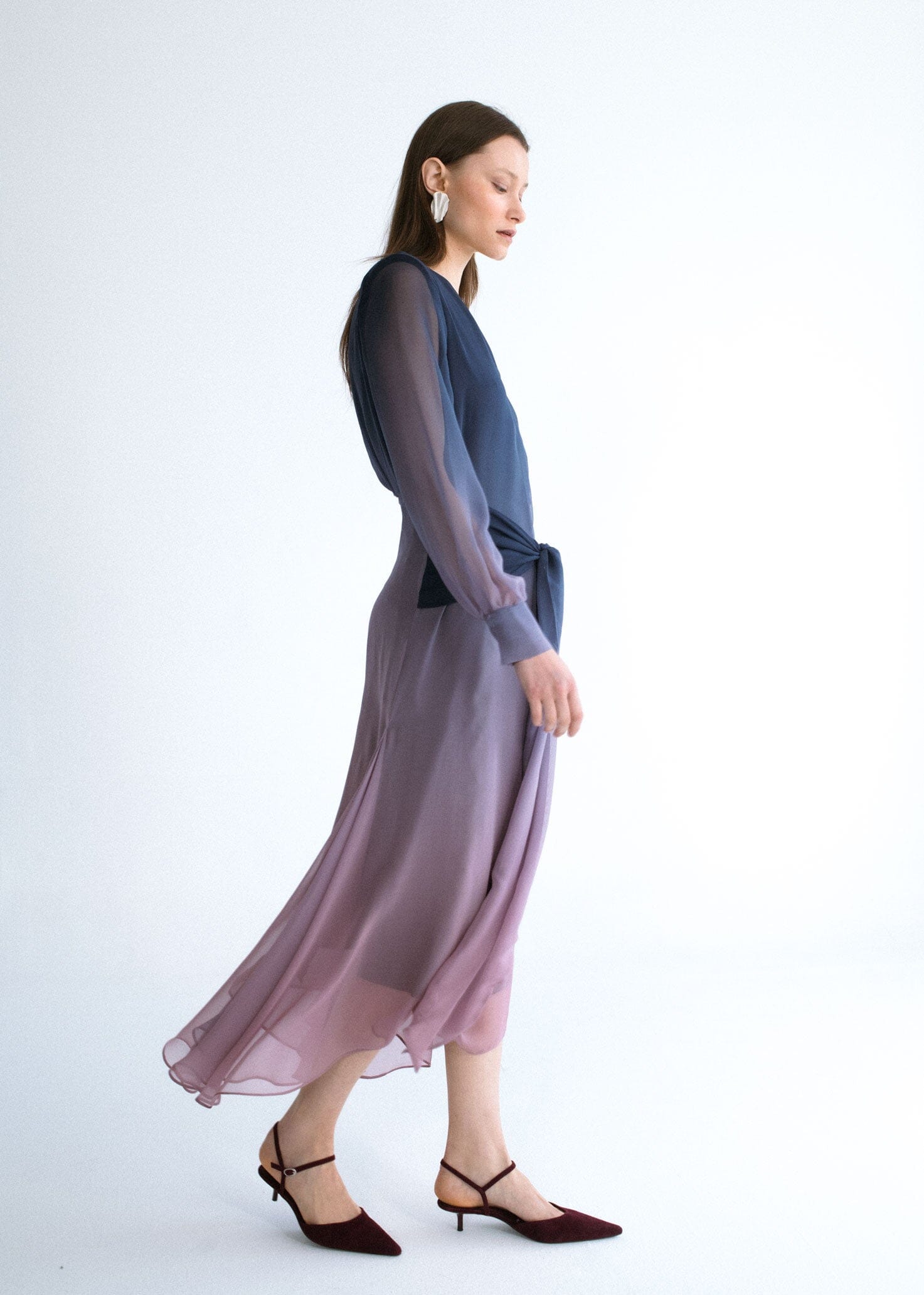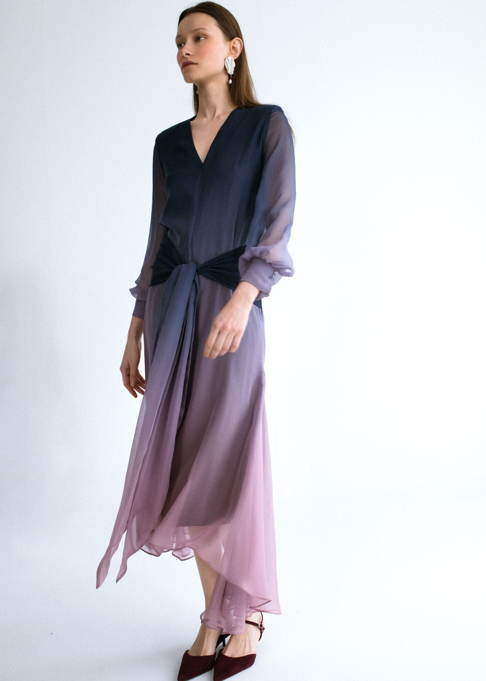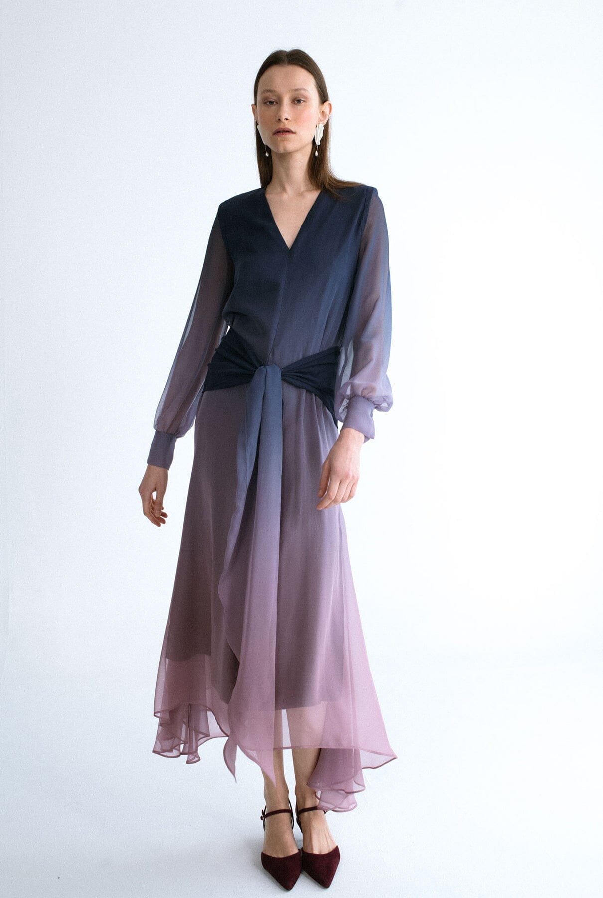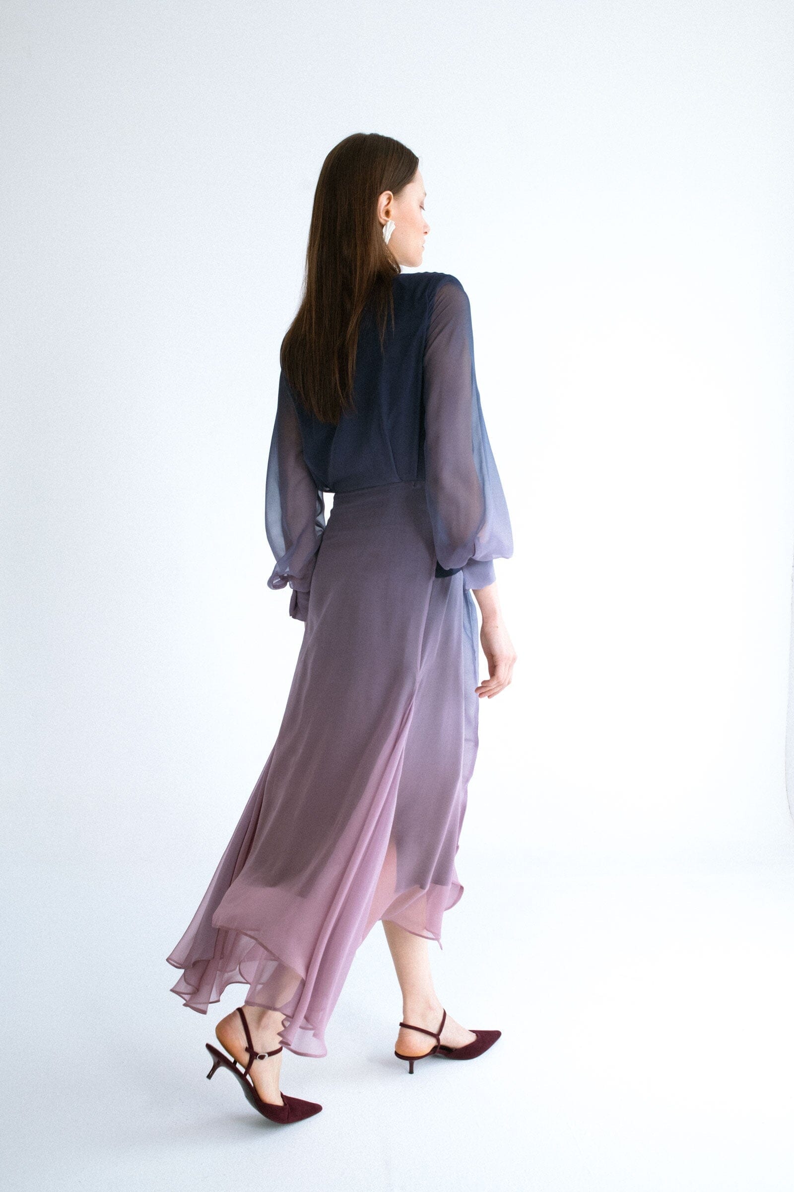 Vestido de la firma Miguel Marinero en georgette color azul y malva degradado. Ligero tejido que le aporta movimiento al original diseño cruzado con detalle en los puños, bajo midi asimétrico y mangas semitransparentes. Vestido sofisticado para invitadas y ocasiones especiales.