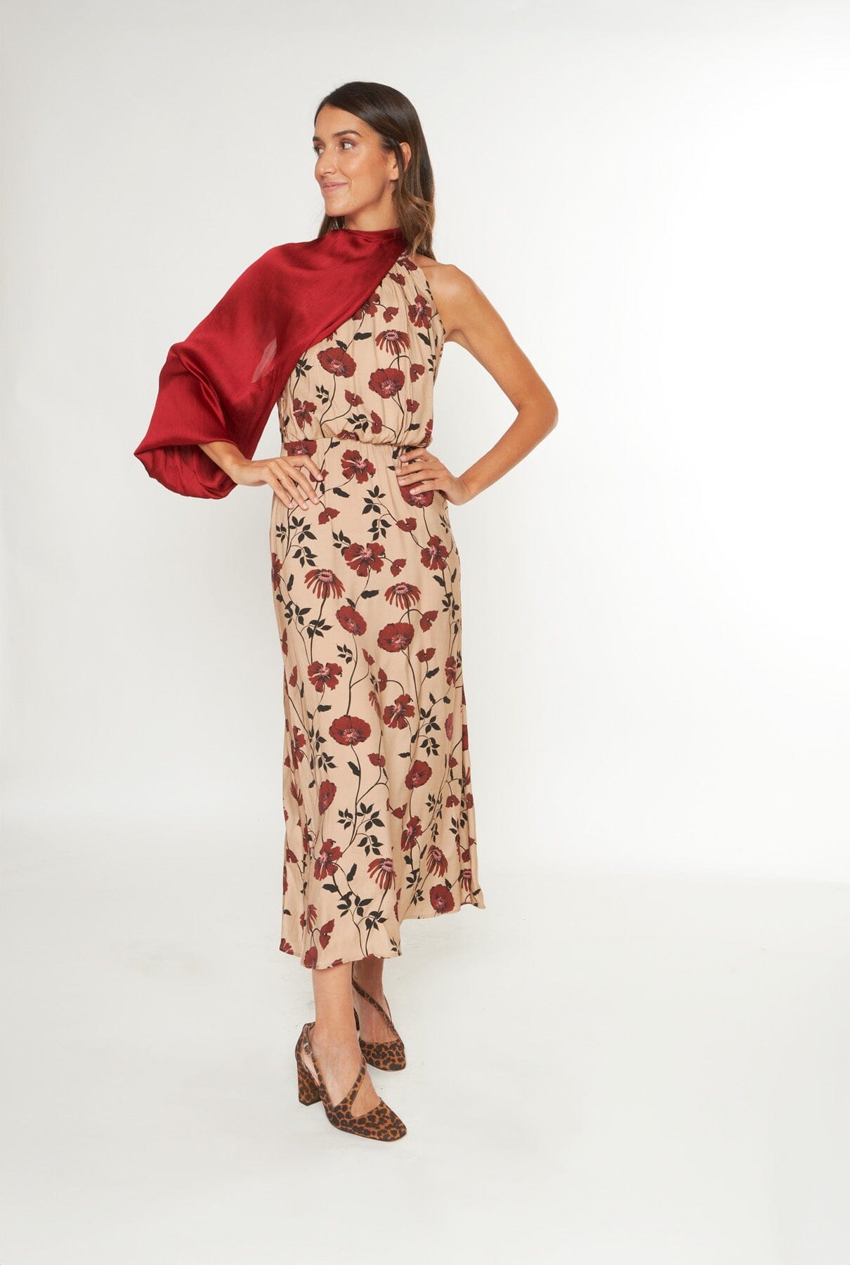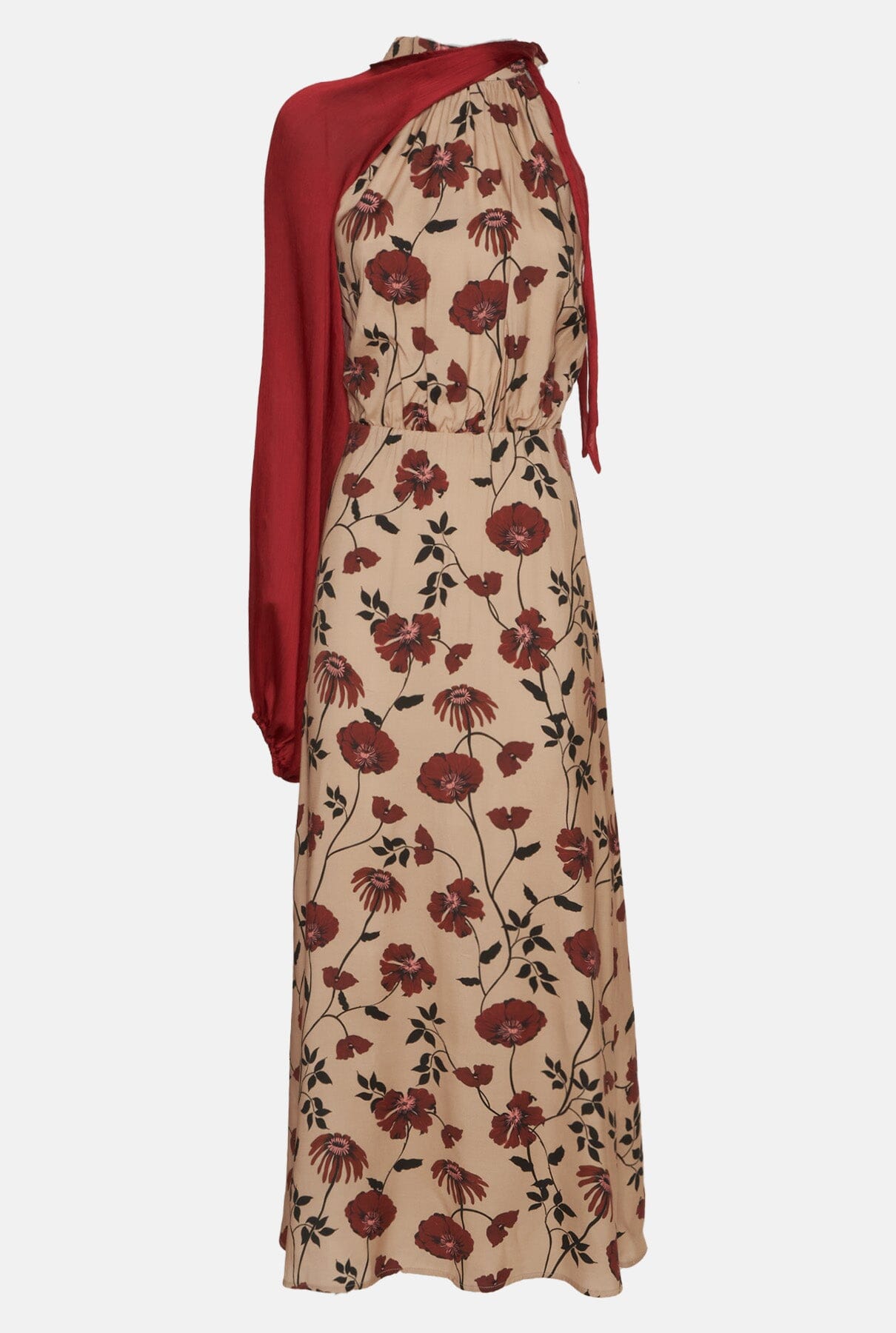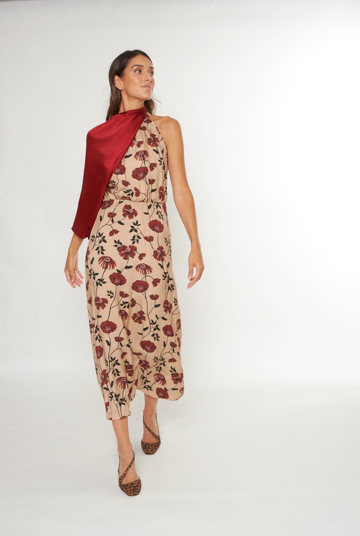 Vestido halter en tejido beige con estampado floral en tonos burdeos. Escote halter. Cierre en espalda con cremallera y lazo saliendo del cuello.