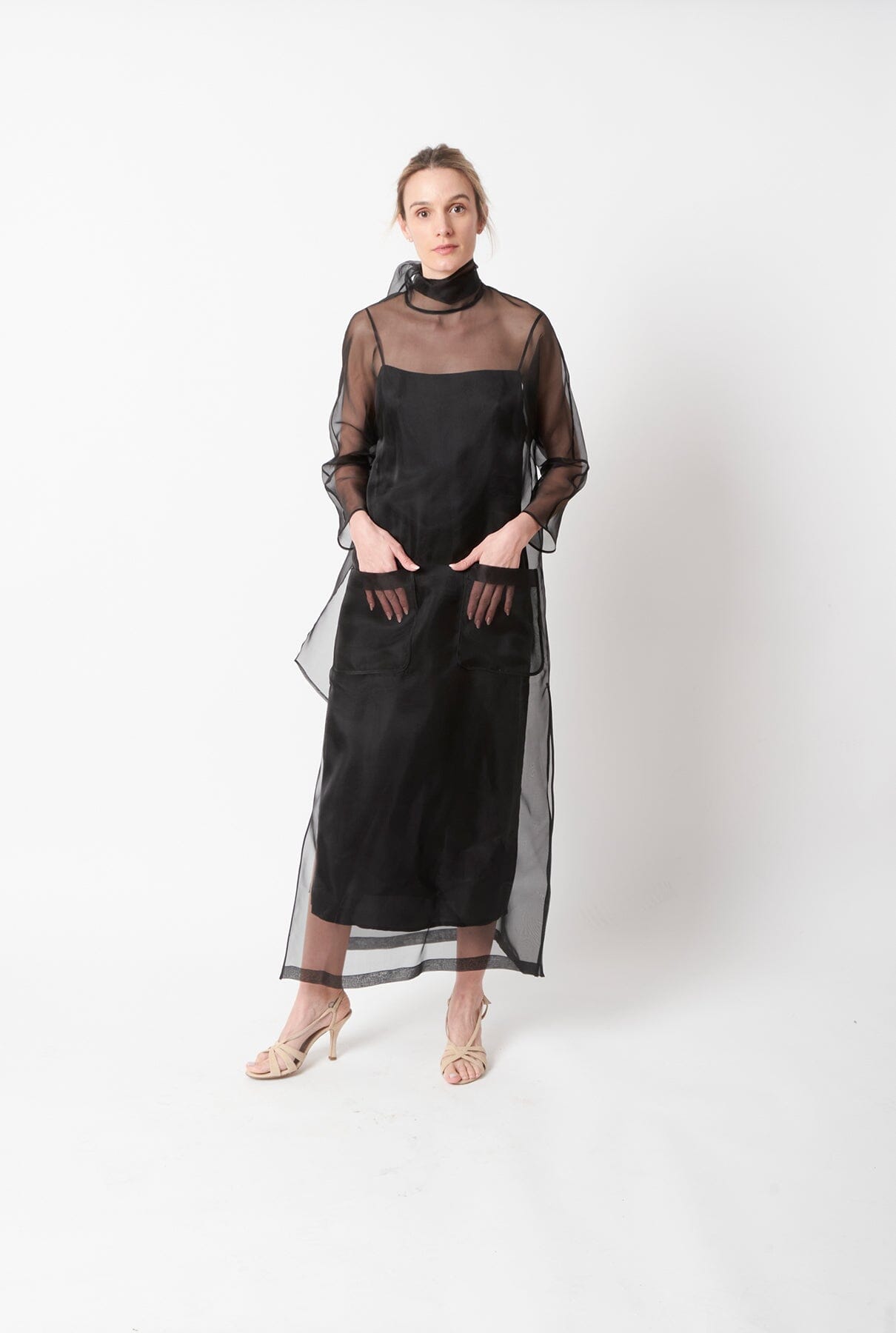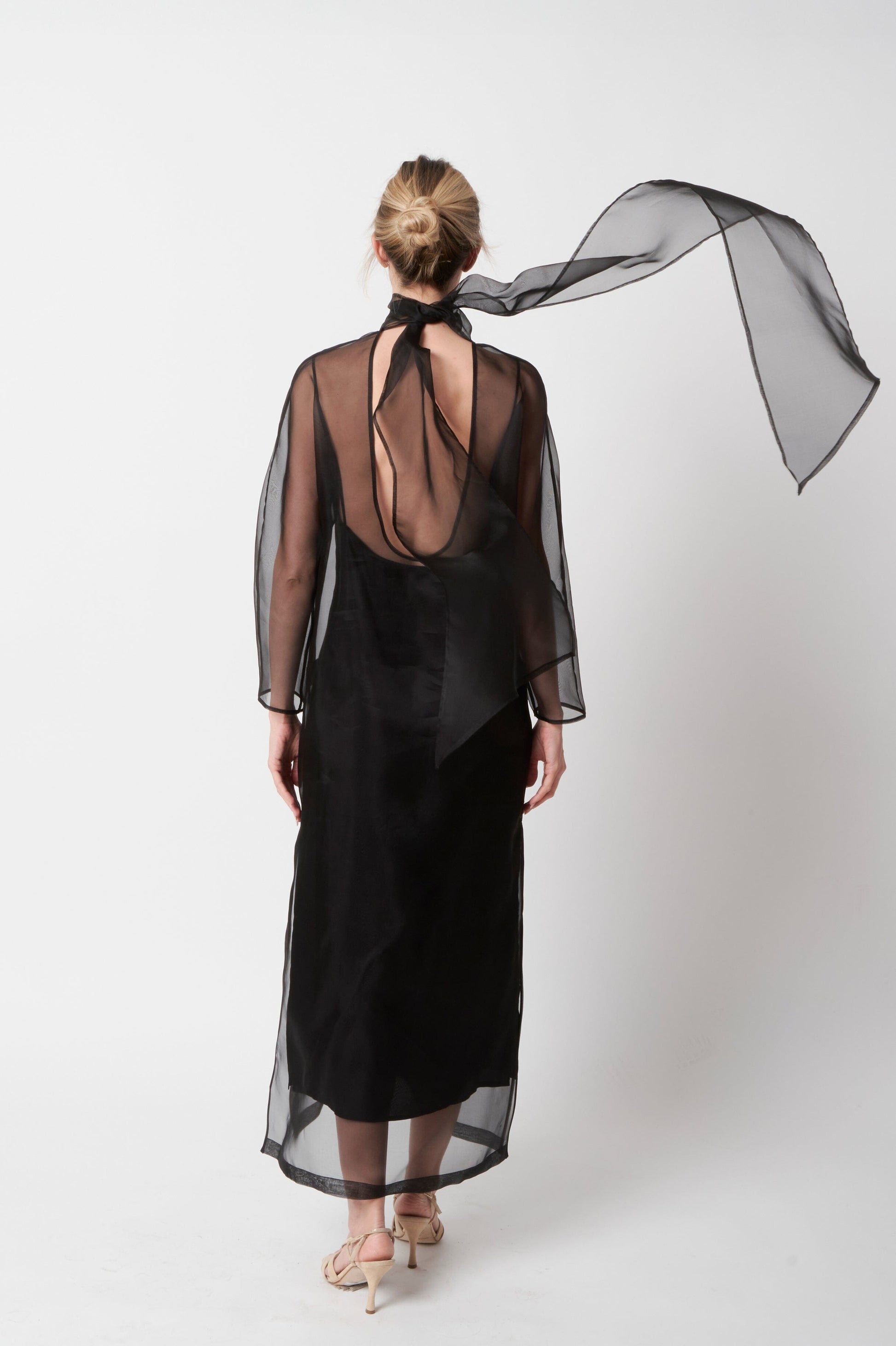 Wide cut tote dress in silk organza, high neck from which a bow is tied at the back. Front pockets. The dress comes in black and has a separate tone-on-tone lining.