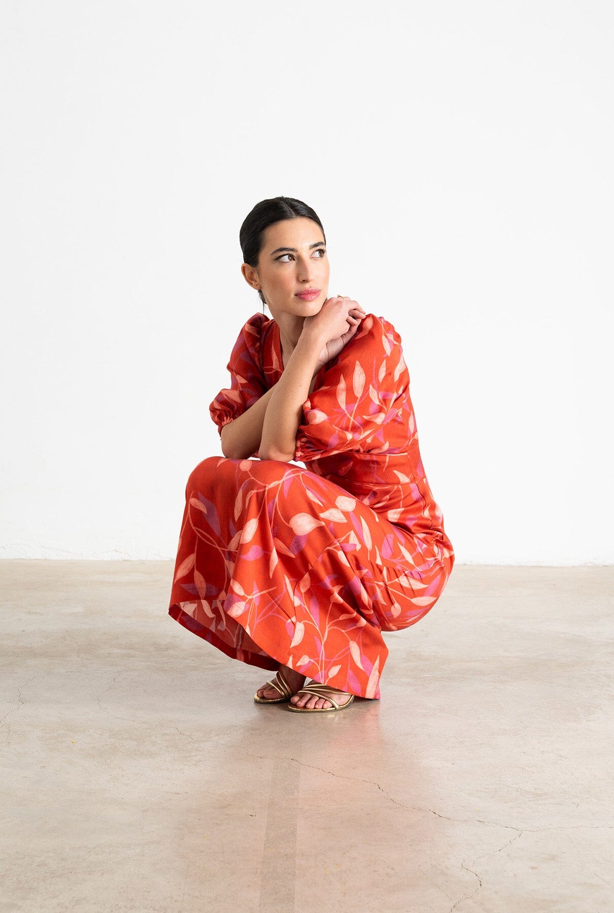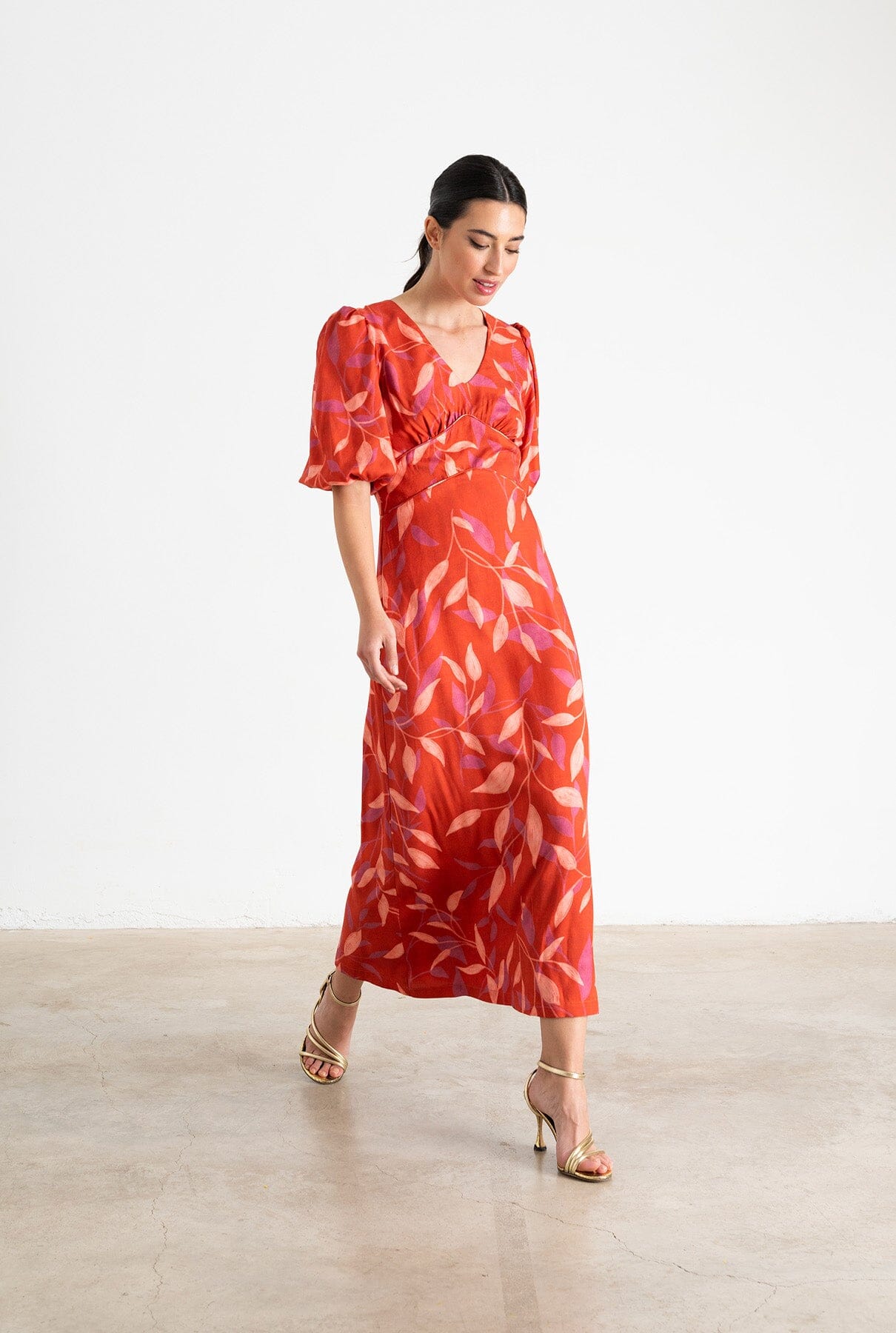 Vestido midi en tejido estampado en tonos rojos y beige. Escote en pico con abertura bajo el pecho. Mangas midi con elástico en el extremo para ajustarla a la medida deseada. Cierre en espalda con cremallera invisible.