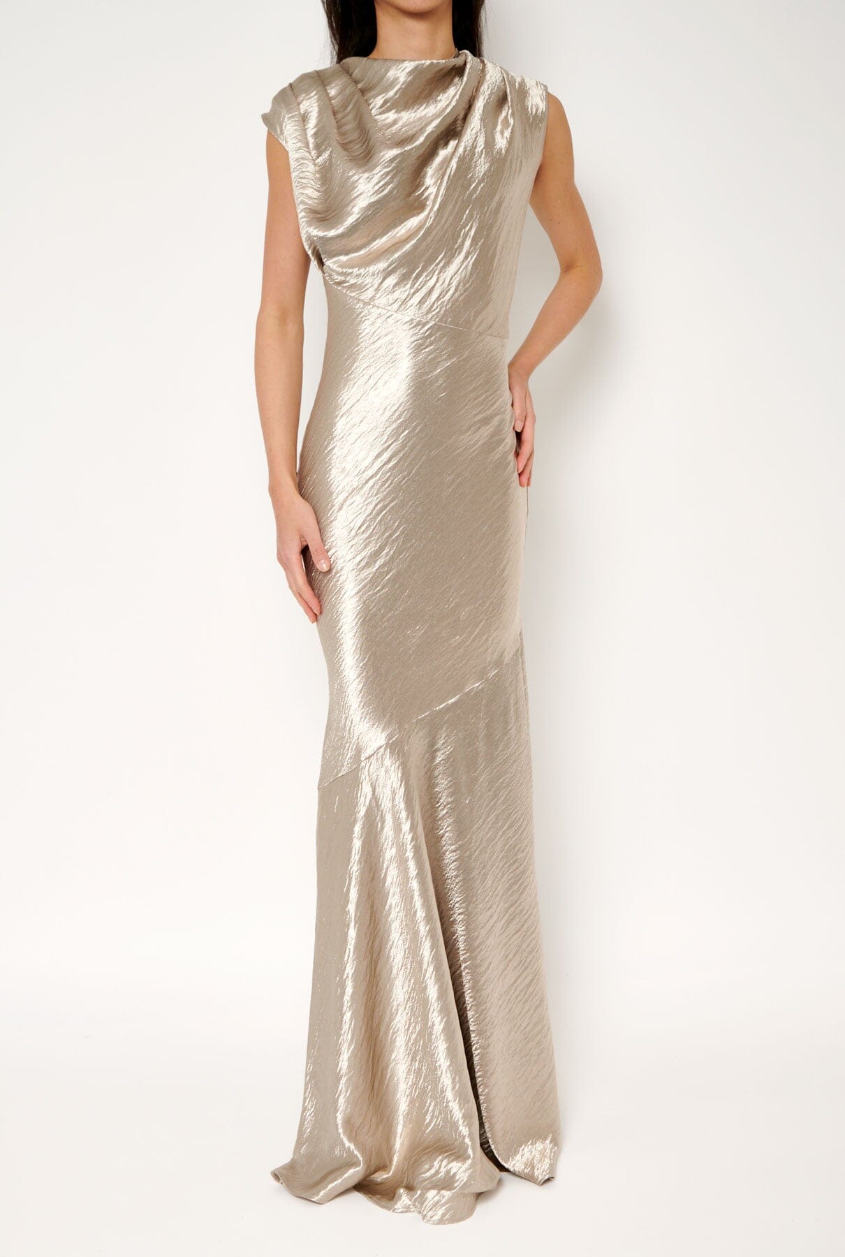 Vestido largo Venus en tejido plateado. Espalda en forma de lágrima.