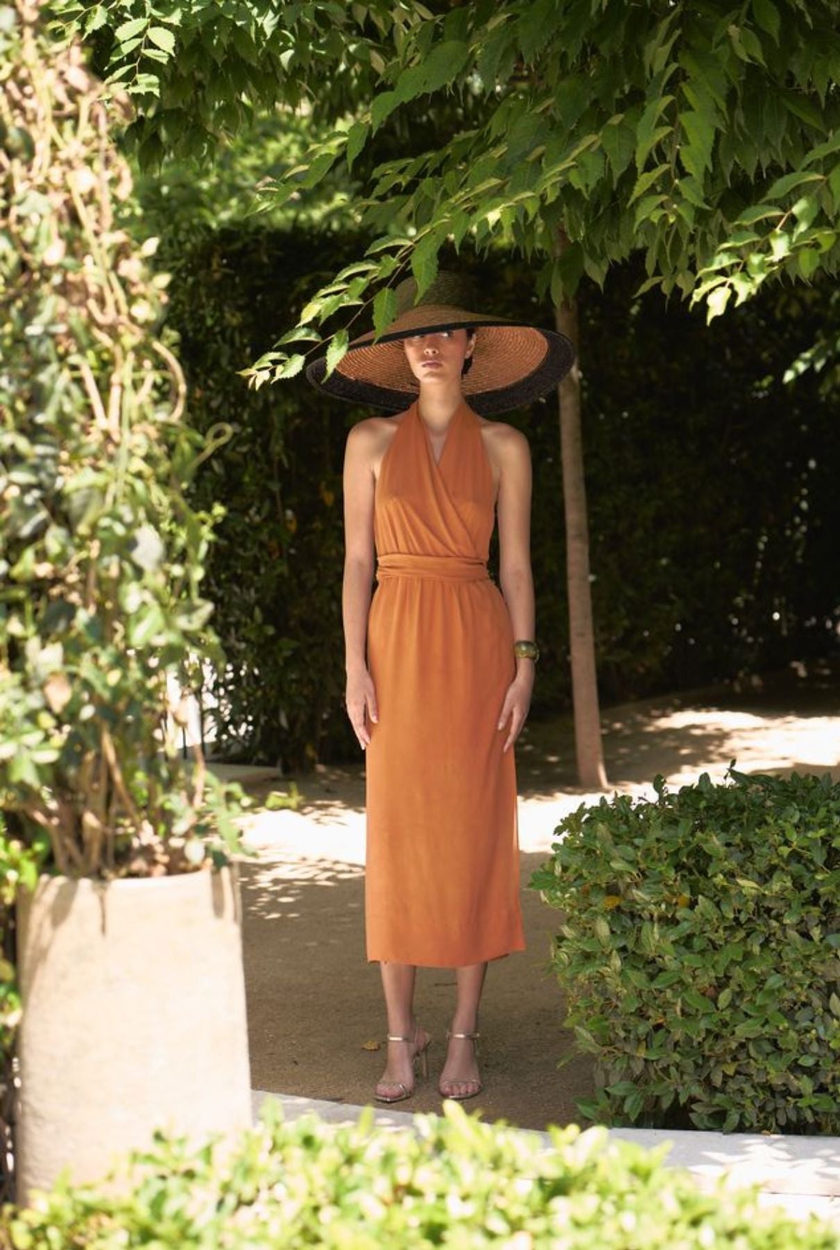 Vestido cruzado con cinturilla ajustable y espalda abierta.