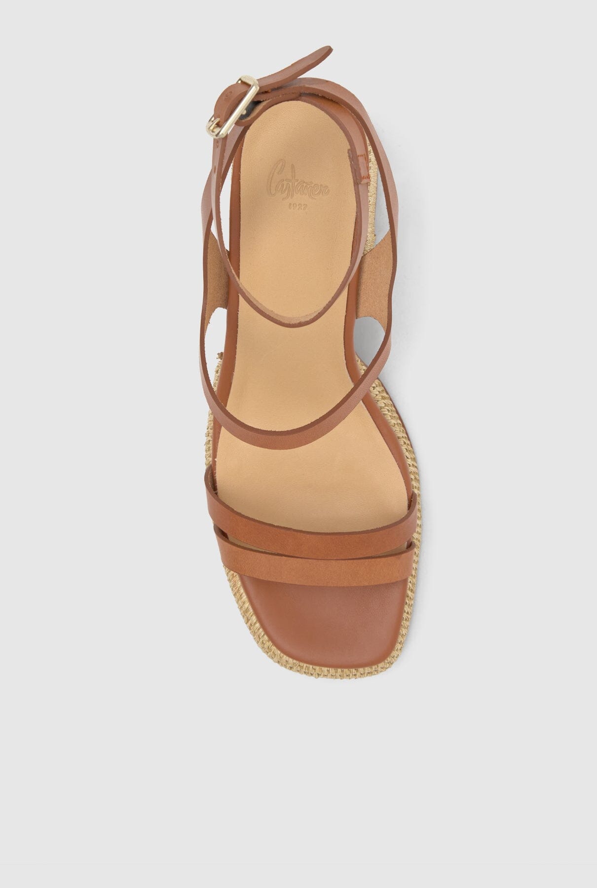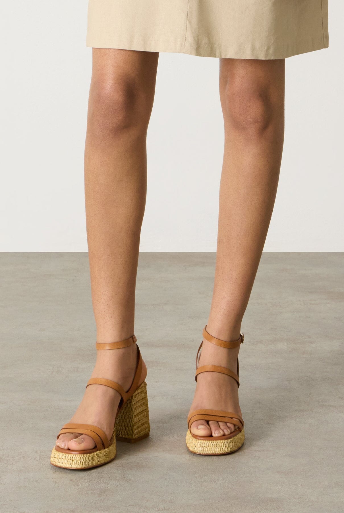 Sandalia Victoria de piel napa con cierre de pulsera, plantilla acolchada y tacón de 10cm forrado de rafia trenzada.