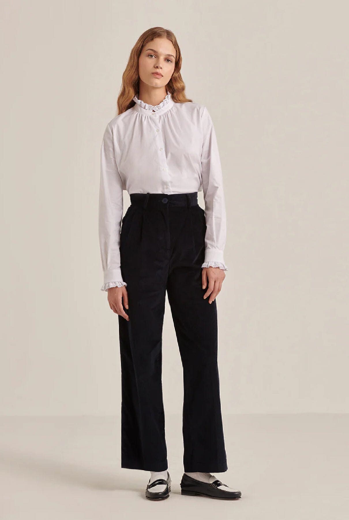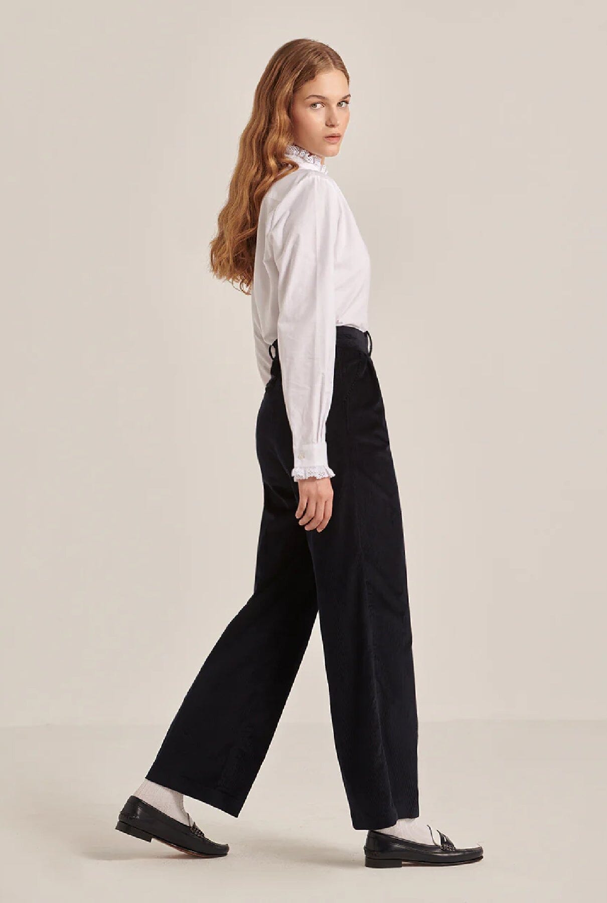 Pantalón de pinzas de pana de algodón azul marino con trabillas para cinturón en la parte trasera.
