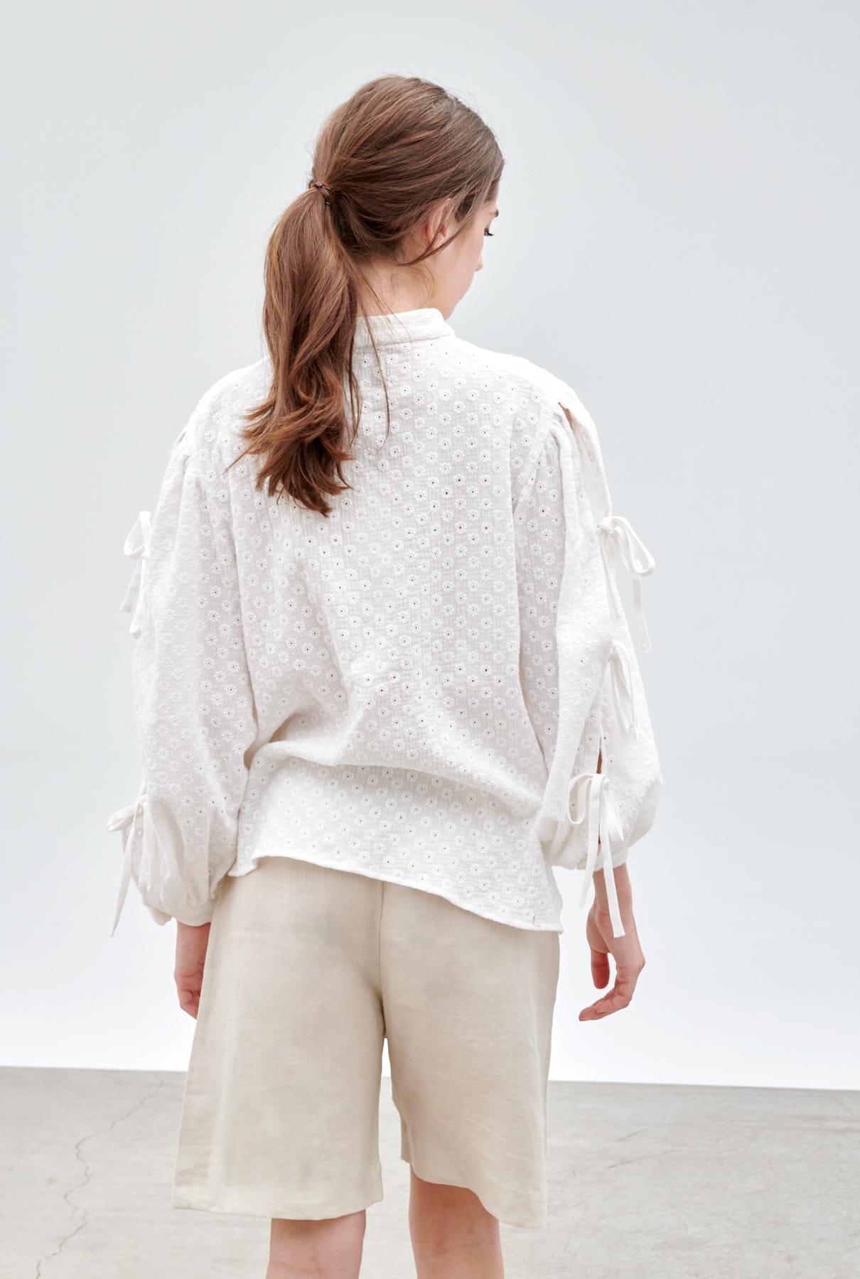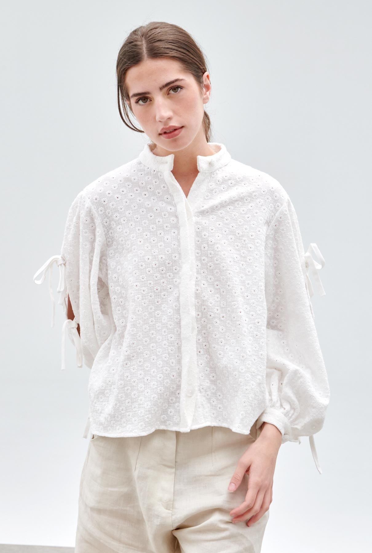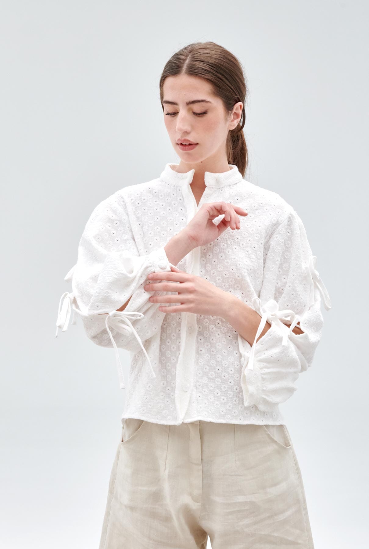 Camisa con detalle de cordones anudados en las mangas. Mangas largas y puños elásticos. Cierre frontal con botones. Lavar a mano, planchar a baja temperatura, no usar secadora ni lejía.