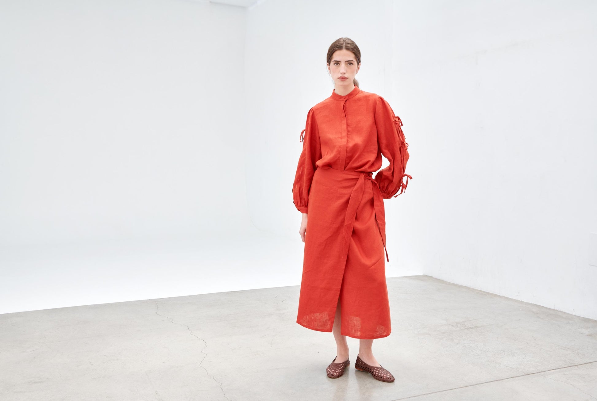 Camisa con detalle de cordones anudados en las mangas. Mangas largas y puños elásticos. Cierre frontal con botones. Lavar a mano, planchar a baja temperatura, no usar secadora ni lejía.