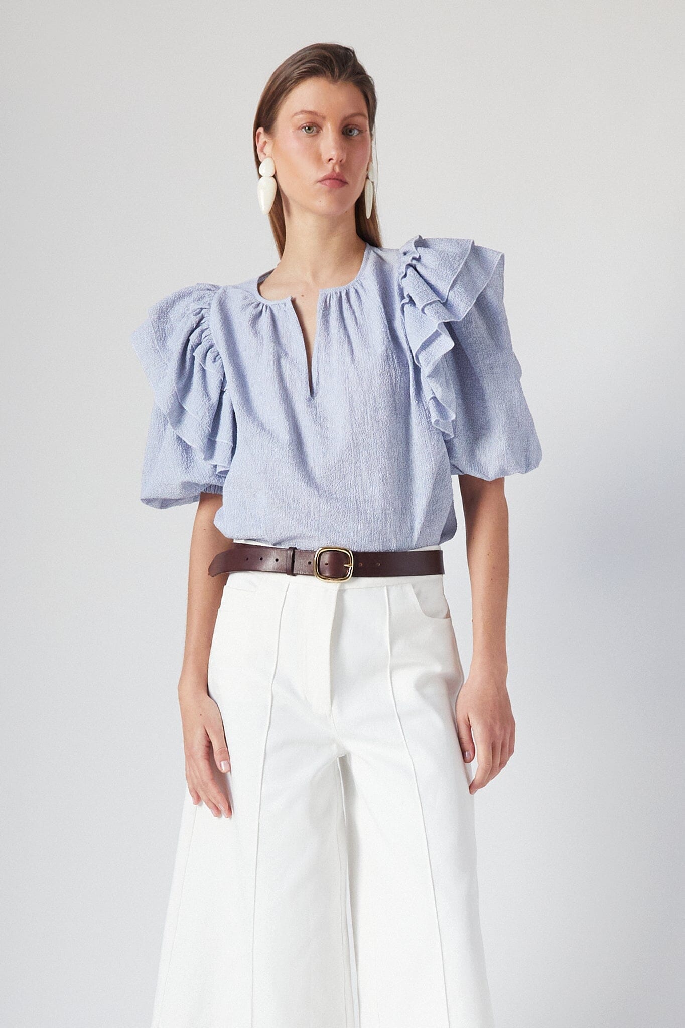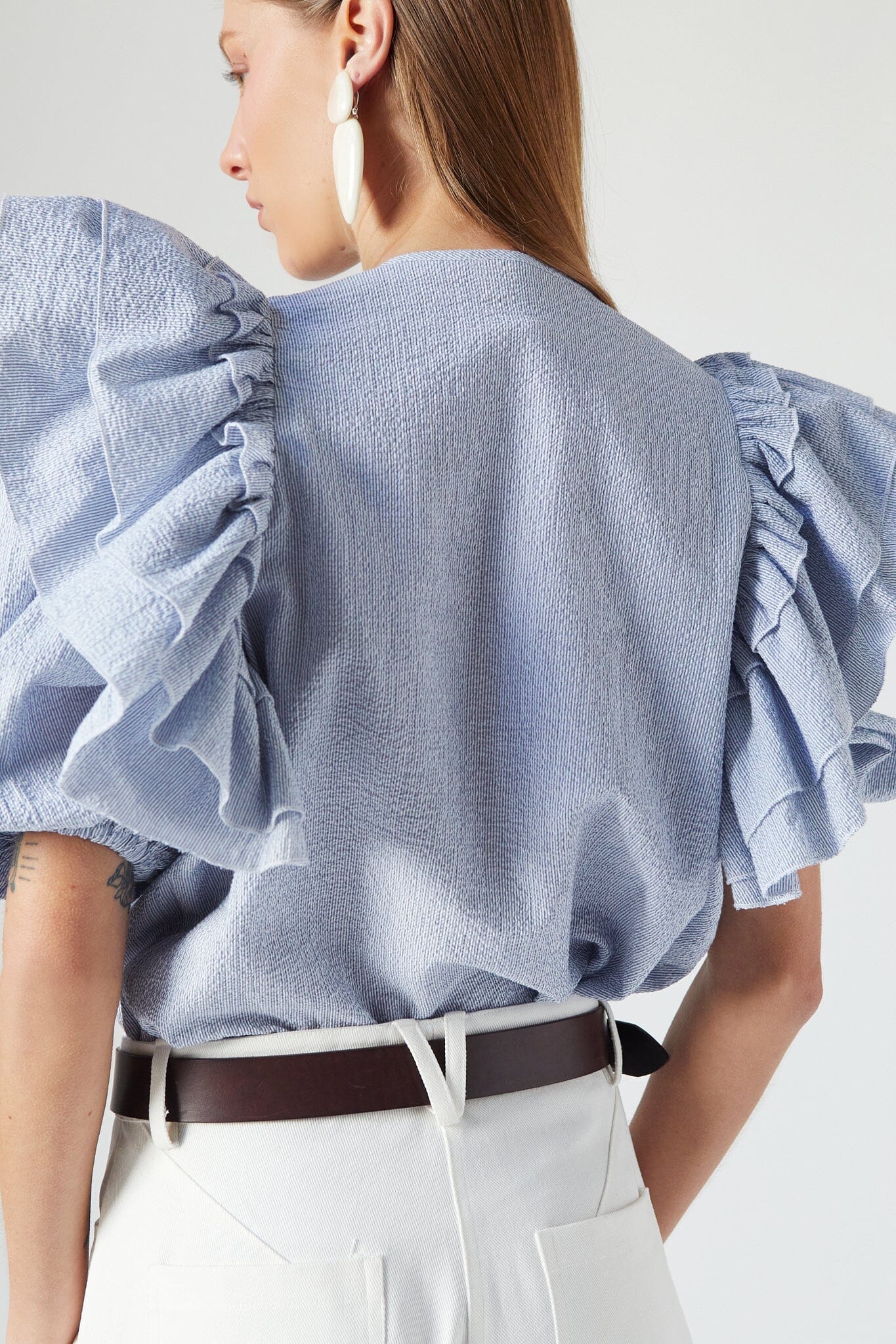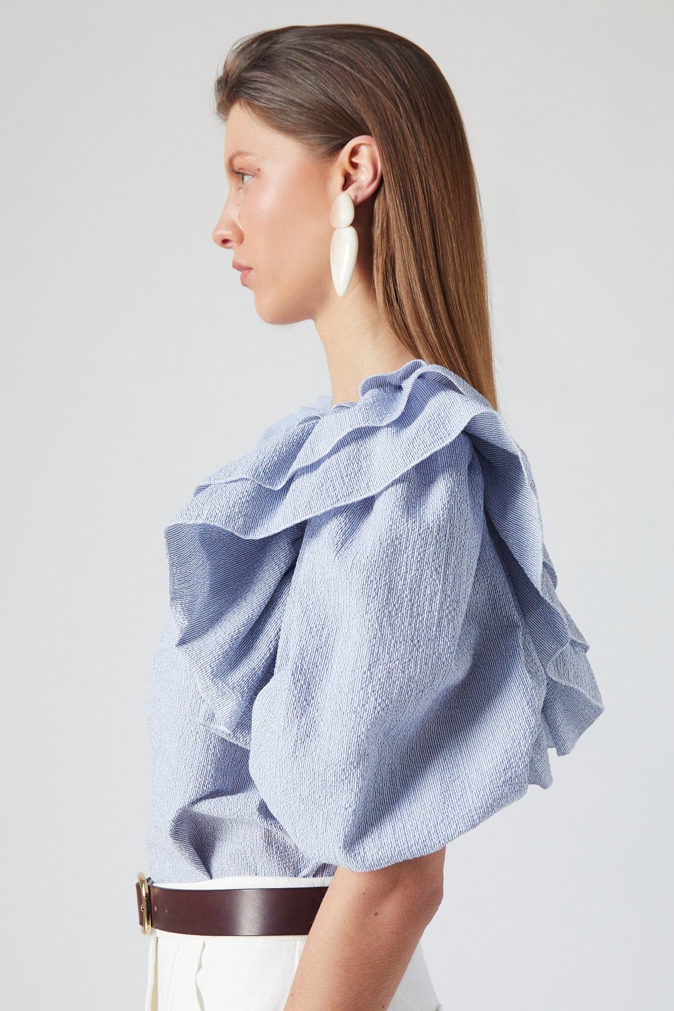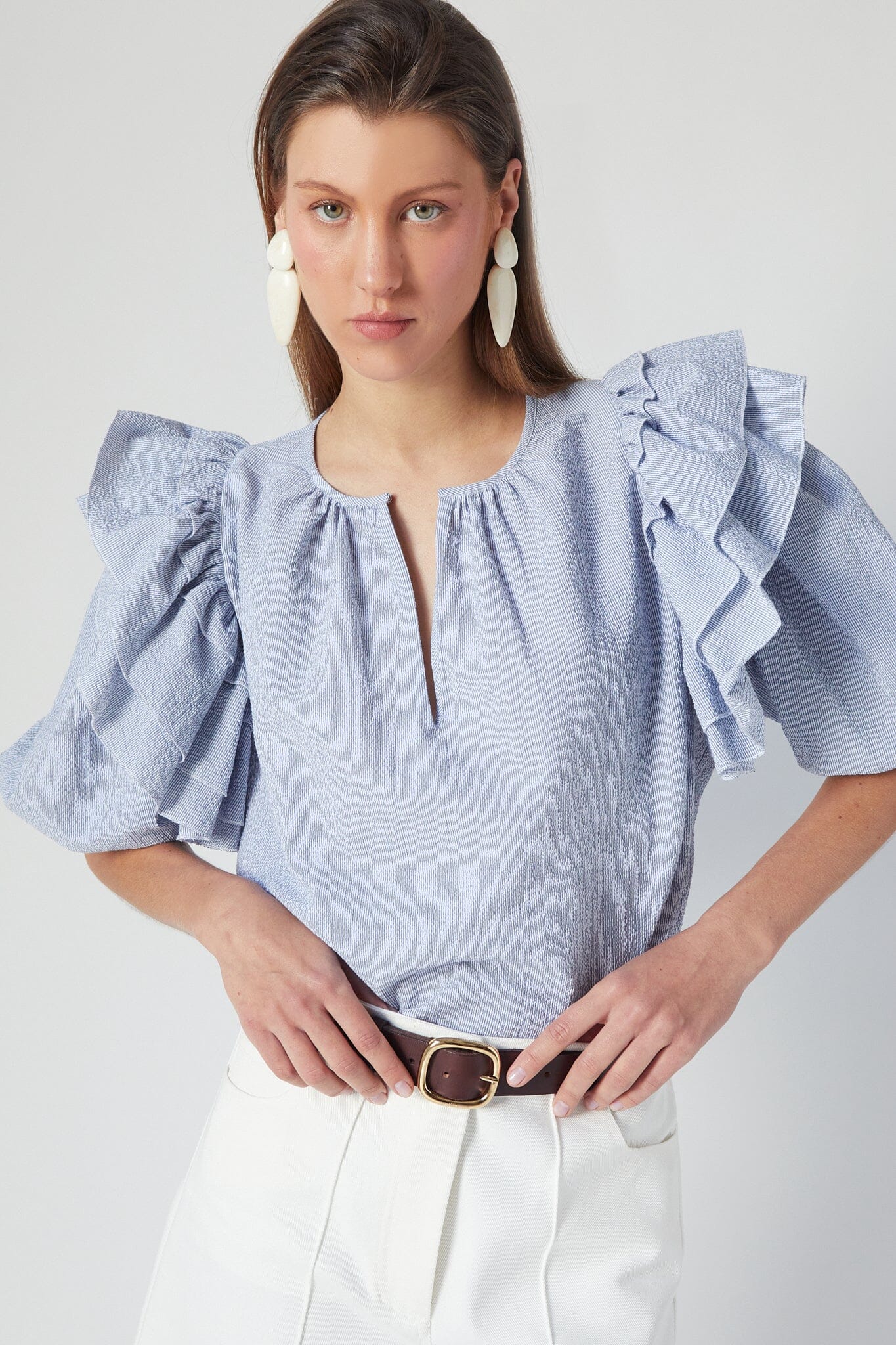 Our iconic Zoe Top comes with ruffles, puffed sleeves, elastic cuffs and front opening. This new version comes in a textured striped blue.